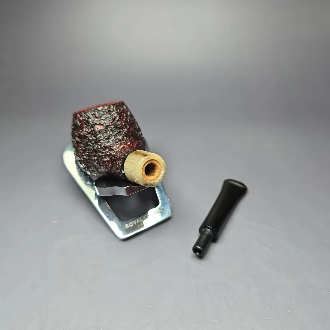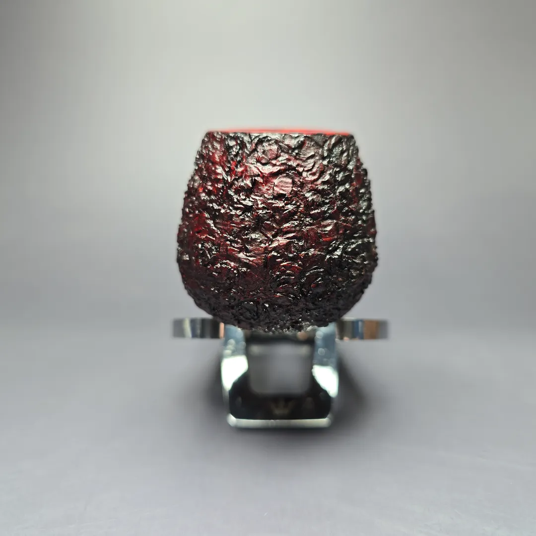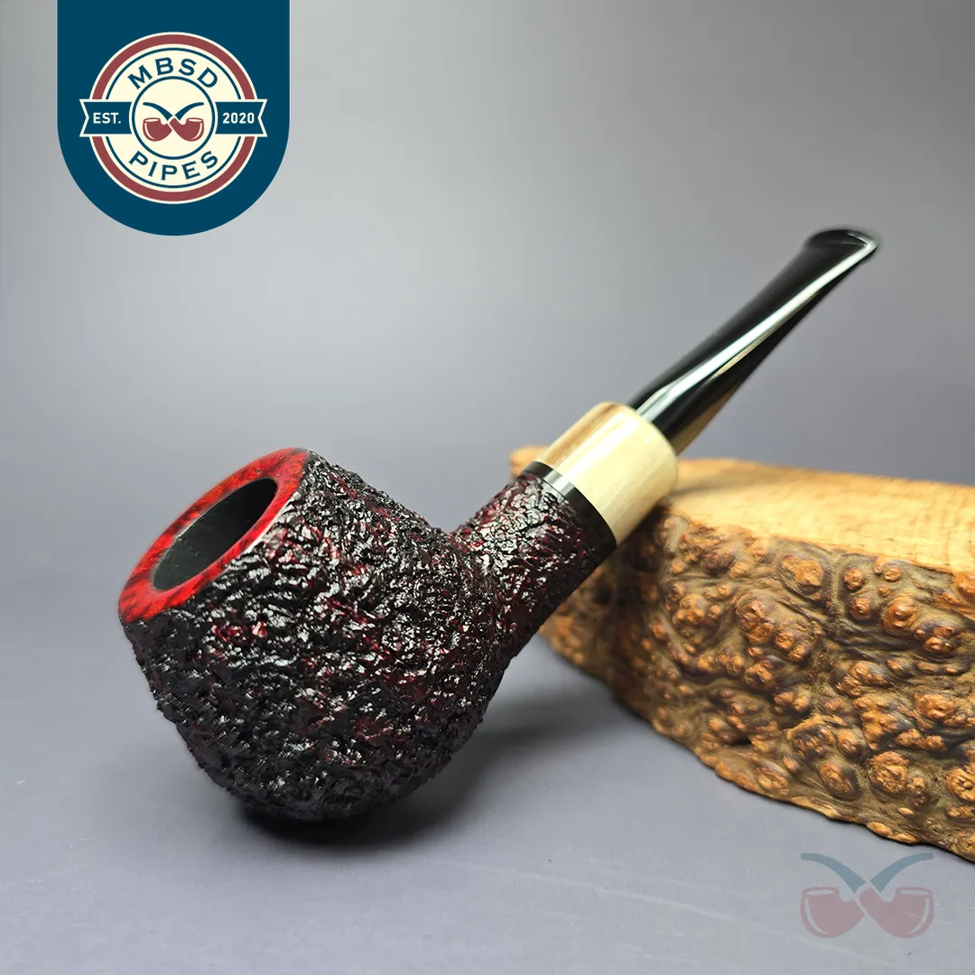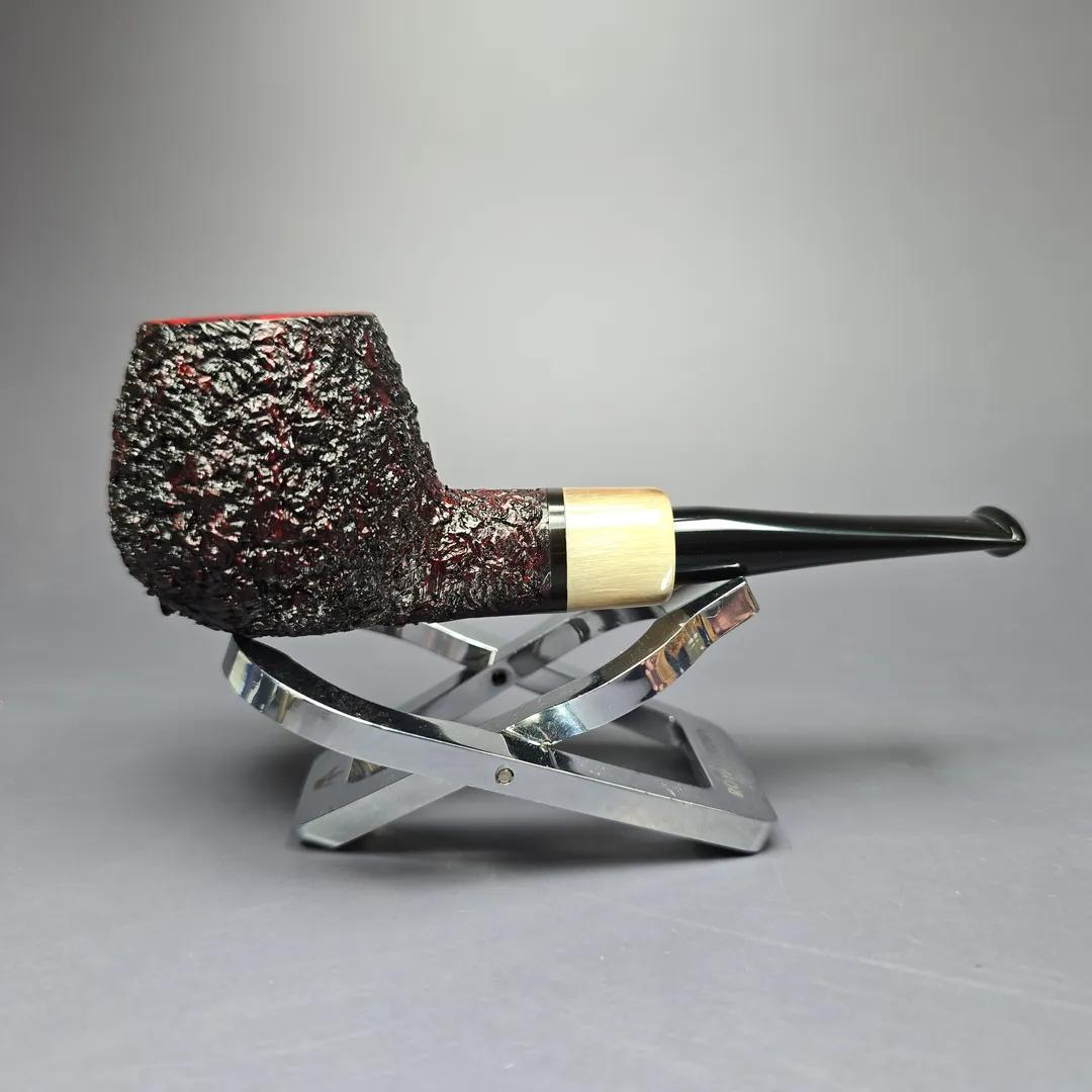 For a while in the 21st century, rustication appeared to be a lost art in the community of high-grade artisan pipes. There were a few exceptions, of course, especially in the school of pipe makers associated with Mike Butera, but they were exceptions nonetheless, rather than the rule. More recently, a variety of rustication styles have arisen, or been reborn, in artisan circles, proving once again that such finishes are not simply what one does to uncooperative briar. This pipe from Louisiana’s J. Mouton provides further proof against the latter’s assumptions, turning a plump Danish apple (very much in the vein of Former or Jess Chonowitsch) into something fresh and distinctive. Especially impressive is the reddish tint that Mouton’s managed to layer into the bowl’s otherwise near-black staining, something I haven’t seen done quite as well since Les and Dolly from Ferndown retired.