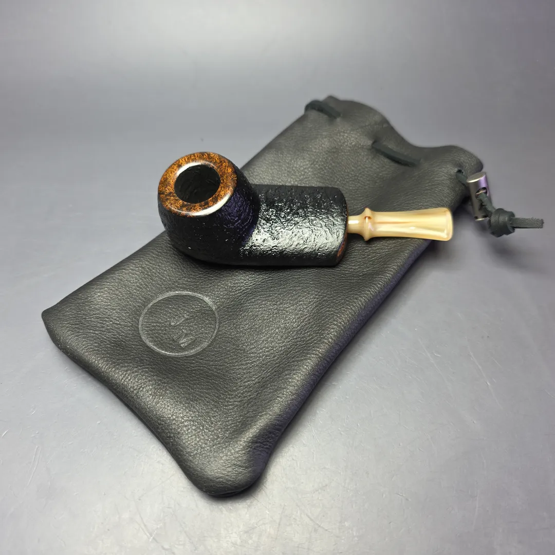 J. Mouton’s latest batch of pipes has been among the most diverse and experimental that we’ve had from the Louisiana artisan, though one motif connecting a good few of them has been the “wide shank.” Along with the wide shank bulldog and Rhodesian renditions included alongside it, this one is an usually broad-sided take on an otherwise very classic shape: the apple. Rather than take the more standard approach of a variation on Sixten Ivarsson’s Ukulele design, however, Mouton has added an extra layer of uniqueness to his squat, surfing sitter by way of a flared, push mouthpiece carved from animal horn, which slots neatly into a brass-stabilized ferrule.