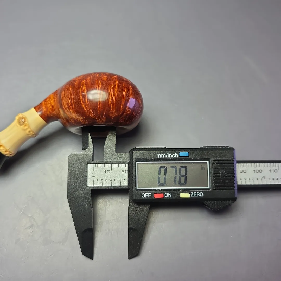 The advent of the “shape first, drill second” approach to pipe making in the post-war years, with its core preference for the sanding wheel over the traditional lathe, unlocked countless possibilities for novel pipe designs. One of the founding genres of this new approach was the “freehand” pipe which, as somewhat implied by its name, centered around decidedly freeform designs, emphasizing grain patterns over figure. Yet when people speak of “asymmetric,” or “asymmetrical,” pipes, it is rarely in reference to Preben Holm, or anyone associated with “freehand” pipes as the term is commonly understood, despite asymmetry being one of the few common, defining features of such pipes. Why would that be? Western aesthetic traditions have known the answer for centuries, and Eastern traditions have known it for millennia: because asymmetry, like many (or perhaps all) objects of experience, is understood in relation to its opposite, to symmetry. In other words, we notice asymmetry in a design relative to its underlying symmetry, which the former stands out against and subverts. In a “freehand” pipe, there is very little symmetry to speak of, and thus they are not seen as “asymmetric,” at least not in the same way as this pipe here, from Louisiana’s J. Mouton. At heart, it’s a tomato shape—a distinctly squat and low-slung rendition, but a tomato nonetheless. It is not the perfect, oblate spheroid typically characteristic of tomato shapes in pipes, neither in their traditional nor modern guises; likewise, its two-knuckle bamboo shank extension does not proceed along a perfectly straight line from the bowl to the mouthpiece. Both are deliberately warped ever so slightly, allowing them to subvert, but not completely deviate from, our expectations of form, which are themselves based in past experiences of similar shapes and from the ways the pipe itself leads us along.