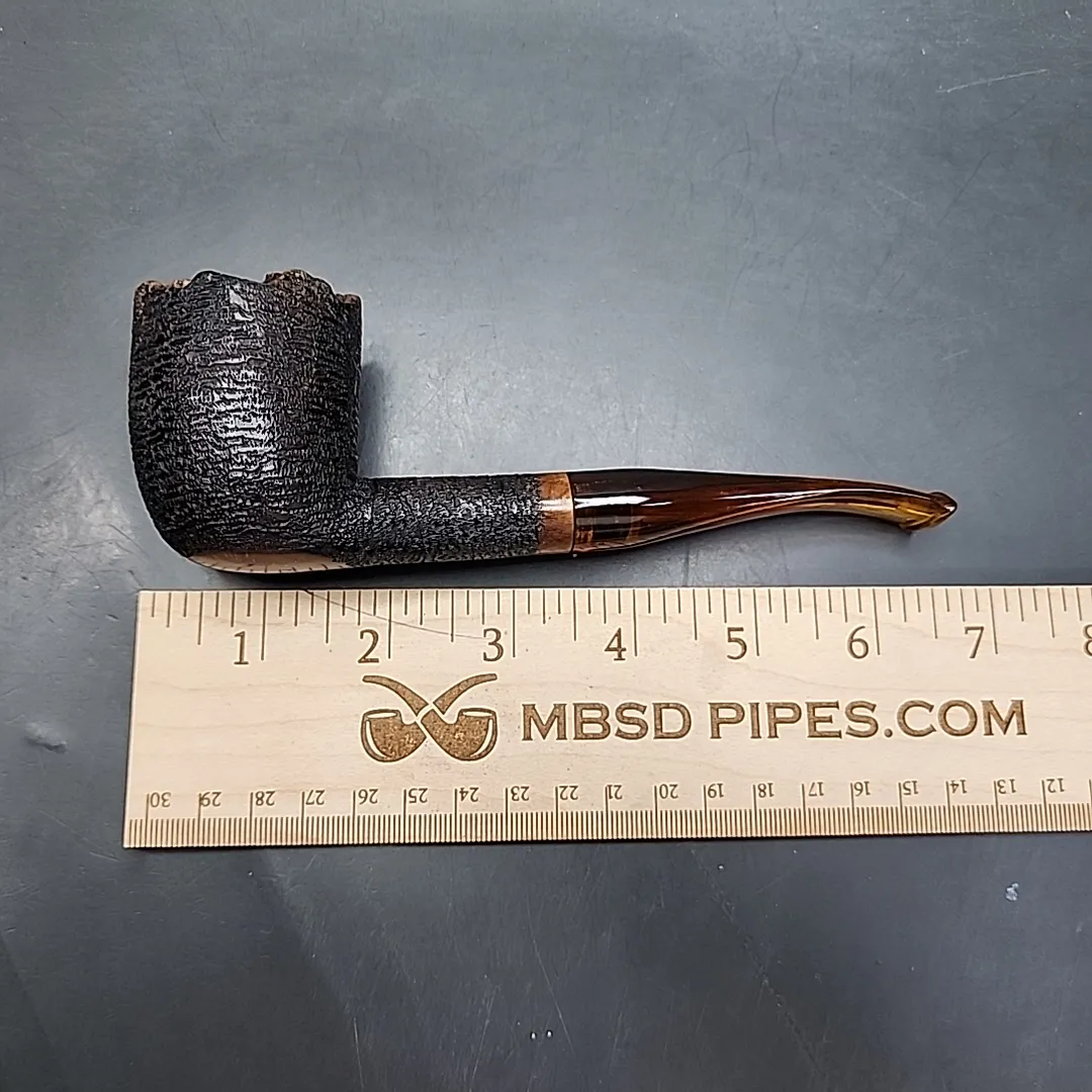 This is a pipe from fairly early on in Jack Howell’s pipe-making career, but that’s not to its detriment. I see a lot of parallels with the work of someone like Randy Wiley in this one, for example in its painstaking hand-rustication, which gives the appearance of somewhere between tree bark and a light sandblast. There’s also its bare plateau rim and its amber-toned acrylic stem, which similarly recall the great American freehand carvers and the directions they took their Danish inspiration in. It’s a large, tactile pipe, one that already shows Howell’s famed aesthetic and technical capabilities. Get it while you can – these pipes don’t hang around for long.
