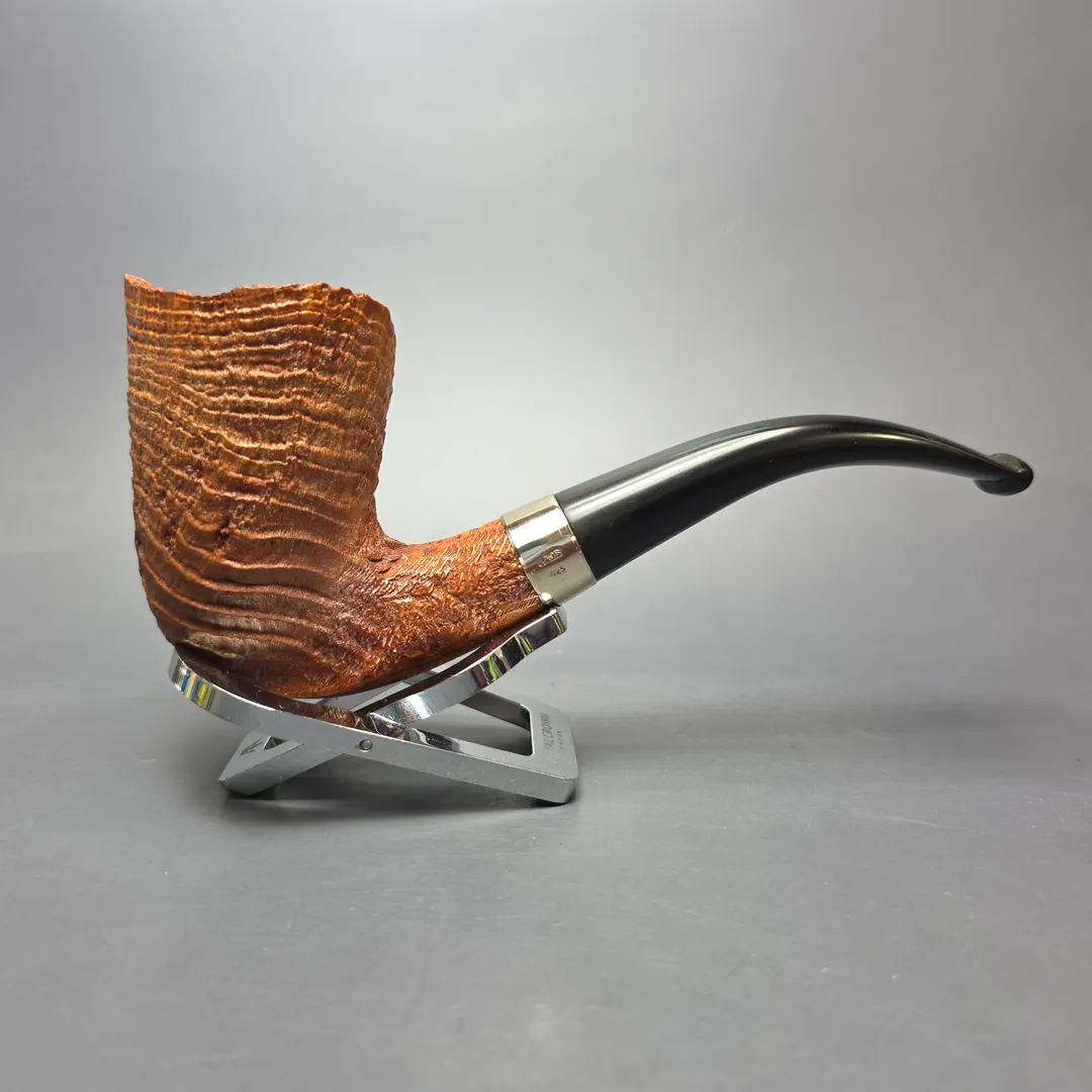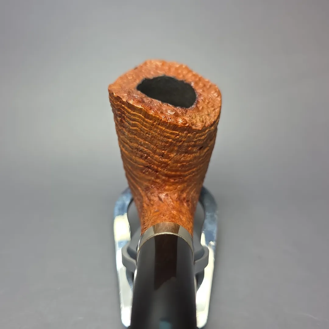 The “Bark” was, quite famously, a unique, rusticated finish used by Les Wood and Dolly Wood for the majority of their pipes. 90% of the pipes Les and Dolly made, whether they were for the Ferndown make, for their Elwood make in Germany, for the Astleys house brand in London, or for the James Barber house brand in Otley, were “Barked” in this manner. At a time when the notion of a high-grade rusticated finish was mostly confined to Italy (and, to an extent, America) this was very unusual, and yet it paid off, with the Ferndown Bark becoming immensely sought-after by casual pipe smokers and collectors alike. “Barking,” as Les and Dolly termed it, was done not with a hand tool, but with a split drill bit, creating a distinctly fine texture that is still sometimes mistaken for a sandblast finish, but most of the time, a Ferndown labeled as “sandblasted” will, in fact, have been rusticated instead. After all Les and Dolly did not have a sandblasting cabinet in the workshop adjoined to their home, out of which nearly all Ferndown pipes came. However, there are main two exceptions to this rule—one situated near the very beginnings of Les and Dolly’s career as independent pipe makers, and one right at the end. The latter was a collaboration between Les and Dolly and Canada’s Michael Parks, with Parks being sent unfinished Ferndowns from the English couple and sandblasting them. These pipes were called the Ferndown Bark Premier. The other exception is a little more complicated. While Les and Dolly’s home workshop did not have the tools for sandblasting Ferndown pipes, the workshops they had used prior to that point did. After Les left Dunhill, he established a workshop in London, which he shared with other ex-Dunhill craftsmen, including Bill Taylor, who was in the process of setting up his own pipe company, Ashton. Some time later, Les and Dolly moved to a workshop in Clavering, which they shared with a furniture company. It was in these two workshops that Les and Dolly first began manufacturing pipes of their own, and this was also where the “Bark” finish was born. However, the Bark was, originally, a sandblast finish. In fact, Les and Dolly were making the “Bark” line before they were making “Ferndown” pipes, as their venture went through a series of names before “Ferndown” was chosen. Prior to Ferndown, Les and Dolly made “Jacobean” pipes (which did not take off, in part because Americans had no idea how to pronounce the word); after Jacobean, the two made “Tudor” pipes (a brand name also subsequently dropped, but which lived on, at least partly, in the Ferndown Tudor Root line). At least as early as their Tudor make, Les and Dolly were creating sandblasted pipes under the name “Bark.” This continued after Ferndown replaced the Tudor make, though it presumably ended when a tragedy at the Clavering workshop meant that Les and Dolly could no longer operate there (as it happens, Les was using the workshop’s sandblasting cabinet when that tragic event occurred). Thankfully, Peter Wilson, of Duncan Briars, later taught Les and Dolly his own technique for rusticating a pipe in a way that was very similar to a sandblast finish, which Wilson generously gave his blessing for the two to use on Ferndown pipes. Thus the “Bark” was [re]born.