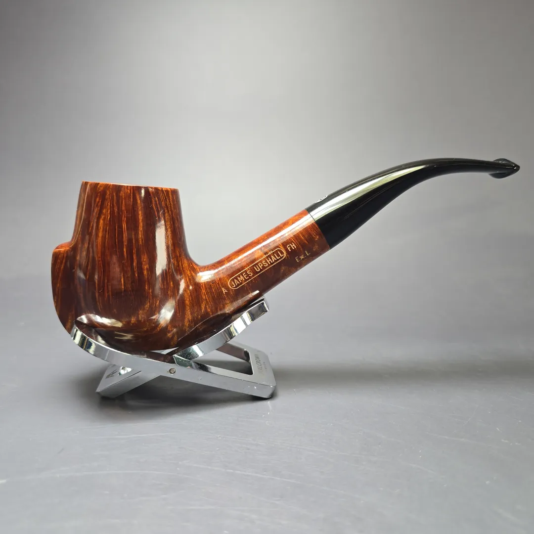 James Upshall was, along with Ferndown and Ashton, part of a new wave of British hand-made, high-grade pipes in the late 20th century, with their founders largely coming from previous positions in the factories of companies such as Dunhill and Charatan. James Upshall was founded in 1978 by Barry Jones and Ken Barnes, both of whom had previously worked for Charatan and who had worked their way up to being carvers Charatan’s higher-end, non-standard shapes. Jones and Barnes’ pipes quickly grew to being something of a status symbol, and were enjoyed by King Hussein of Jordan, Anwar Sadat, Bing Crosby, Yul Brynner, Robert Wagner and Tom Selleck. The company also made house-brand pipes for Astleys in London, along with many of the other major makes of the era. James Upshall pipes are no longer made, but their reputation as some of the finest hand-turned British pipes continues to endure.