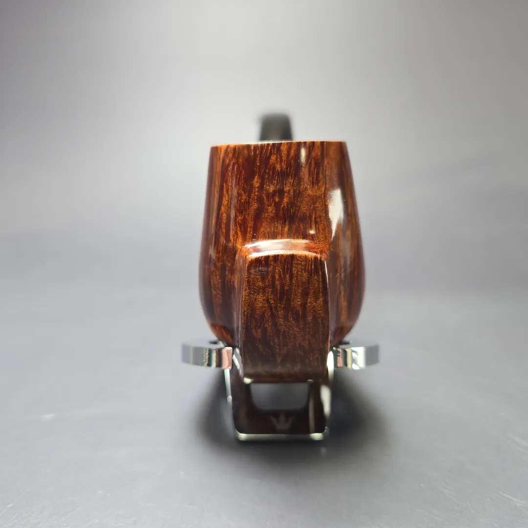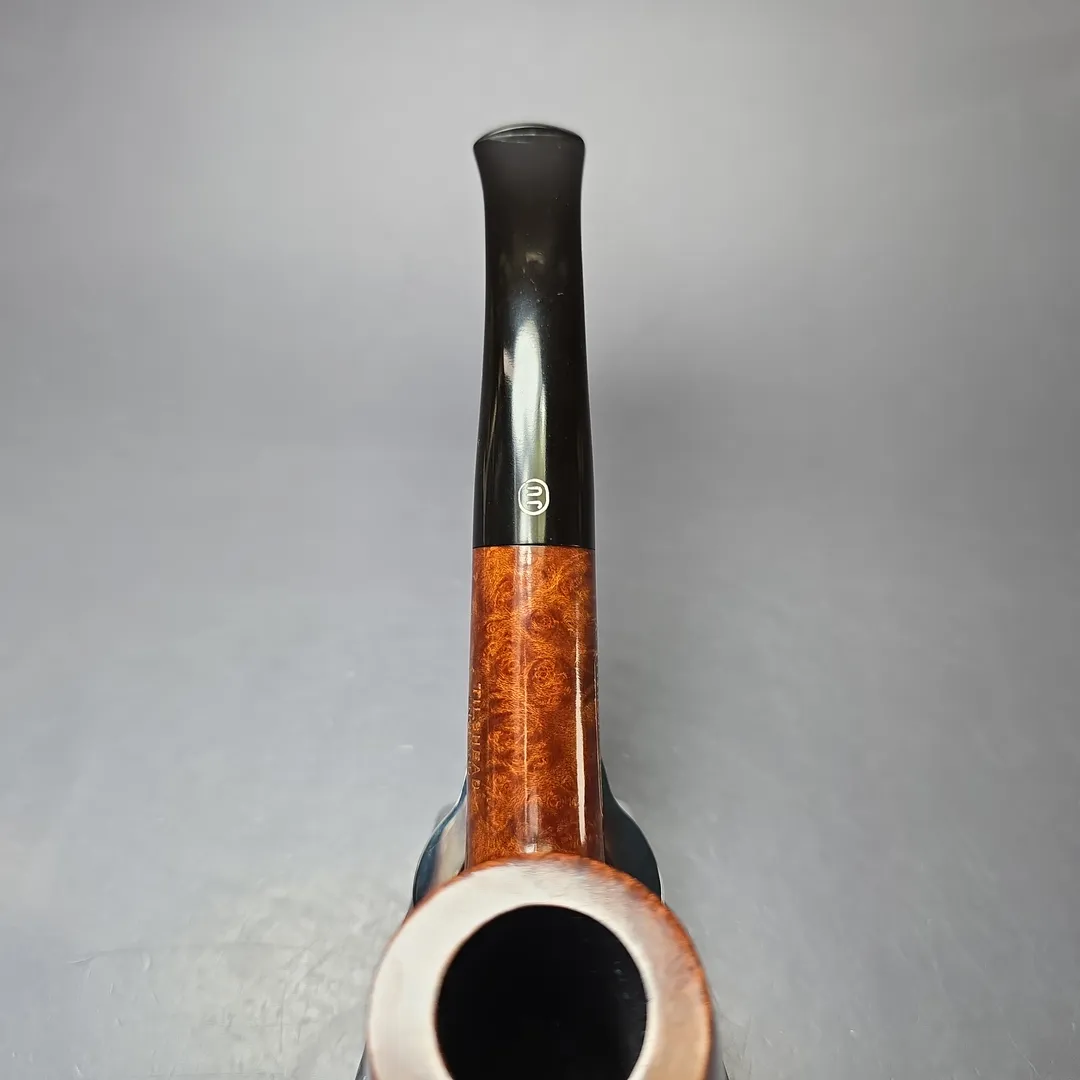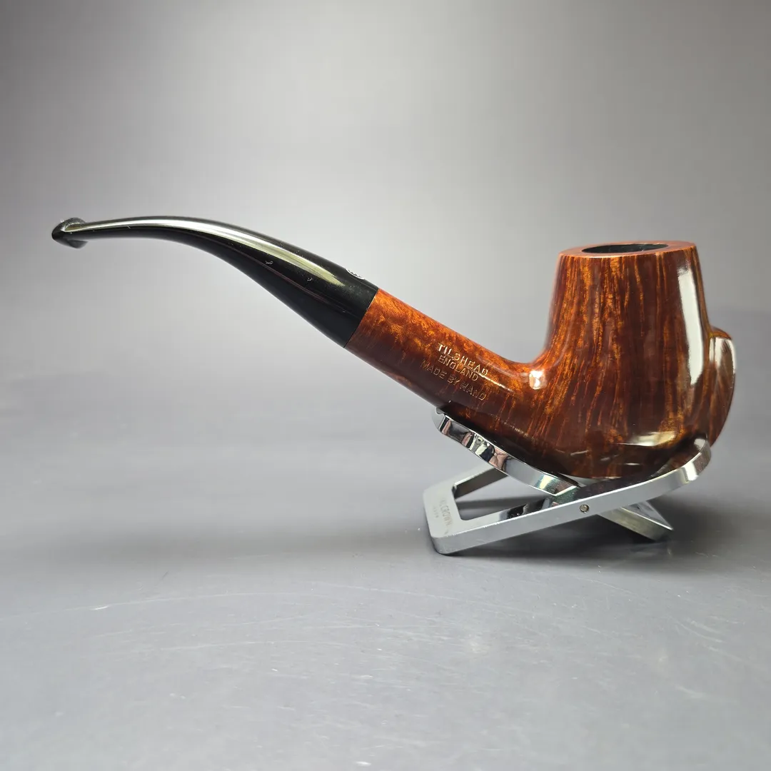 While all Charatan freehand pipes were unique, certain forms and motifs were used regularly—or, at least, periodically—in their designs. It was much the same with James Upshall pipes and, given that James Upshall grew out of Charatan, it was only natural that some of the forms and motifs commonly found in Charatan pipes would make their way into the Tilshead Pipe Company. For example, the Newmarket (technically an old Charatan catalog shape), the Countryman and the Cup and Saucer shapes were first nade at the Mansell Street factory in London, but would ultimately reappear in new guises at the workshop in Tilshead. This pipe, from the latter, is another example. Owing to its peculiar, paneled protrusion running underneath and to the front of the bowl, it is sometimes referred to as a “keel,” owing to its resemblance to the stabilizing fin found on the underside of a ship. In this case, the keel motif has been incorporated into a beautiful, Extra Large bent billiard, whose straight grain somehow manages to be even more striking than the form it resides in.