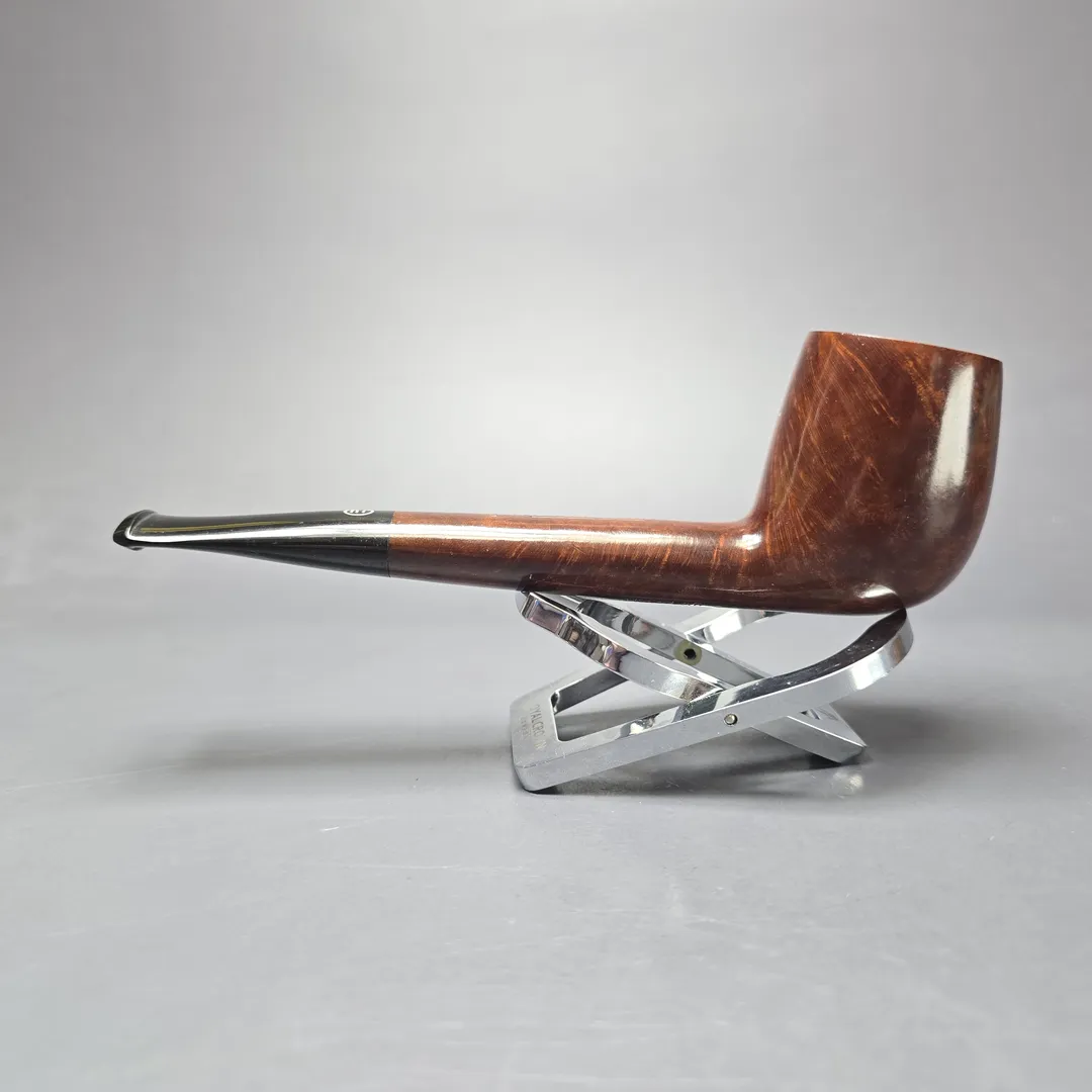 “Long shank” shapes held a special place at the Tilshead pipe company. One might assume that this was in part because its founders, Barry Jones and Ken Barnes, had cut their teeth at Charatan, where such shapes and motifs featured prominently in both its catalog and freehand output (especially during the Lane era). Other reasons were more explicit; for Barnes, at least, long shank shapes like the Canadian were simply his favorite. Whatever the exact cause, its certain that there were plenty of very fine Canadian, lumberman, Liverpool, Newmarket, and, as seen here, Lovat renditions made under the James Upshall name. This James Upshall, for example is a very traditional Canadian rendition, right down to its distinct forward cant and its reserved, chestnut dress.