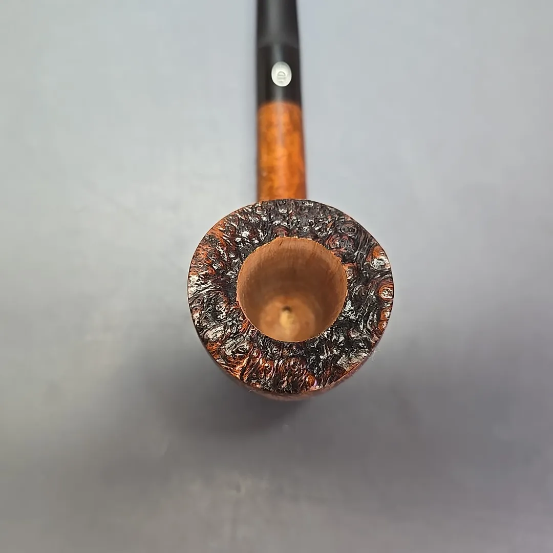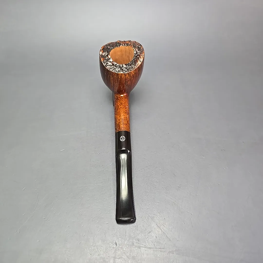 James Upshall’s size system can appear a little odd at times. Since pipes were grouped into sizes based primarily on bowl height, it is not entirely uncommon to come across one that, for all intents and purposes, is an an extra large pipe, without being an Extra Large (or “Ex.L”) size. This is especially the case for the workshop’s group “6” size pipes, as James Upshall’s pipes were already rather large compared to its late 20th century English contemporaries, such as those of Comoy’s, Dunhill, or GBD. This “A” grade is an example of a group 6, and it is certainly a big pipe. Very much in keeping with the English freehand tradition, it presents itself as a long, “footed” Dublin, to the extent that it borders on a cavalier of sorts (though sans the reservoir and plug typical of its historical progenitors). This curious arrangement of form allows the bowl to have been shaped in a fuller, more rounded manner, which has worked wonders as far as expressing its natural, straight grain patterning. Slightly less “English” is the inclusion of live plateaux edge at the bowl’s rim, adding an enjoyable dash of the rustic to an otherwise highly elegant figure.