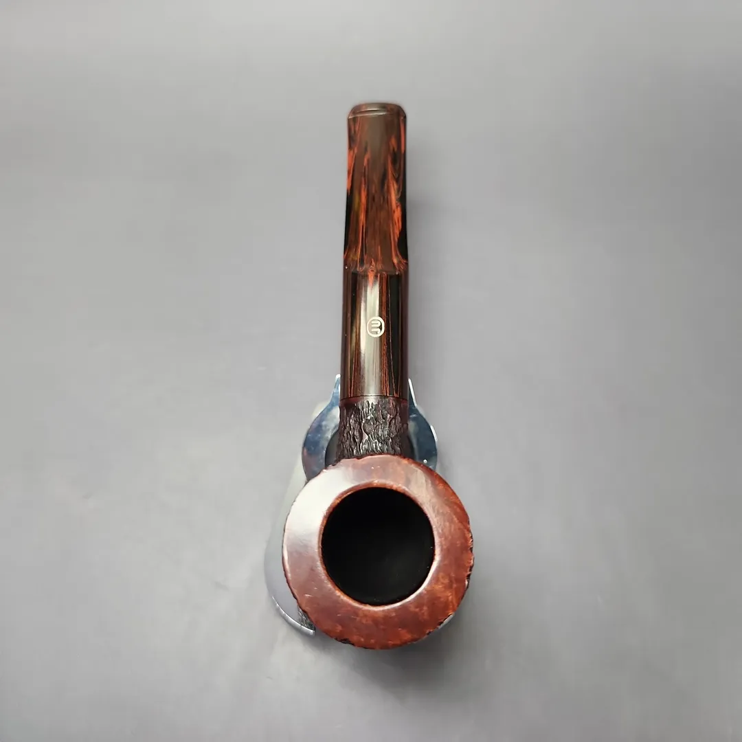 When James Upshall was founded, the company (Tilshead Pipe Co.) only sold smooth pipes. But, in the later decades of the 20th century, a strong case was being made by other English workshops, such as Ashton and Ferndown, that there was nothing stopping a sandblasted or a rusticated pipe from being handmade and high-grade—though in the case of the latter, this was something the Italians had known for even longer. The James Upshall Bark finish followed in this vein, and was often curiously similar to Ferndown’s finish of the same name. Given that Les Wood and Barry Jones were good friends (and still are, last I checked), I have wondered if something of the Woods’ approach to finishing rubbed off on Jones. This one is an extra large, partially “Barked” poker, and has the rare addition of a hand-cut cumberland stem, rather than the standard vulcanite. Cumberland too was a later addition to James Upshall’s catalog, though it came with a significant premium.