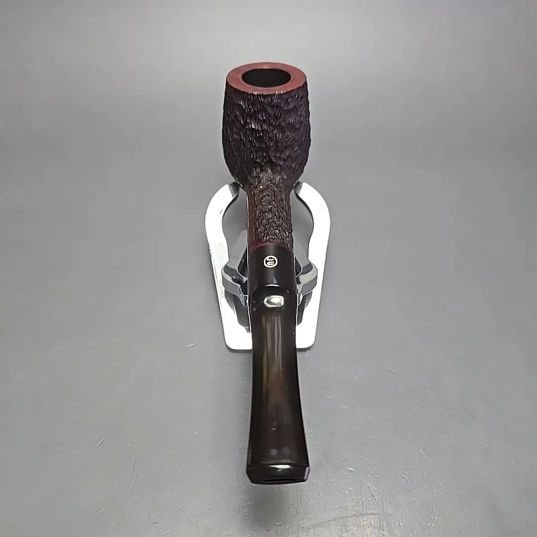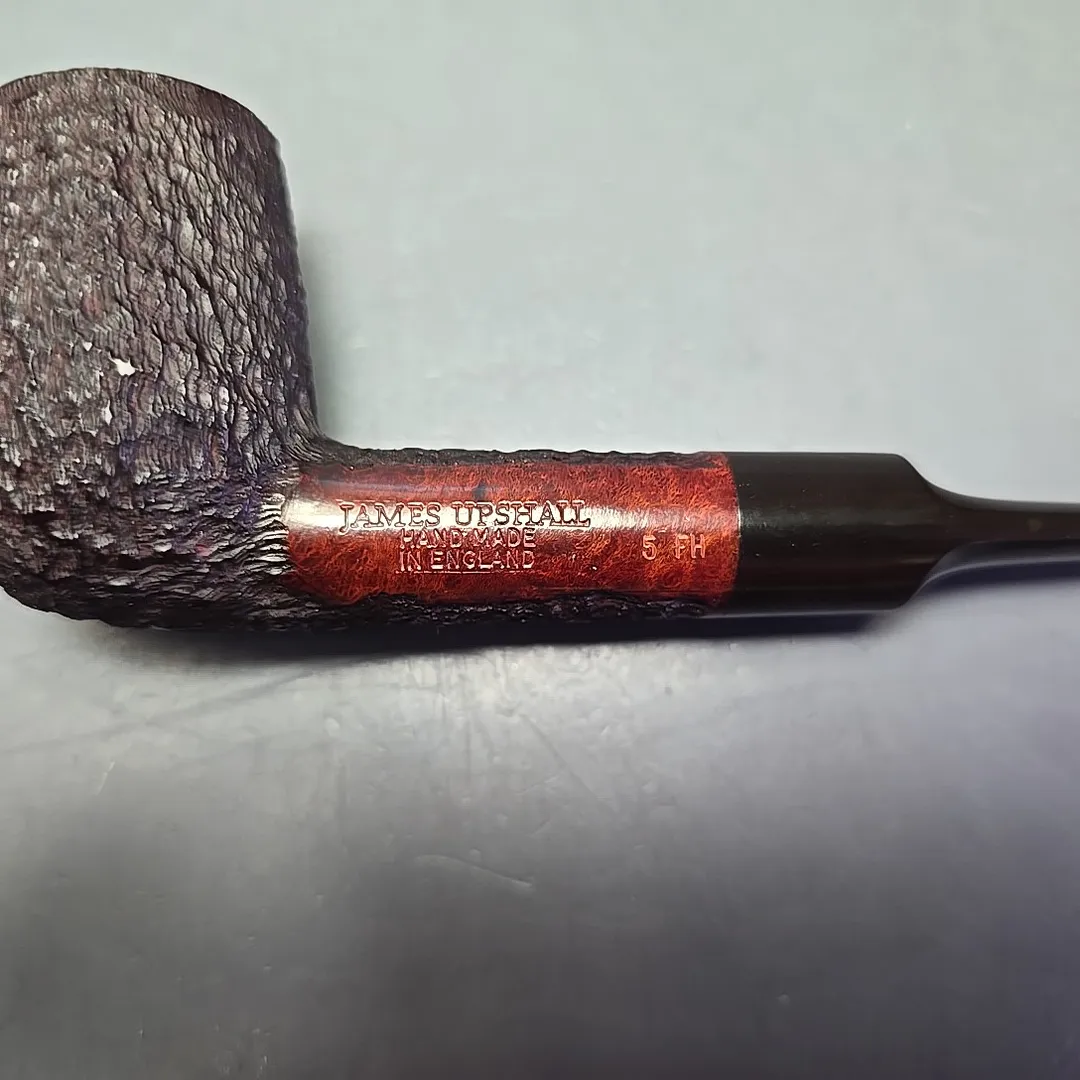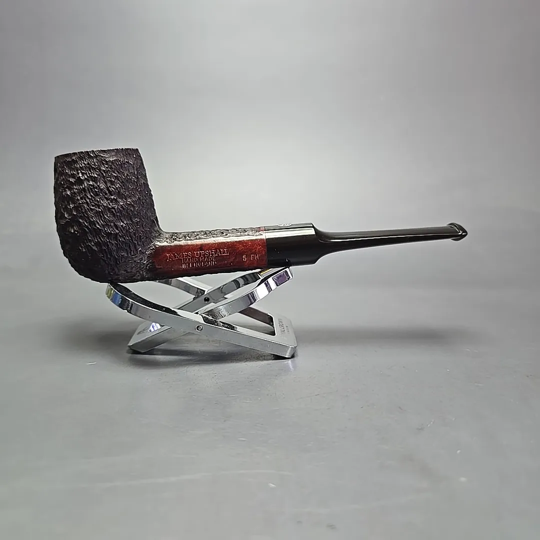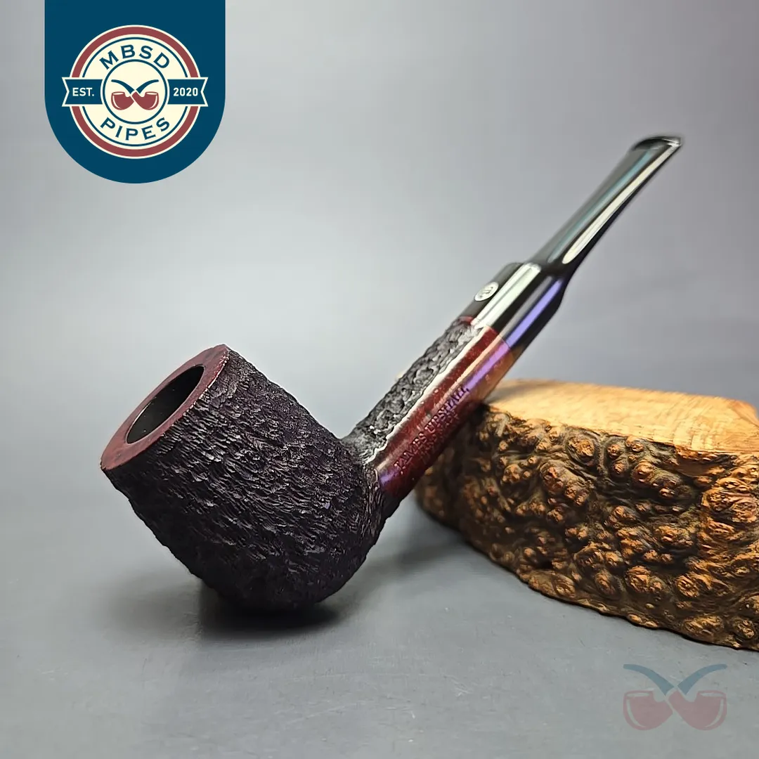 When James Upshall was founded, the company (Tilshead Pipe Co.) only sold smooth pipes. But, in the later decades of the 20th century, a strong case was being made by other English workshops, such as Ashton and Ferndown, that there was nothing stopping a sandblasted or a rusticated pipe from being handmade and high-grade—though in the case of the latter, this was something the Italians had known for even longer. The first rusticated James Upshall pipes were introduced around 1987, per Ken Barnes, and were carved in a pebble-dash manner not unlike high-grade Italian pipes (using techniques purportedly learned from the Ser Jacopo workshop). Within a few years, however, the finish had changed and received a formal name, the “Bark.” James Upshall pipes were now rusticated in a more “English” manner, and were in fact curiously similar to Ferndown’s finish of the same name. Given that Les Wood and Barry Jones were good friends (and still are, last I checked), I have wondered if something of the Woods’ approach to finishing rubbed off on Jones.