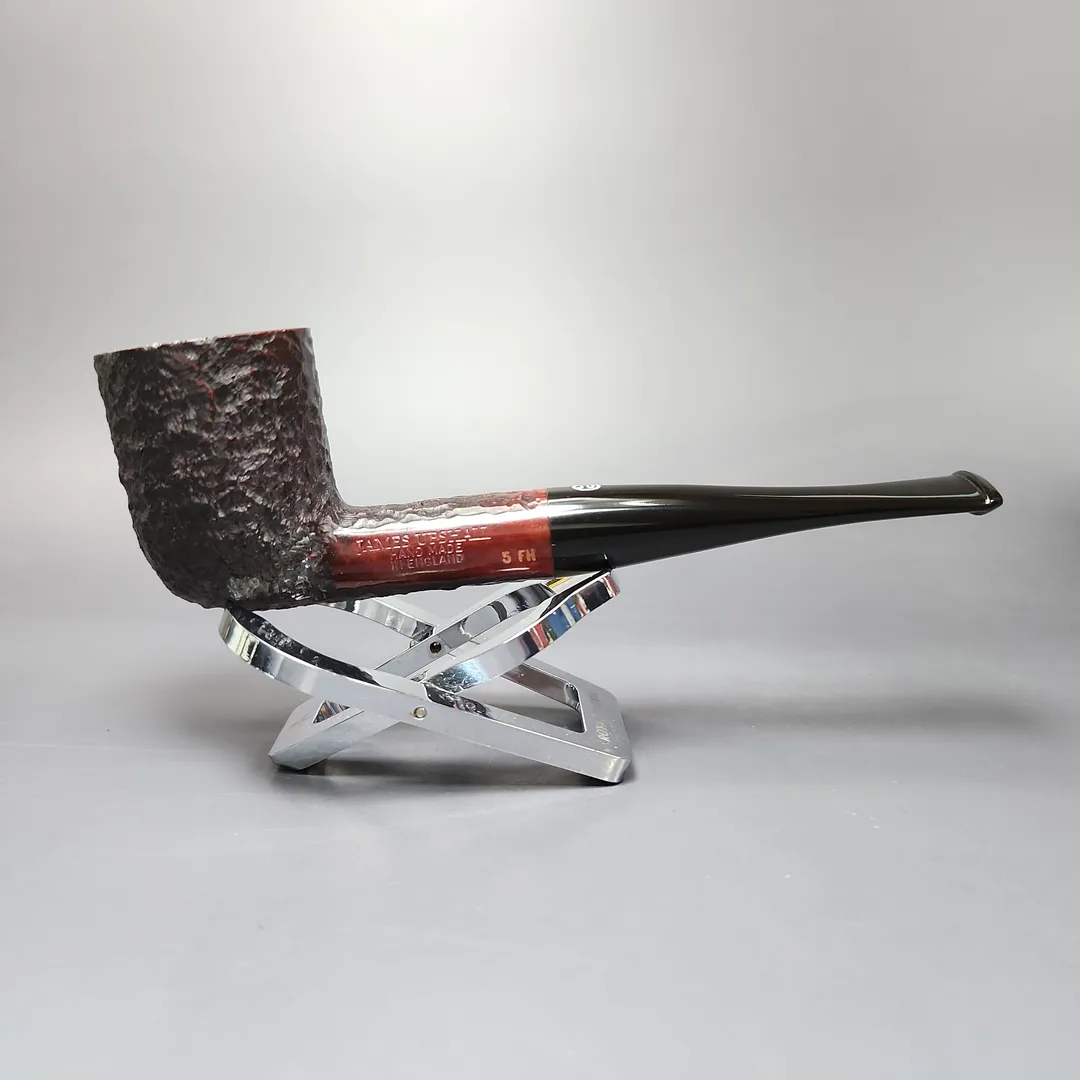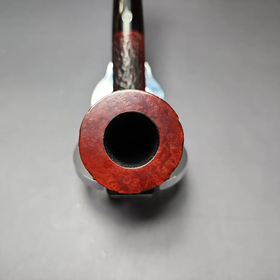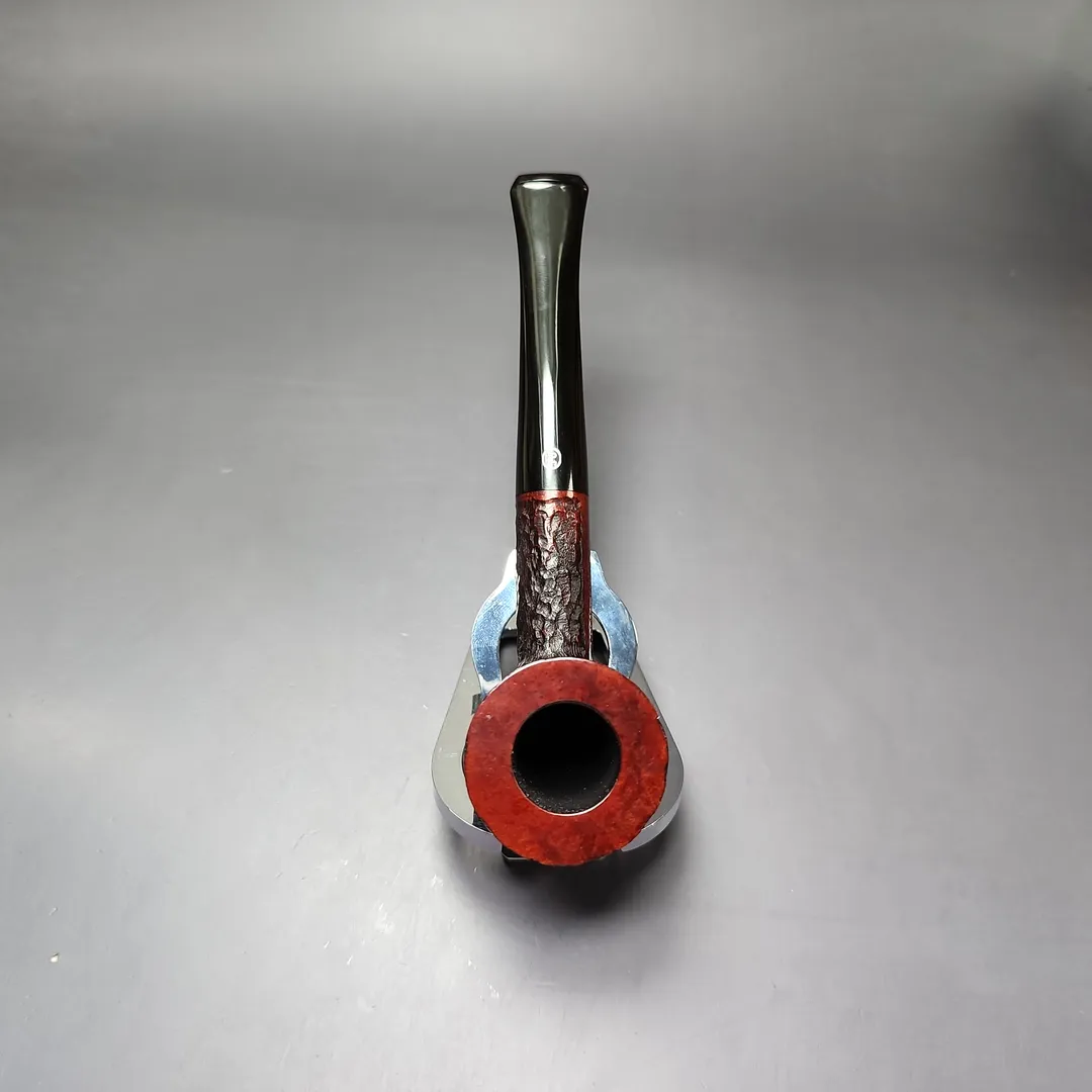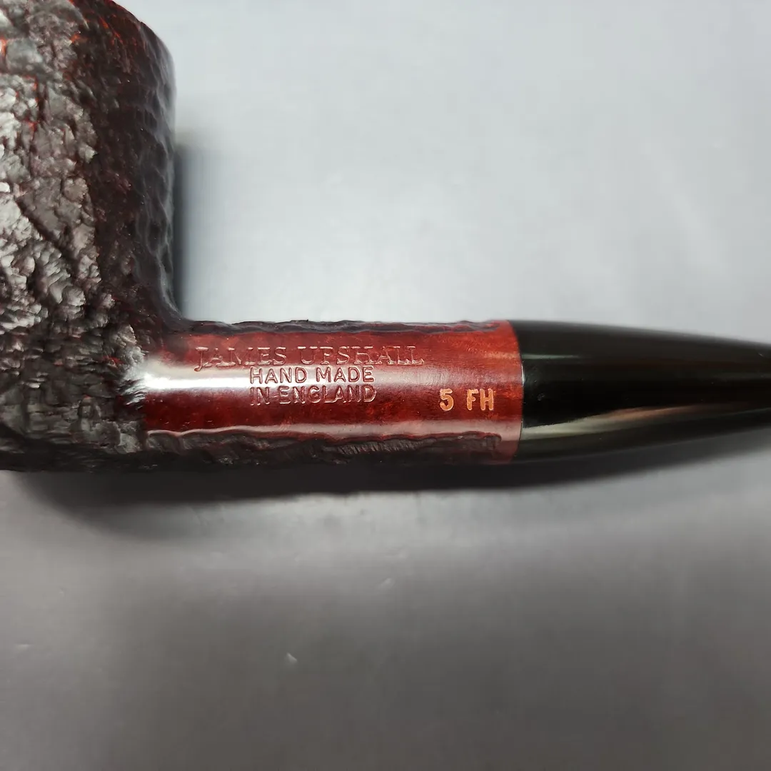 When James Upshall was founded, the company (Tilshead Pipe Co.) only sold smooth pipes. But, in the later decades of the 20th century, a strong case was being made by other English workshops, such as Ashton and Ferndown, that there was nothing stopping a sandblasted or a rusticated pipe from being handmade and high-grade—though in the case of the latter, this was something the Italians had known for even longer. The James Upshall Bark finish followed in this vein, and was often curiously similar to Ferndown’s finish of the same name. Given that Les Wood and Barry Jones were good friends (and still are, last I checked), I have wondered if something of the Woods’ approach to finishing rubbed off on Jones. Shaping, on the other hand, was something Jones had his own approach to, with this one being much more reminiscent of the Dublin shapes he cut his teeth on working under Reuben Charatan.