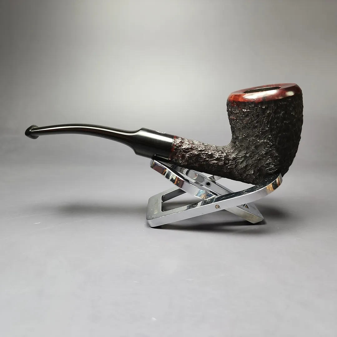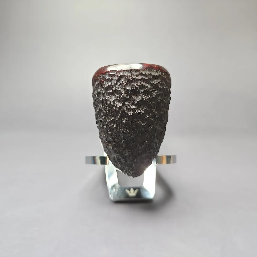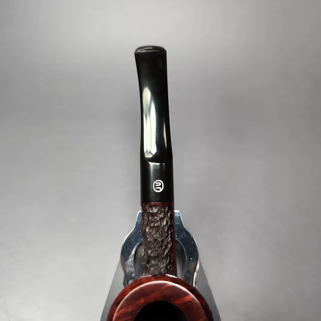 When James Upshall was founded, the company (Tilshead Pipe Co.) only sold smooth pipes. But, in the later decades of the 20th century, a strong case was being made by other English workshops, such as Ashton and Ferndown, that there was nothing stopping a sandblasted or a rusticated pipe from being handmade and high-grade—though in the case of the latter, this was something the Italians had known for even longer. The James Upshall Bark finish followed in this vein, and was often curiously similar to Ferndown’s finish of the same name. Given that Les Wood and Barry Jones were good friends (and still are, last I checked), I have wondered if something of the Woods’ approach to finishing rubbed off on Jones. This one is an especially well finished piece, with a texture somewhere the Italian and British styles of rustication. Taking the form of a tall Dublin, the pipe’s rim has this time been left smooth, allowing its deep burgundy sheen to contrast marvelously with the charcoal hues of the rest of the bowl.
