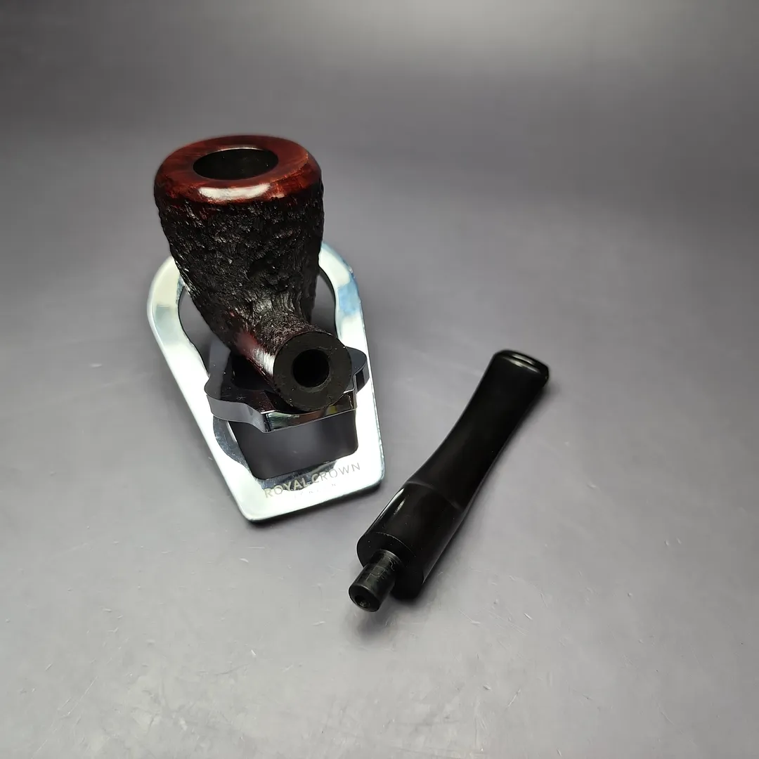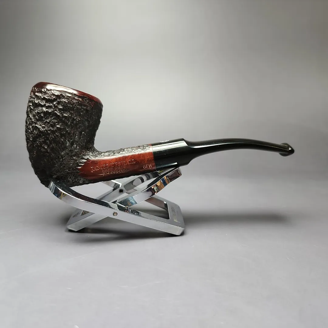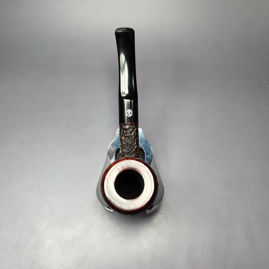 When James Upshall was founded, the company (Tilshead Pipe Co.) only sold smooth pipes. But, in the later decades of the 20th century, a strong case was being made by other English workshops, such as Ashton and Ferndown, that there was nothing stopping a sandblasted or a rusticated pipe from being handmade and high-grade—though in the case of the latter, this was something the Italians had known for even longer. The James Upshall Bark finish followed in this vein, and was often curiously similar to Ferndown’s finish of the same name. Given that Les Wood and Barry Jones were good friends (and still are, last I checked), I have wondered if something of the Woods’ approach to finishing rubbed off on Jones. This one is an especially well finished piece, with a texture somewhere the Italian and British styles of rustication. Taking the form of a tall Dublin, the pipe’s rim has this time been left smooth, allowing its deep burgundy sheen to contrast marvelously with the charcoal hues of the rest of the bowl.