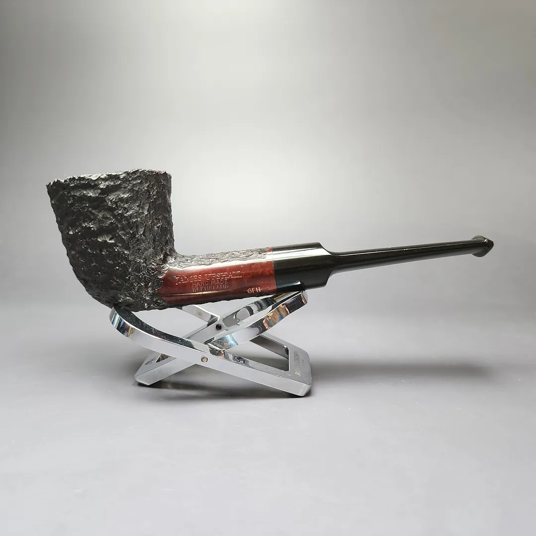 When James Upshall was founded, the company (Tilshead Pipe Co.) only sold smooth pipes. But, in the later decades of the 20th century, a strong case was being made by other English workshops, such as Ashton and Ferndown, that there was nothing stopping a sandblasted or a rusticated pipe from being handmade and high-grade—though in the case of the latter, this was something the Italians had known for even longer. The James Upshall Bark finish followed in this vein, and was often curiously similar to Ferndown’s finish of the same name. Given that Les Wood and Barry Jones were good friends (and still are, last I checked), I have wondered if something of the Woods’ approach to finishing rubbed off on Jones. Shaping, on the other hand, was something Jones had his own approach to, with this one being much more reminiscent of the bell Dublin shapes he cut his teeth on working under Reuben Charatan.