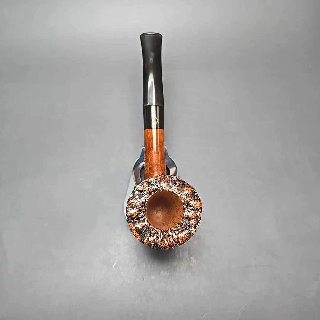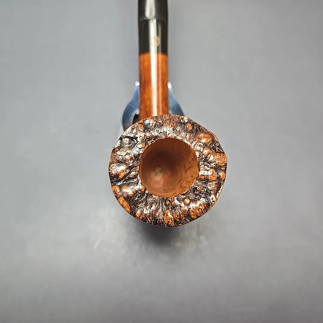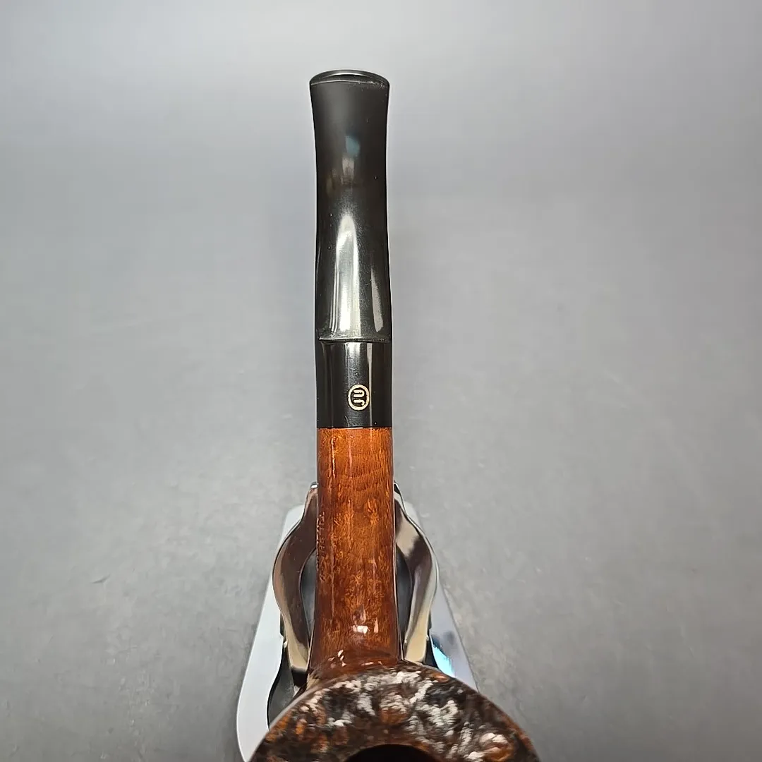 The “E” grade was the third-highest attainable by James Upshall pipes, beaten only by the extremely rare “X” grade and the practically mythical “XX”. It was, per Ken Barnes, his and Jones’s attempt to match the quality of the Charatan Coronation grade, which is ambitious to say the very least. In the case of this E grade James Upshall, the Charatan connection goes a little deeper than mere straight grain quality, however (though the grain is indeed very good). English freehand pipes all but began at F. Charatan & Son, and they were typically quite different from their Danish counterparts, having their own identity and their own assortment of signature motifs. As for the latter, two motifs were particularly prominent at Charatan and, naturally, they were prominent at James Upshall, too. One was the “cup and saucer,” and the other was the cavalier. The former came about when a young Barry Jones was tinkering with a heavily flawed stummel from a Charatan “Giant Bent” shape during his lunch break, sloughing off the pits from the bowl to see if he could salvage it, resulting in a shape with a distinct, slightly flattened, protruding base, upon which the remainder of the bowl appeared to “sit” like a mug of tea on a plate; the latter was a briar re-imagining of pre-briar hunters’ pipes, with a long, over-extended shank and a bowl that jutted out of it about 3/4 of the way down. One might say that this James Upshall is somewhere in between those two shapes, having reined in the pipe’s base in length and breadth, but retaining enough to still give that hallmark sense of separation between it and the Dublin bowl springing forth from it.