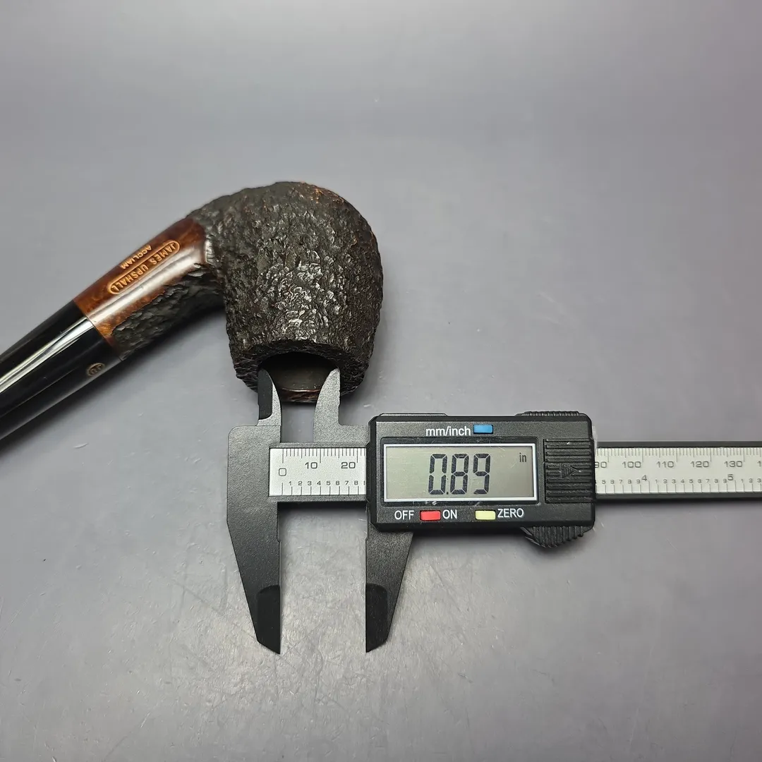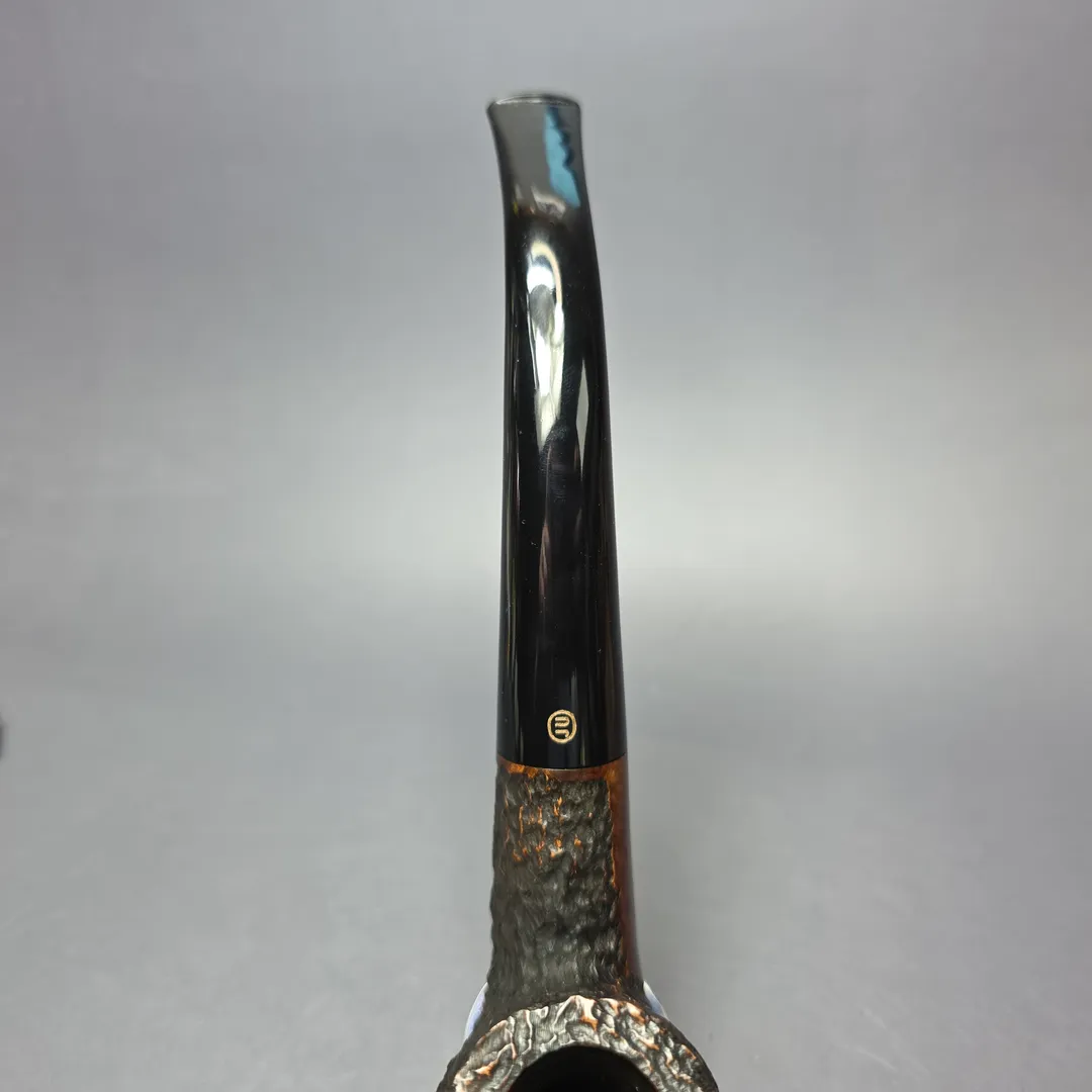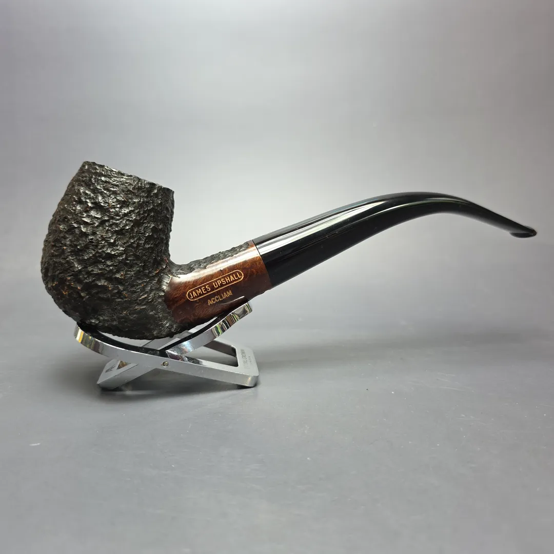 The James Upshall grading scheme is a little complicated, in part because some grades were named after places (i.e., the Tilshead), some using letters (e.g., S, G, E), some simply using descriptors for the finish used (e.g., Bark, Sandblast, etc.), and some using words that evoked, variously, things like history and excellence (e.g., Executive, Old England etc.) This would be an example of the latter, an Acclaim grade, which fell under the umbrella of James Upshall’s Empire Series. The Empire Series was exclusively for magnum-sized pipes, and were furthermore exemplars for the mastery of the workshop’s craftsmanship. This necessitated so much time and energy per pipe, as well as the large, consistently high-quality blocks of briar needed to make them, that production was extremely limited. Typically, customers could not simply buy an Empire Series pipe, but would have to sign up for a waitlist just to get one. This one is a huge, swan neck bent billiard, assumedly Barry Jones’s rendition of one of the various early Dunhill magnums, or perhaps even an “LC”. Rather than a more typical sandblast, however, this magnum wears a rather jagged, rusticated finish. This was not uncommon for James Upshall pipes. In fact, the first rusticated James Upshall pipes were introduced around 1987, per Ken Barnes, and were carved in a pebble-dash manner not unlike high-grade Italian pipes (using techniques purportedly learned from the Ser Jacopo workshop). Within a few years, however, the finish had changed and received a formal name, the “Bark.” James Upshall pipes were now rusticated in a more “English” manner, and were in fact curiously similar to Ferndown’s finish of the same name. Given that Les Wood and Barry Jones were good friends (and still are, last I checked), I have wondered if something of the Woods’ approach to finishing rubbed off on Jones.