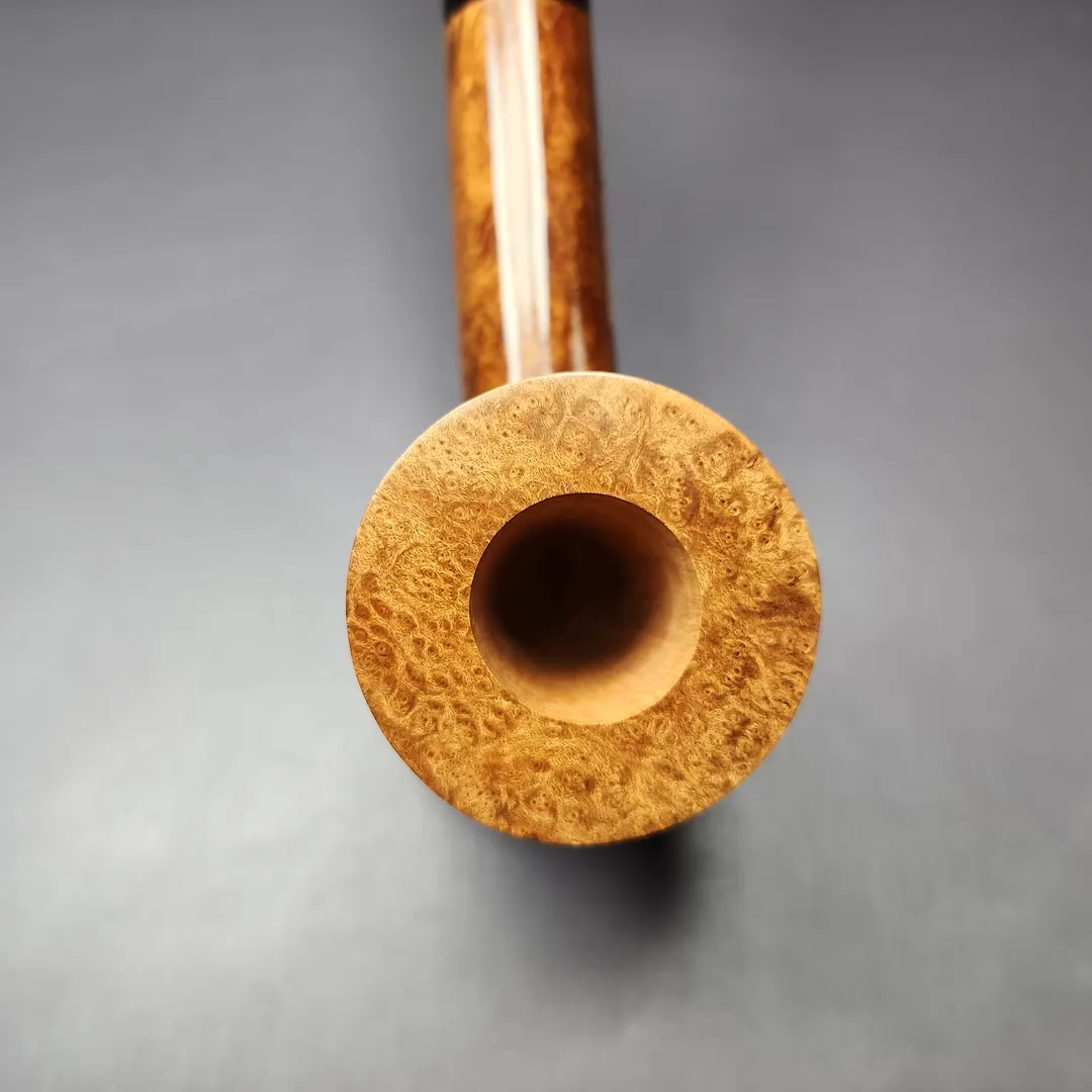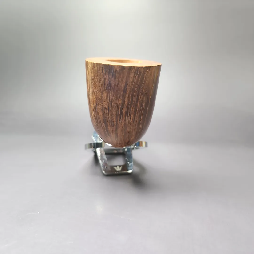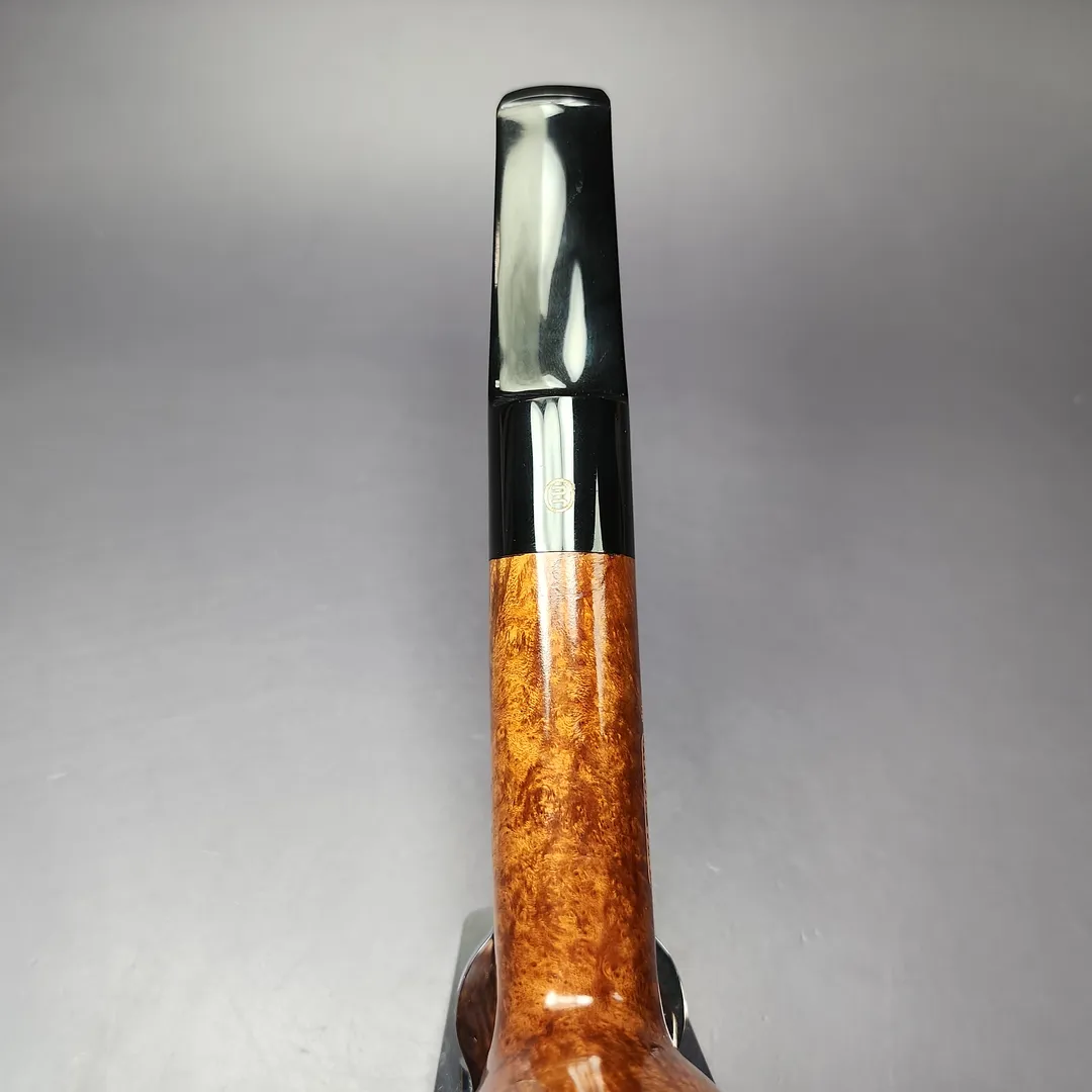 Similarly to their contemporaries at Ashton and Ferndown, James Upshall pipes were, on average, larger than traditional Anglo-French factory pipes. Even larger still were James Upshall’s magnum-sized pipes, known as the Empire Series. The Empire Series was exclusively for such magnums, and were furthermore exemplars for the mastery of the workshop’s craftsmen when it came to shaping and to chasing the finest grain patterns around. This necessitated so much time and energy per pipe, as well as the large, consistently high-quality blocks of briar needed to make them, that production was extremely limited. The Old England, as seen here, was essentially a super-sized P grade, whose graining was accentuated by a contrast stain inspired by the old Charatan Perfection line. This one is a very large, short-stemmed Dublin, also much in the vein of the Charatan freehands Barry Jones turned during the Reuben and Lane eras. Its bowl is, as one would expect, lined with 360 degrees of straight grain and topped with a halo of bird’s-eye.