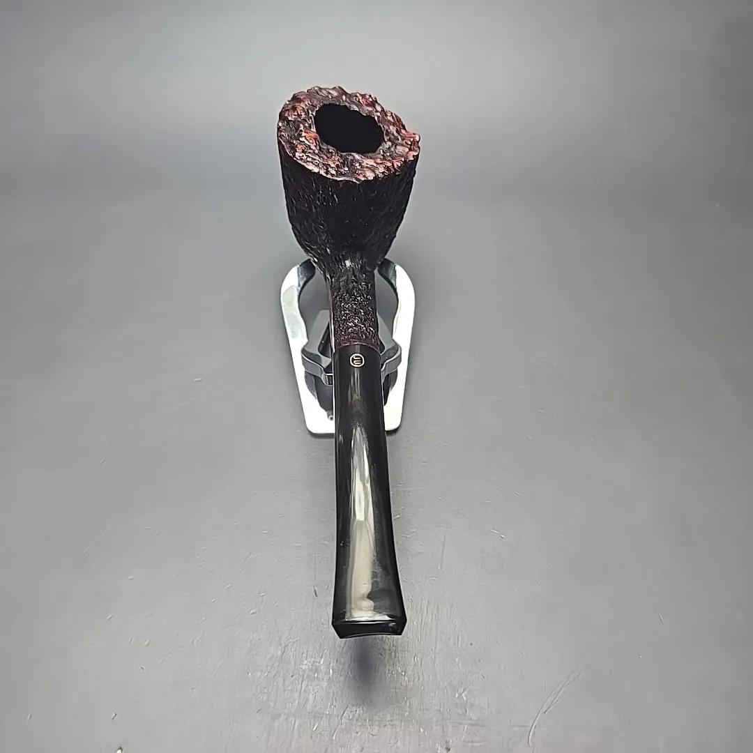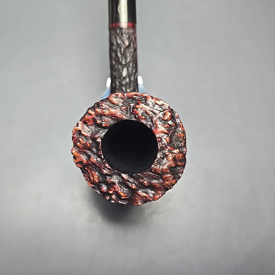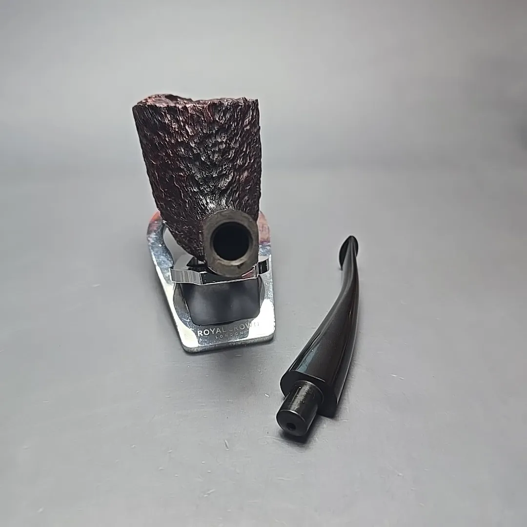 Each entry in the Empire Series corresponded to one of the grades or finishes in the Tilshead workshop’s typical output, with the Acclaim being a super-sized Bark (though some sandblasted pipes also fell under the same title). The Bark itself is quite interesting, having been conceived during the 1980s after Ken Barnes and Barry Jones visited the high-grade workshops of Italy and took a liking to their rusticated pipes. Upon returning, the pair started making a few pipes carved in the quintessentially Italian pebble-dash style from time to time. In time, however, the James Upshall approach to rustication moved closer toward a more “English” style, as seen here. The “Bark” thus became a micro-rusticated, red-tinted burgundy finish, not unlike that of Ferndown. Given that both Ken Barnes and Barry Jones were good friends with Les Wood, who was one half of the Ferndown duo, I have wondered in the past whether Les might have been something of an influence in that regard.