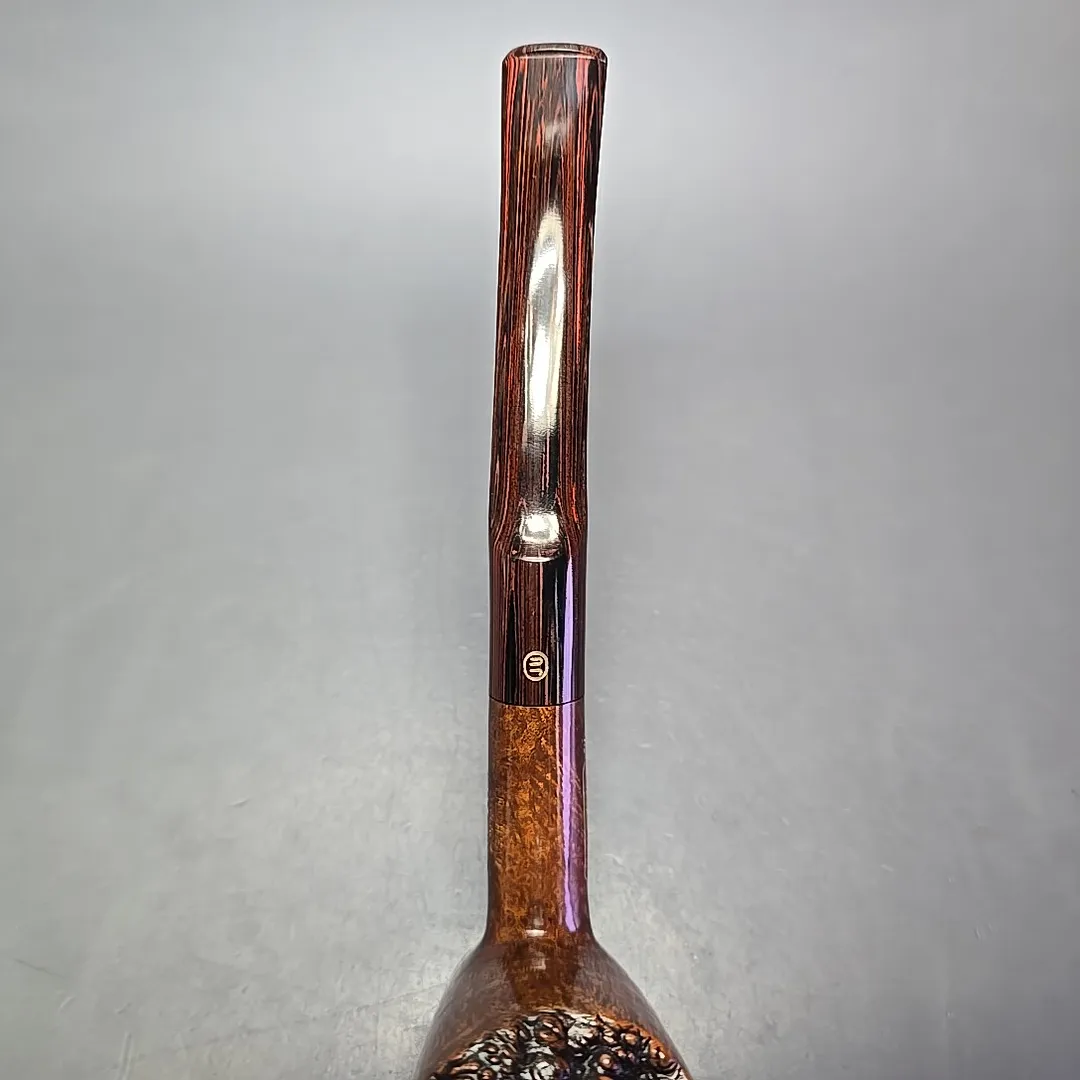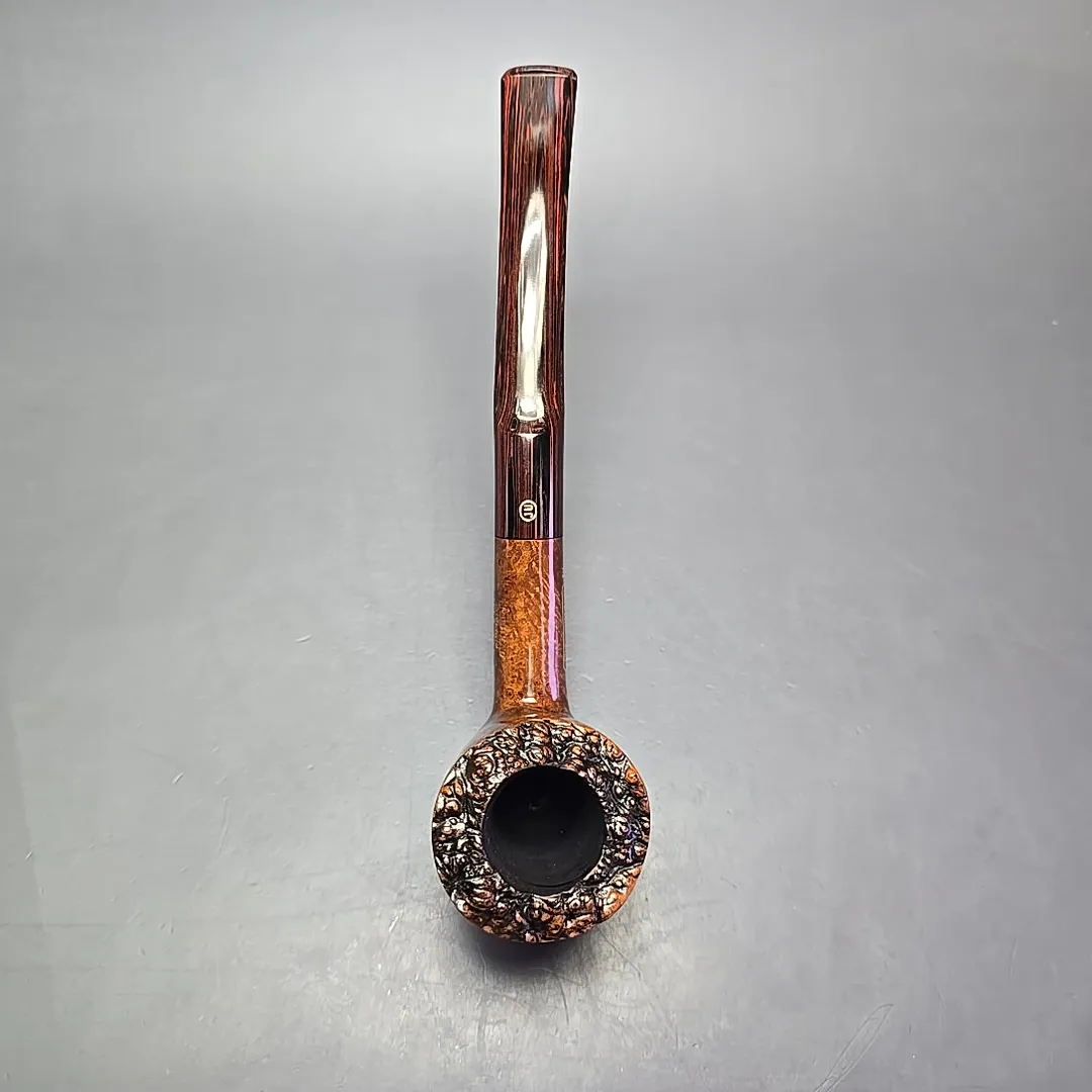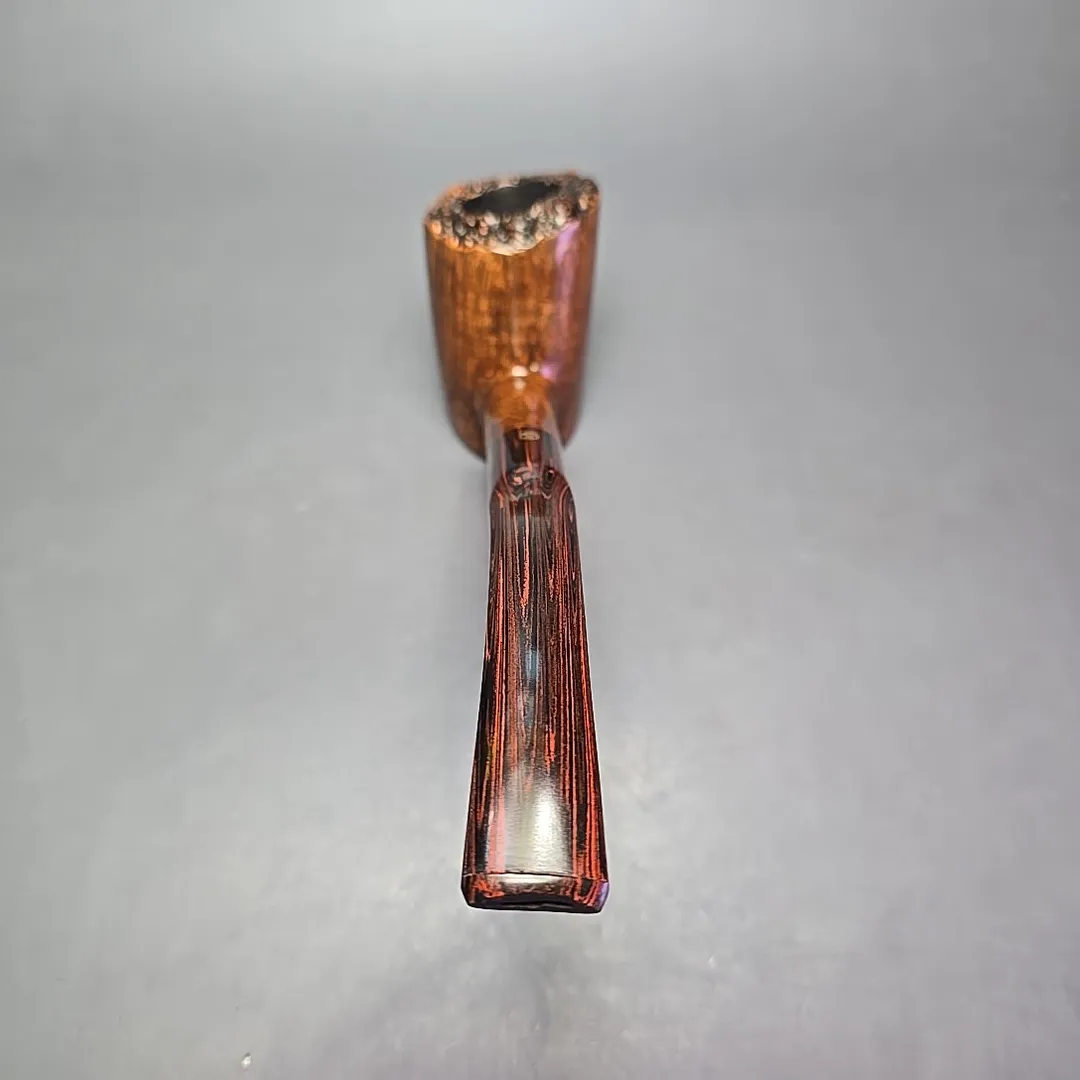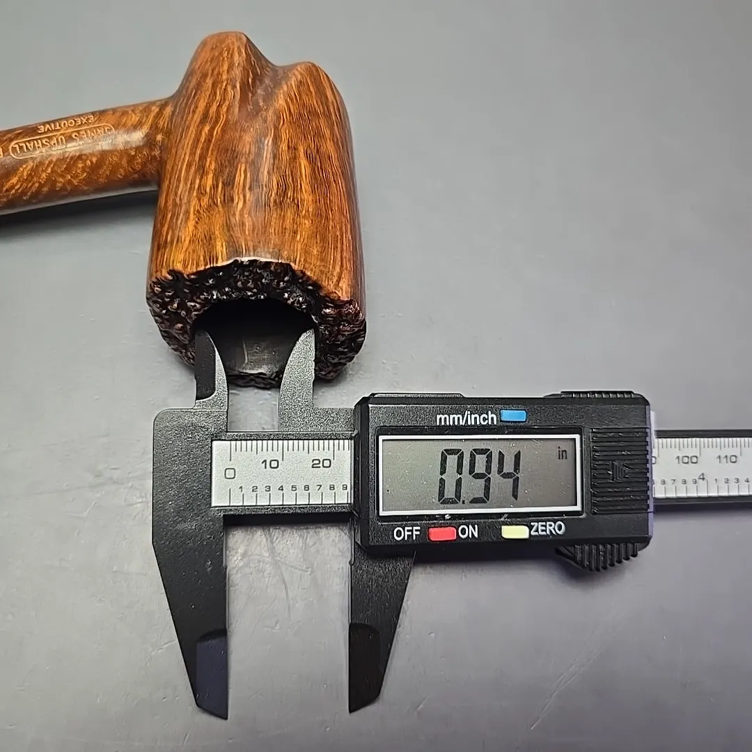 While the “Executive” was a grade originally used by Charatan for their high-end straight grain pipes, the James Upshall workshop also employed the Executive as a grade for their own pipes. This makes plenty of sense given that James Upshall’s founders all started out their careers in pipe making at Charatan during the Reuben and Lane years. The similarities don’t end there, though. James Upshall’s Executive belonged to the workshop’s “Empire Series”, reserved for magnum-sized pipes. Each Empire grade corresponded with one of the grades used for standard-sized pipes. The Empire “Tradition” was a magnum “A” grade, “Old England” was a magnum “P,” and the Executive was a magnum “B.” James Upshall’s B grades were, according to Kennedy Barnes, roughly equivalent to Charatan’s “Executive” as far as quality went, so a James Upshall Executive could reasonably be considered equivalent to a Charatan Executive Extra Large grade—or, perhaps more accurately, a Charatan Executive Extra, Extra Large, as the Empire series often dwarfed even Charatan’s oversized freehand pipes. On the other hand, one notable difference between this exceptionally large, plateaux-topped cherrywood sitter and a Charatan is that the latter did not include an option for hand-cut cumberland stems, whereas James Upshall pipes, like this one, occasionally did—though this did come at a premium.