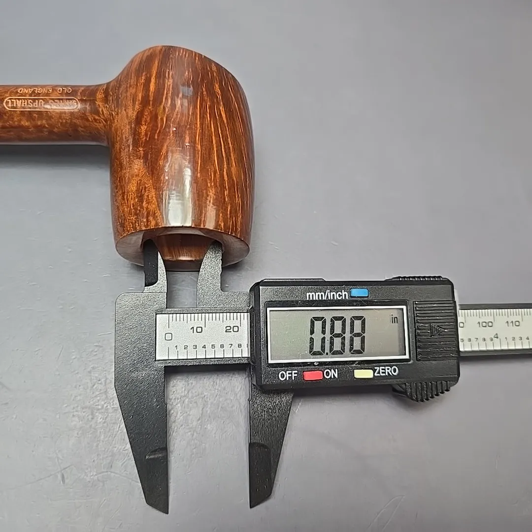 Like with James Upshall’s other pipes, the Empire Series was divided into grades, which also corresponded with the grades used for their standard-sized counterparts. The Old England, seen here, was essentially a super-sized P grade, whose graining was accentuated by a contrast stain inspired by the old Charatan Perfection line. In this instance, that took the form of a highly unorthodox, long-stemmed poker rendition, almost as if Barry Jones—the workshop’s chief carver—was going for a magnum rendition of a Peterson Speciality Tankard. Similarly interesting is the material used for the pipe’s mouthpiece, which happens to be made from cumberland. While the majority of James Upshall pipes featured vulcanite mouthpieces, a small number were fitted using hand-cut cumberland rod—albeit with a significant premium attached.