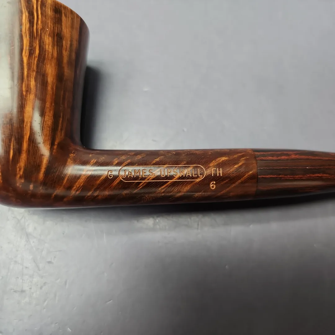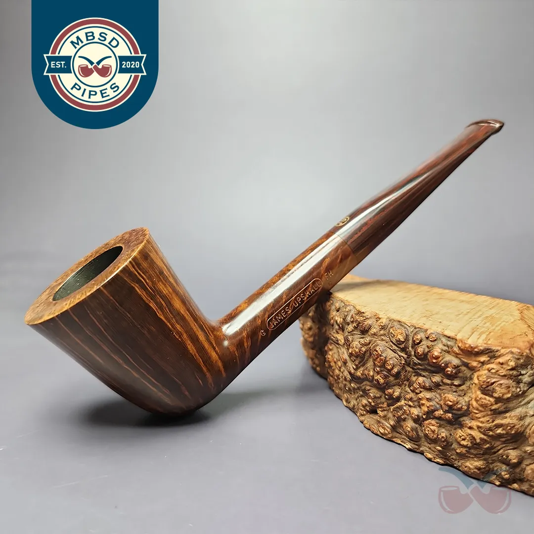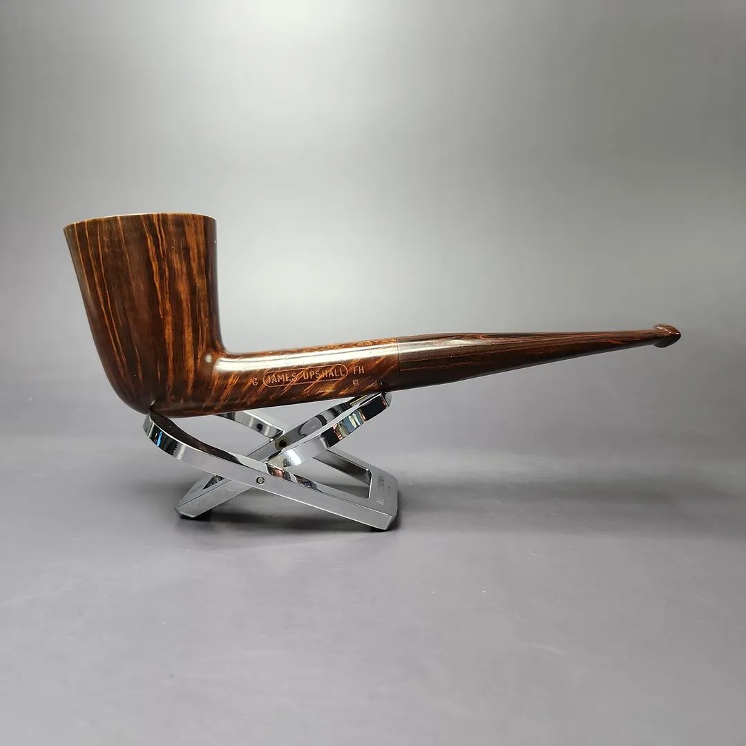 James Upshall was, along with Ferndown and Ashton, part of a new wave of British hand-made, high-grade pipes in the late 20th century, with their founders largely coming from previous positions in the factories of companies such as Dunhill and Charatan. James Upshall was founded in 1978 by Barry Jones and Ken Barnes, both of whom had previously worked for Charatan and who had worked their way up to being carvers Charatan’s higher-end, non-standard shapes. Jones and Barnes’ pipes quickly grew to being something of a status symbol, and were enjoyed by King Hussein of Jordan, Anwar Sadat, Bing Crosby, Yul Brynner, Robert Wagner and Tom Selleck. The company also made house-brand pipes for Astleys in London. Sadly, James Upshall pipes are no longer made, but their reputation as some of the finest hand-turned British pipes lives on.