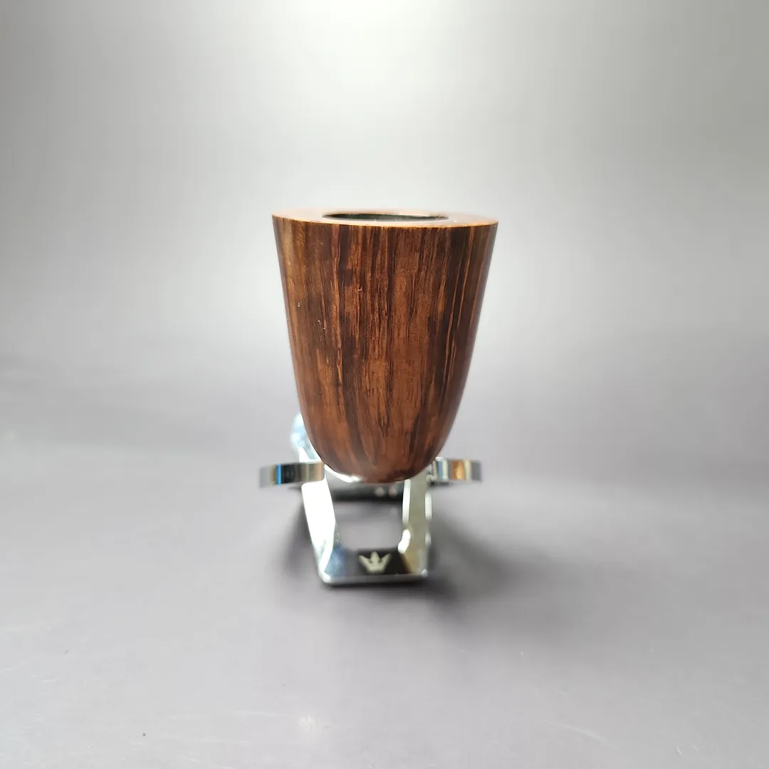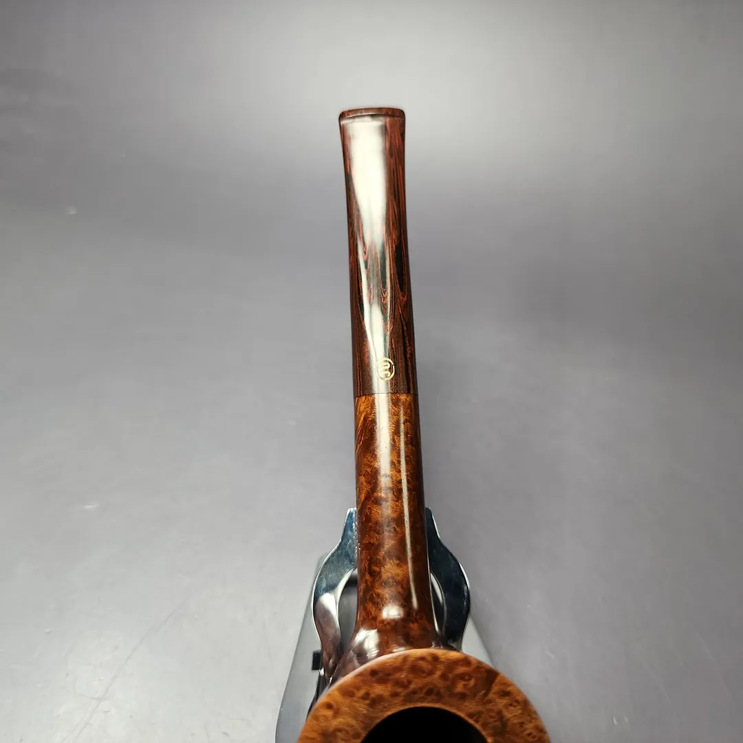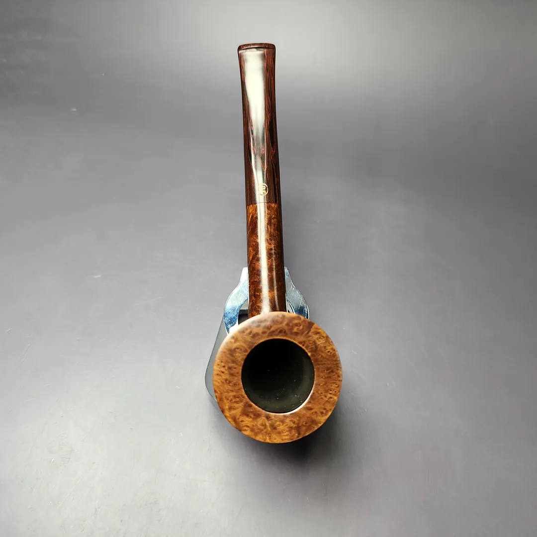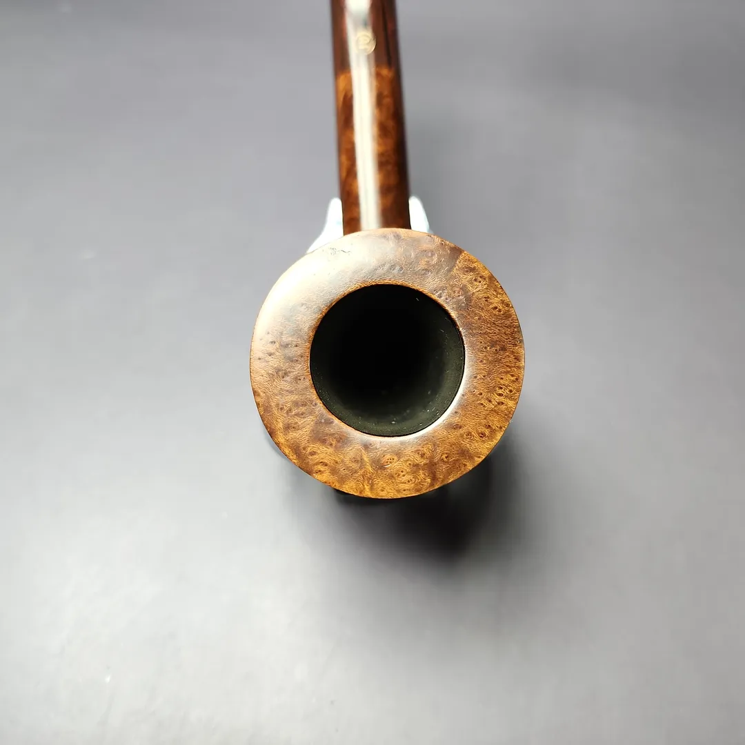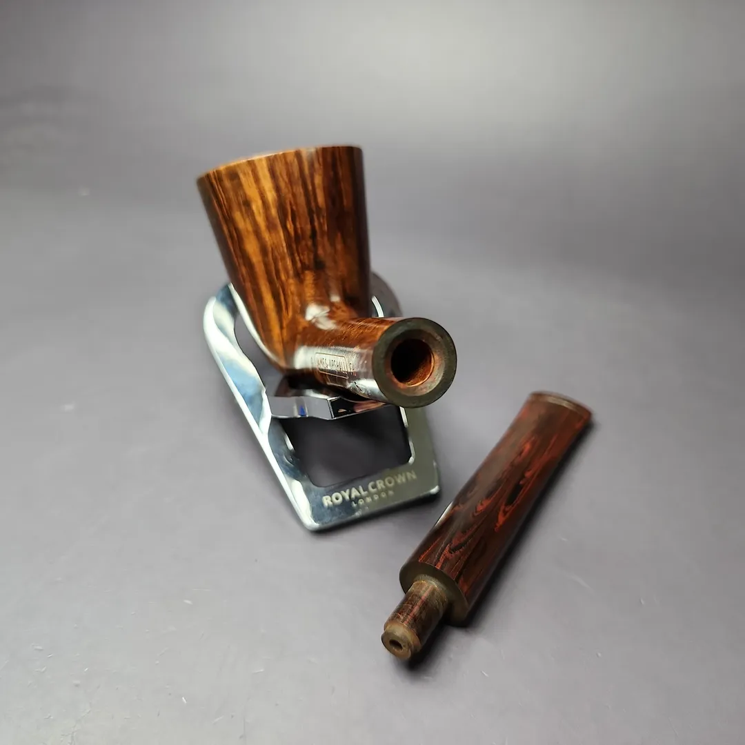 While the James Upshall workshop predominantly used letter grades on their pipes, these letters did not ascend or descend alphabetically in relation to the pipe’s stature. In other words, it wasn’t a case of grade A, then B, then C, and so on; it was S, A, P, B, G, E, X, and XX (as well as a parallel Empire Series for magnum pipes). This was a consequence of the grading system evolving over time, rather than beginning fully planned out, making it a little unintuitive. Shortly before his untimely passing, however, Kennedy Barnes offered a very helpful approximation as to how some of these grades compared to the grades of his former employer, Charatan. G grade James Upshalls were, according to Barnes, somewhere around the Selected or Supreme grades he’d worked on at his former employer, during its celebrated Lane era (so-called because this was the period when Charatan was owned by Herman Lane and Lane Ltd.). While we’re on the topic of Charatan, fans of the London pipe powerhouse will likely recognize this G grade as essentially being an upscaled version of its classic “Bell Dublin” shape. Distinguished by its slender frame and a bowl slightly more conical than other shapes of its kind, the Bell Dublin was actually conceived under Reuben Charatan, who took a young Barry Jones under his wing as soon as he left high school. As far as this pipe goes, it’s a masterful rendition of a form Jones could probably turn blindfolded, given how many he would have made even before James Upshall was founded. It also features a rare example of a hand-cut cumberland stem, something Jones learned to work with much later into his career, and which his workshop offered at a steep premium.