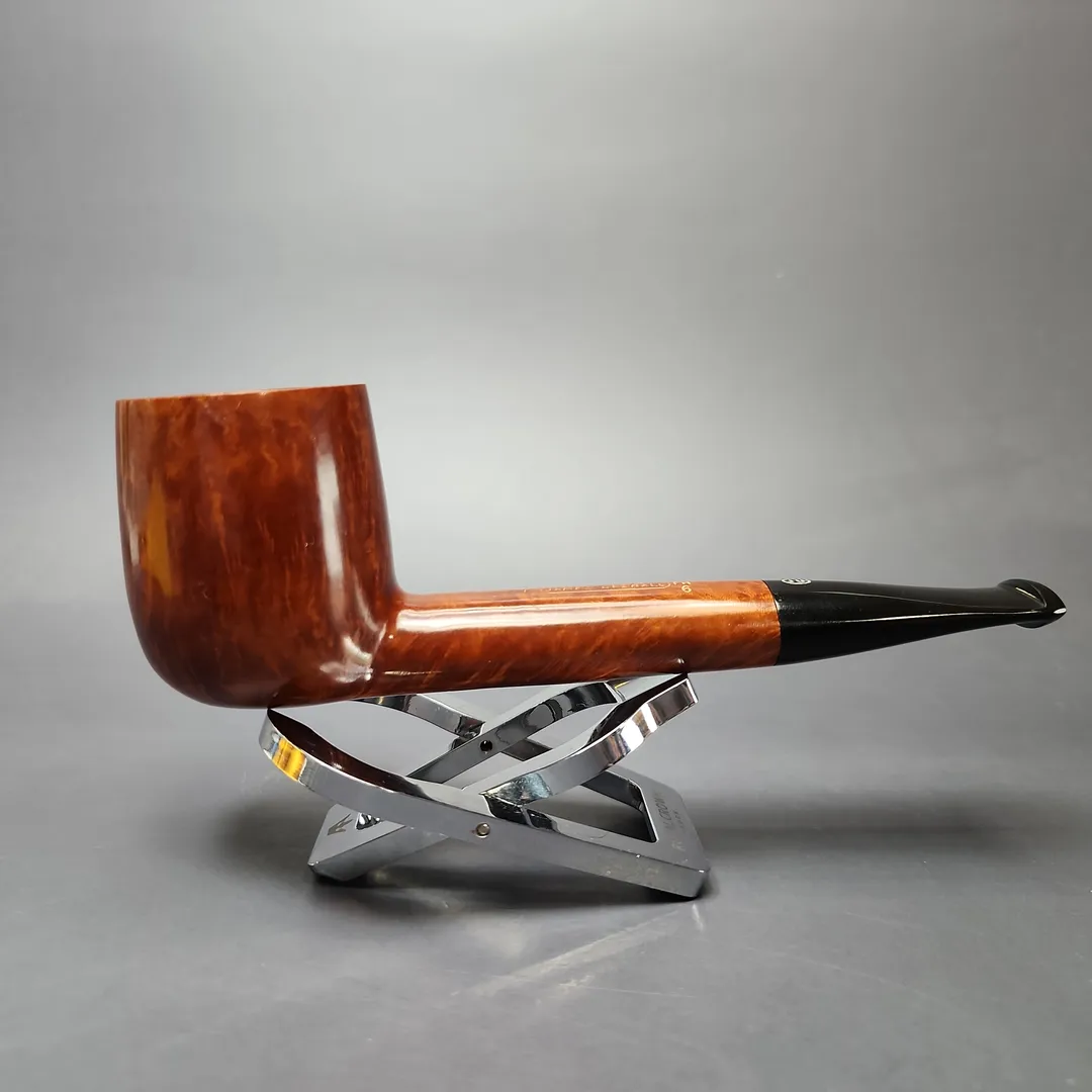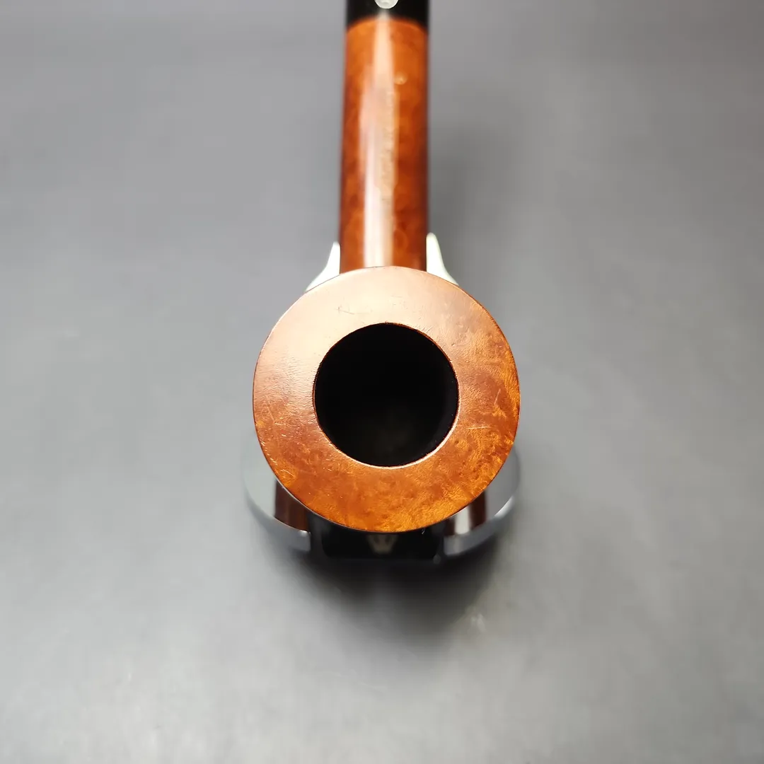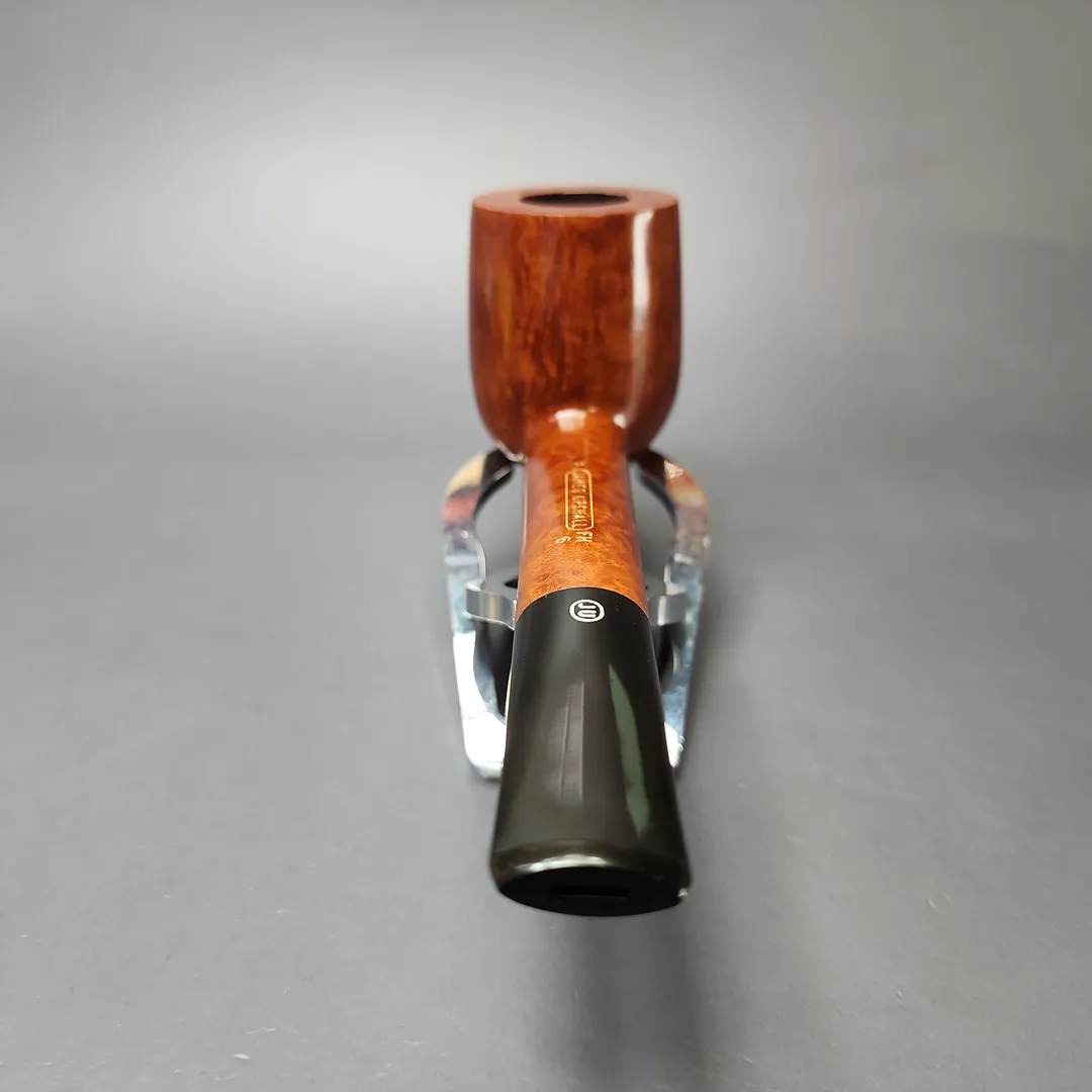 “Long shank” shapes held a special place at the Tilshead Pipe Company. The Canadian, for example, was a firm favorite of co-founder Ken Barnes, and indeed some of the earliest James Upshall pipes were a run of Canadian renditions whose lengthwise dimensions were included in their nomenclature. And long shank shapes were also a means for the Barnses and Jones—all ex-Charatan—to express the influence of their former employer. Long shank shapes conceived by Reuben Charatan, such as the Newmarket, found a new home at James Upshall, as did many of the more subtle stylistic choices more common during Charatan’s Lane era. This one is an especially stout take on the old English classic, with especially consistent, fiery vertical graining.
