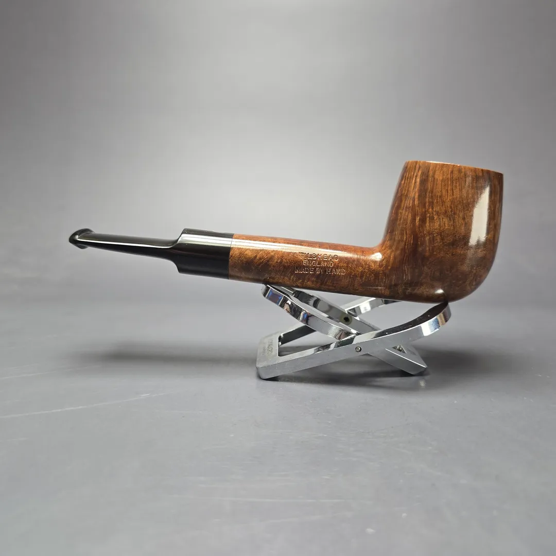 “Long shank” shapes held a special place at the Tilshead pipe company. One might assume that this was in part because its founders, Barry Jones and Ken Barnes, had cut their teeth at Charatan, where such shapes and motifs featured prominently in both its catalog and freehand output (especially during the Lane era). Other reasons were more explicit; for Barnes, at least, long shank shapes like the Canadian were simply his favorite. Whatever the exact cause, its certain that there were plenty of very fine Canadian, lumberman, Liverpool, Newmarket, and, as seen here, Lovat renditions made under the James Upshall name. This particular example is a P grade, the highest of the “Standard” grades offered for James Upshall pipes. Taking its name from Charatan’s “Perfection” grade, the “P” was Barry and Ken’s attempt to create their own version of the warm, walnut contrast stain used by Charatan on such pipes. The Upshall boys were a little bolder when it came to comparing the “P” to Charatan in terms of quality, however. As Ken Barnes would later recount, the “P” was, rather, much closer to Charatan’s “Distinction,” presumably those of the quality Barnes and Jones saw first-hand when working there (under Reuben Charatan and Herman Lane, and Herman Lane, respectively). The connection is certainly strong with this one, not least owing to the excellent, contrast-lit straight grain lining its bowl.