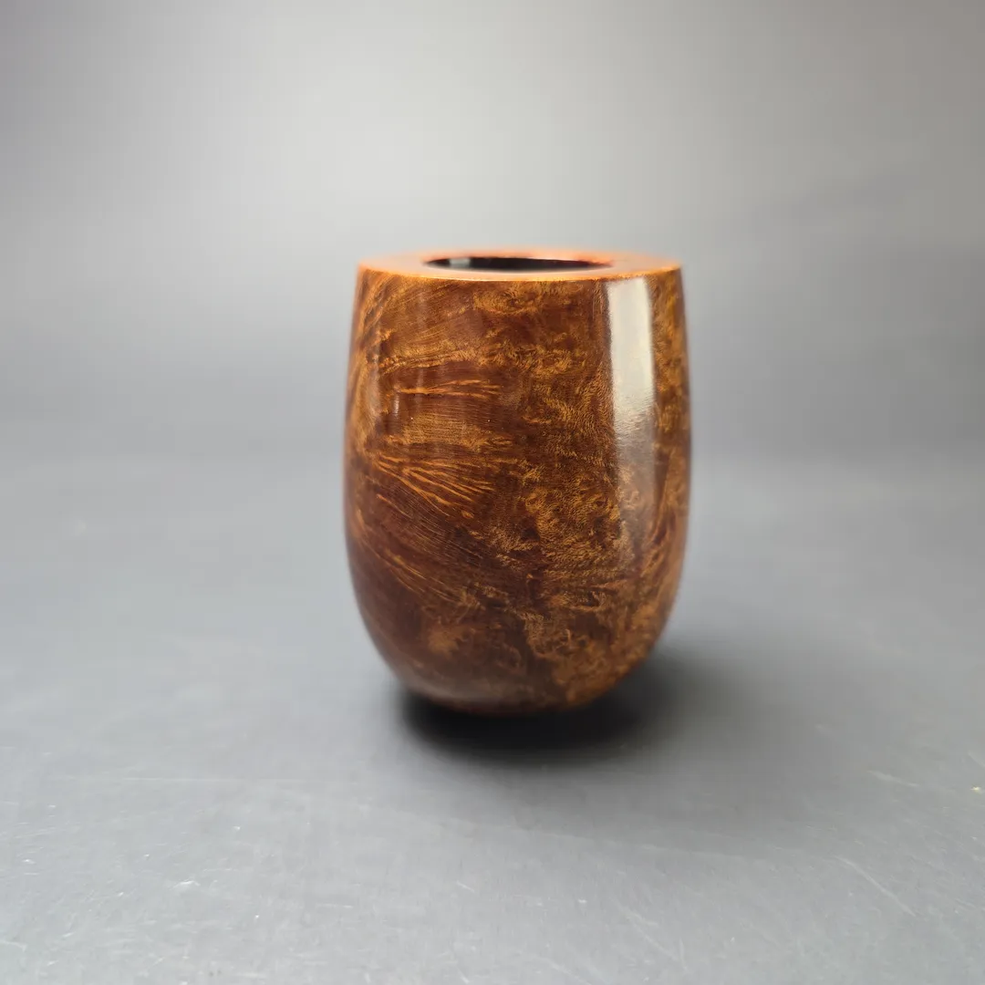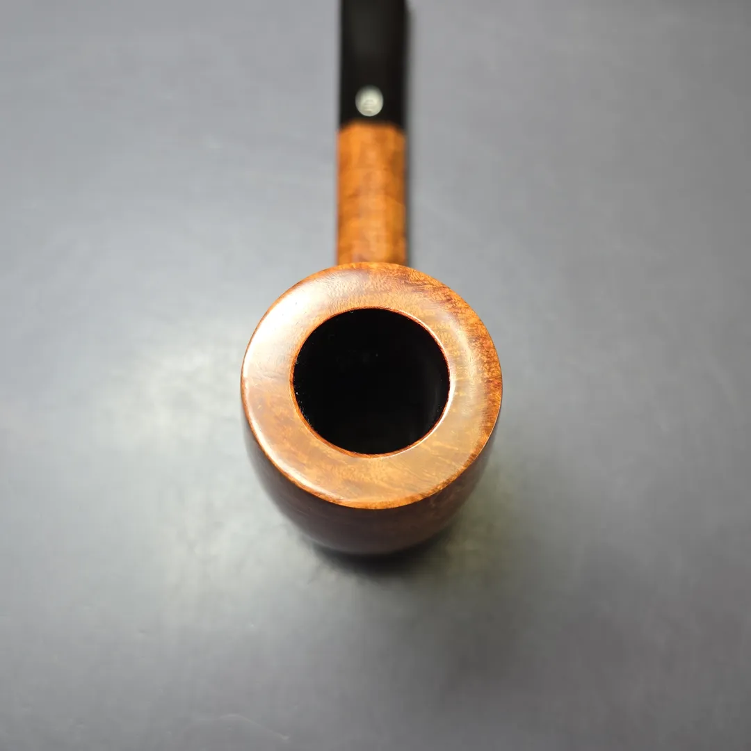 “Long shank” shapes held a special place at the Tilshead Pipe Company. The Canadian, for example, was a firm favorite of co-founder Ken Barnes, and indeed some of the earliest James Upshall pipes were a run of Canadian renditions whose lengthwise dimensions were included in the nomenclature. And long shank shapes were also a means for the Barnses and Jones—all ex-Charatan—to express the influence of their former employer. Long shank shapes conceived by Reuben Charatan, such as the Newmarket, found a new home at James Upshall, as did many of the more subtle stylistic choices more common during Charatan’s Lane era. In terms of the latter, faceted shanks, such as those of Outsize Lumberman and Diamond Billiard (along with countless freehands), were also not uncommon in James Upshall pipes, as one can see on this unusually broad-bowled, panel-shank Canadian design.