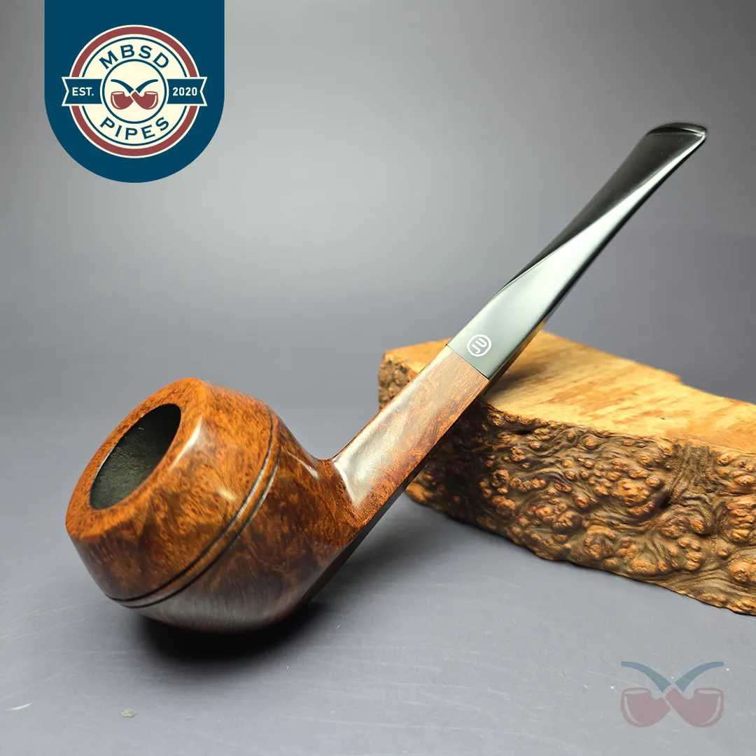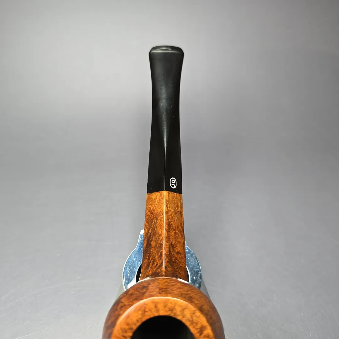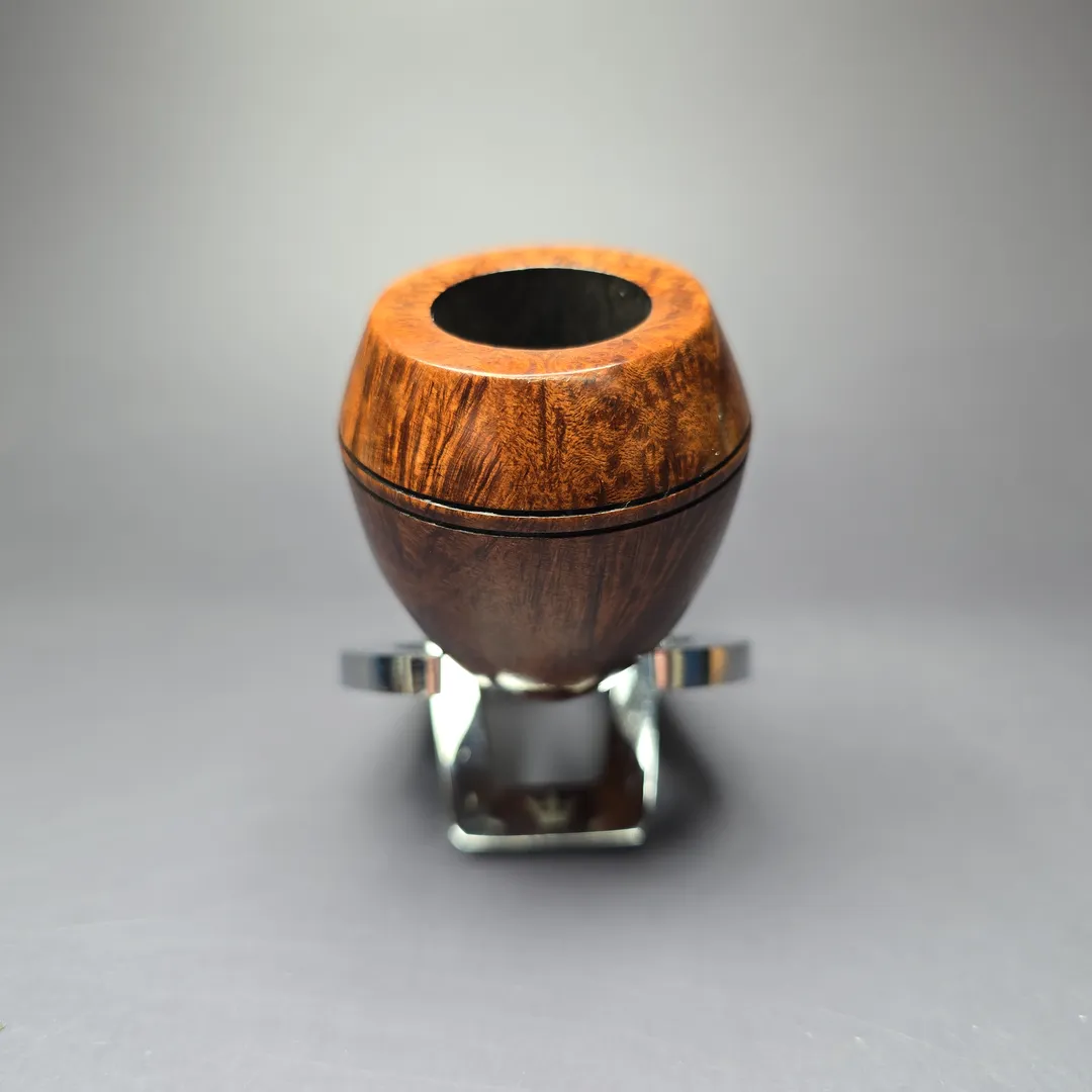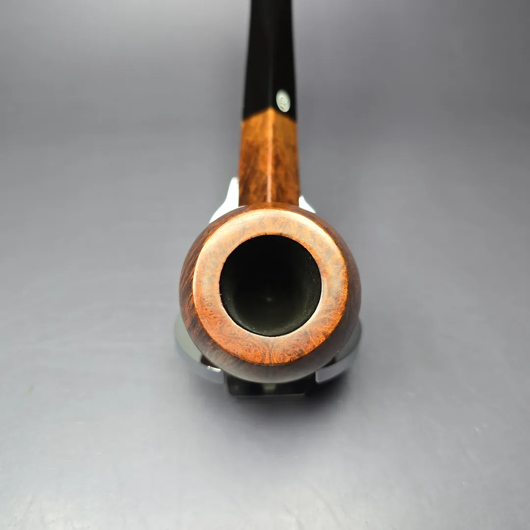 The “P” was the highest of James Upshall’s “standard” grades, and one notable for its excellent grain patterns. Taking its name from Charatan’s “Perfection” grade, the “P” was Barry and Ken’s attempt to create their own version of the warm, walnut contrast stain used by Charatan on such pipes. The Upshall boys were a little bolder when it came to comparing the “P” to Charatan in terms of quality, however. As Ken Barnes would later recount, the “P” was, rather, much closer to Charatan’s “Distinction,” which in Charatan’s system was considerably higher than the “Perfection.” This one is a classic bulldog shape, with the P grade’s signature contrast stain highlighting a wealth of flame grain and bird’s-eye.
