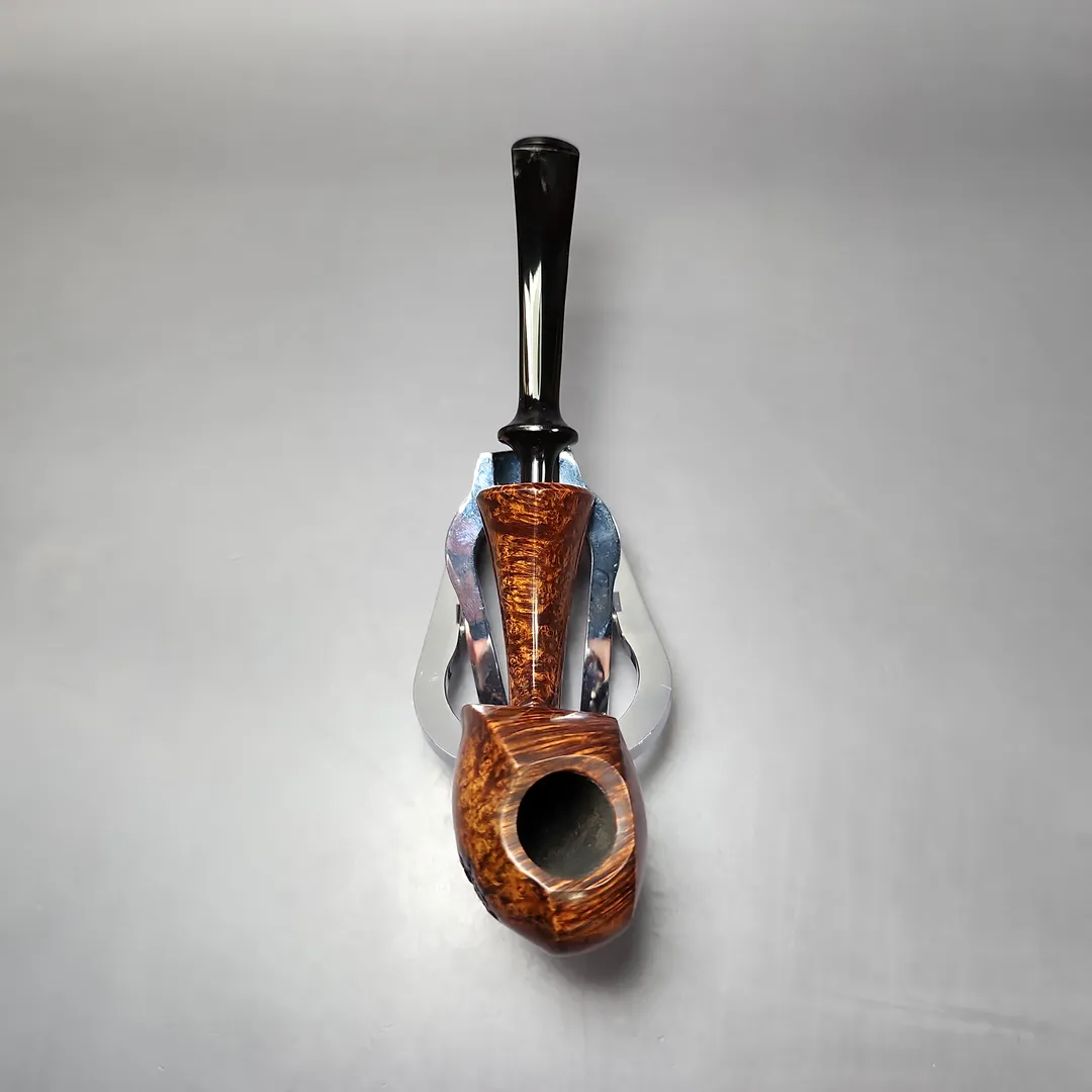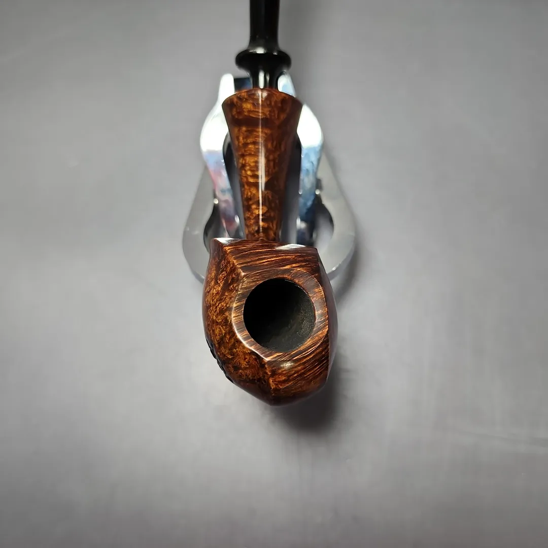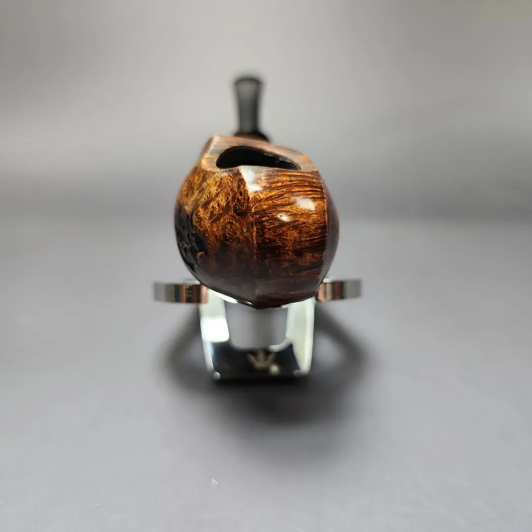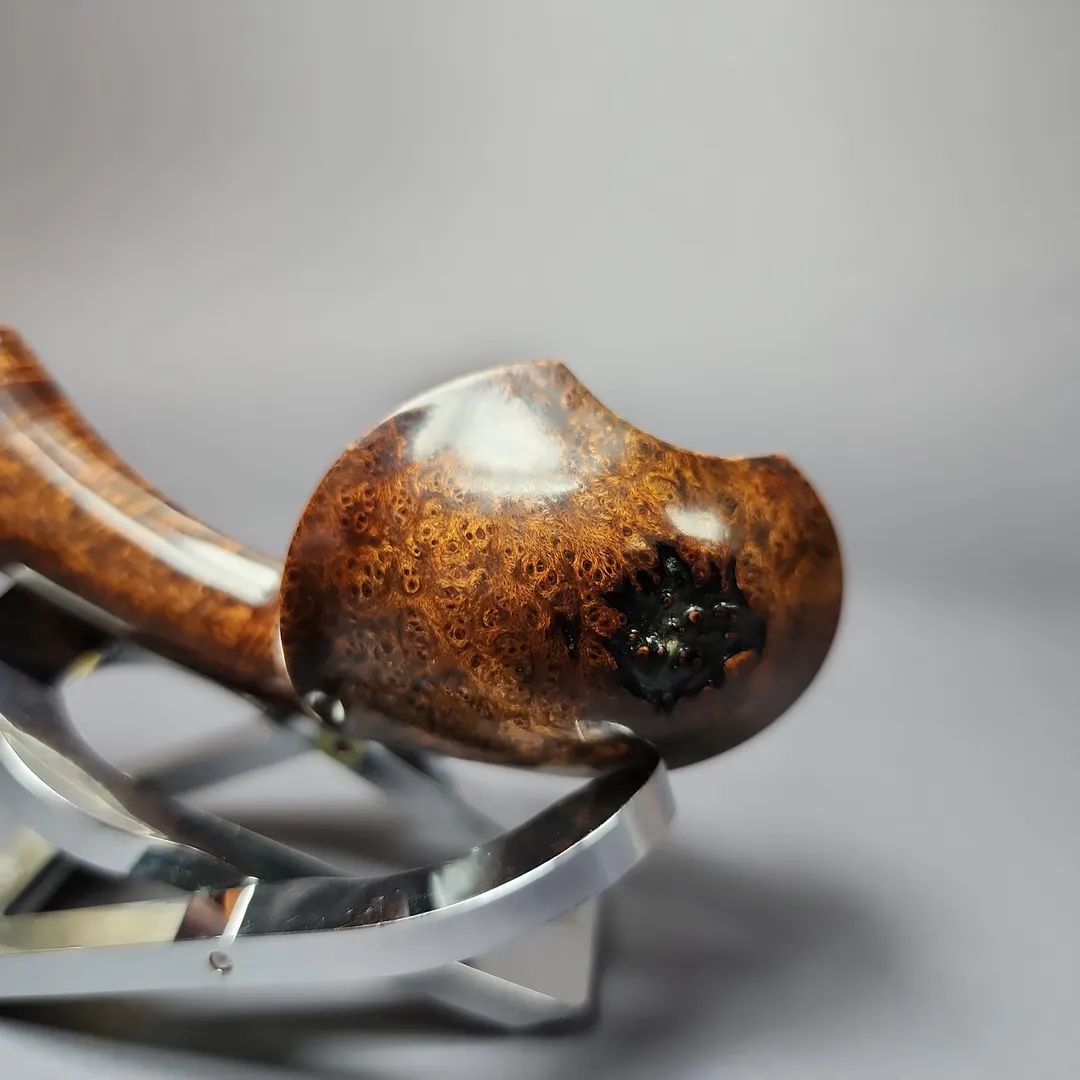 Patrick’s blowfish renditions have also struck me as particularly impressive, with this one being no different. A long shank, asymmetric piece in the vein of East Asian artisans, such as Hiroyuki Tokutomi or Ping Zhan, the pipe is a veritable featherweight, with its golden contrast stain showing off bird’s-eye so tight-knit that its only interruption is a dash of plateaux on the right flank.