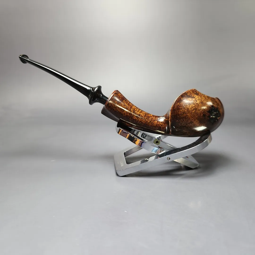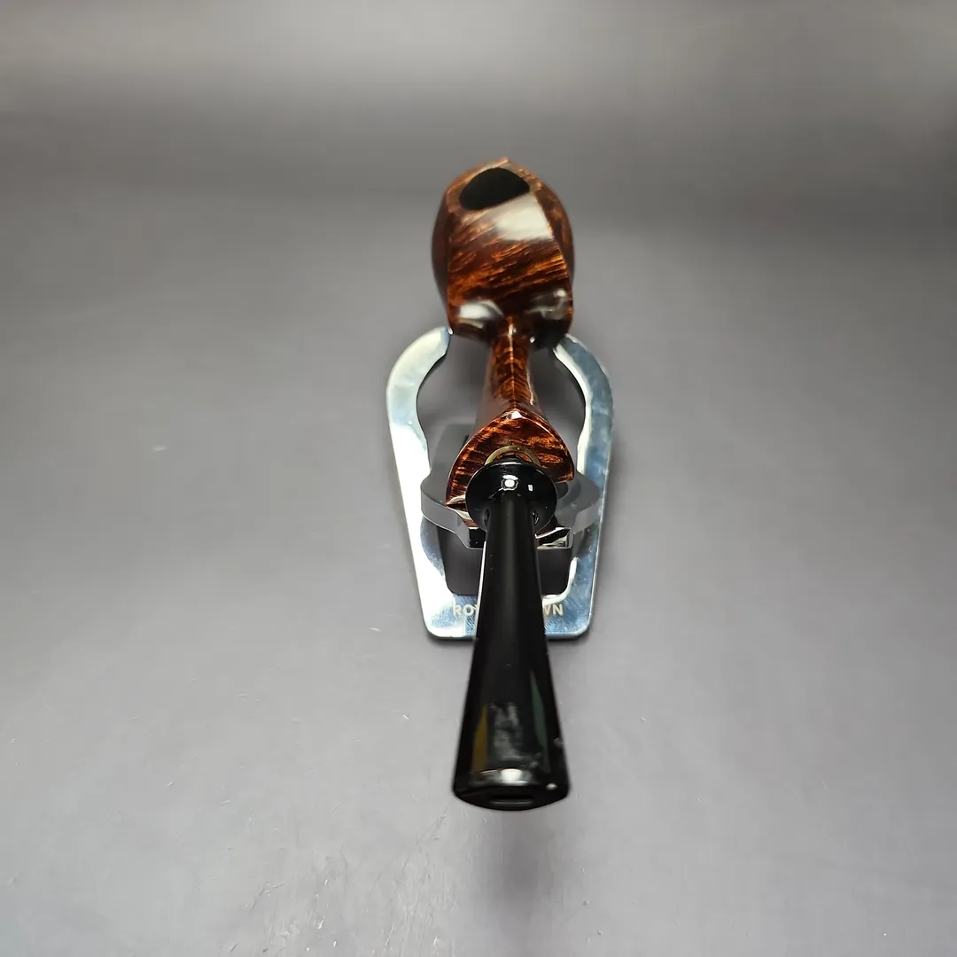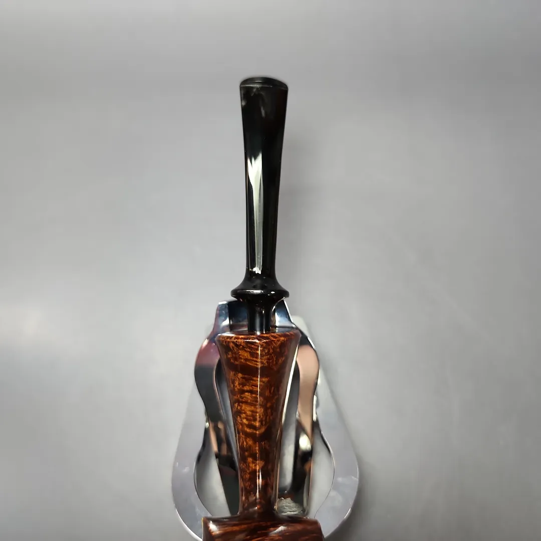 Patrick’s blowfish renditions have also struck me as particularly impressive, with this one being no different. A long shank, asymmetric piece in the vein of East Asian artisans, such as Hiroyuki Tokutomi or Ping Zhan, the pipe is a veritable featherweight, with its golden contrast stain showing off bird’s-eye so tight-knit that its only interruption is a dash of plateaux on the right flank.