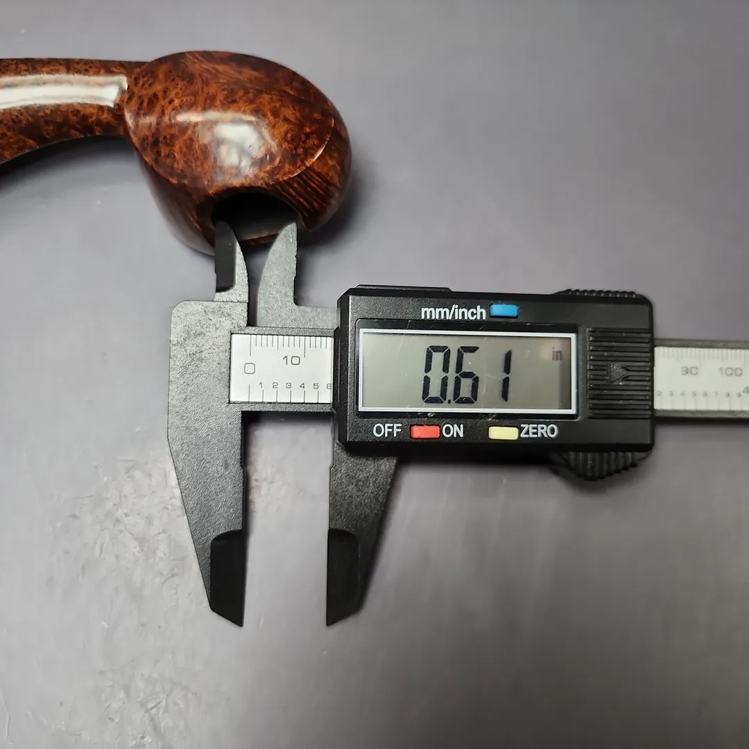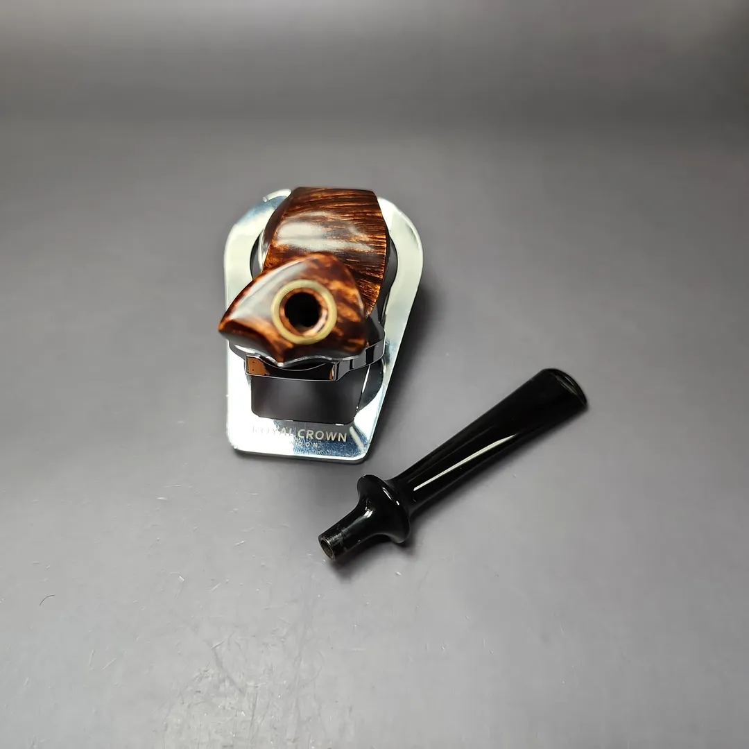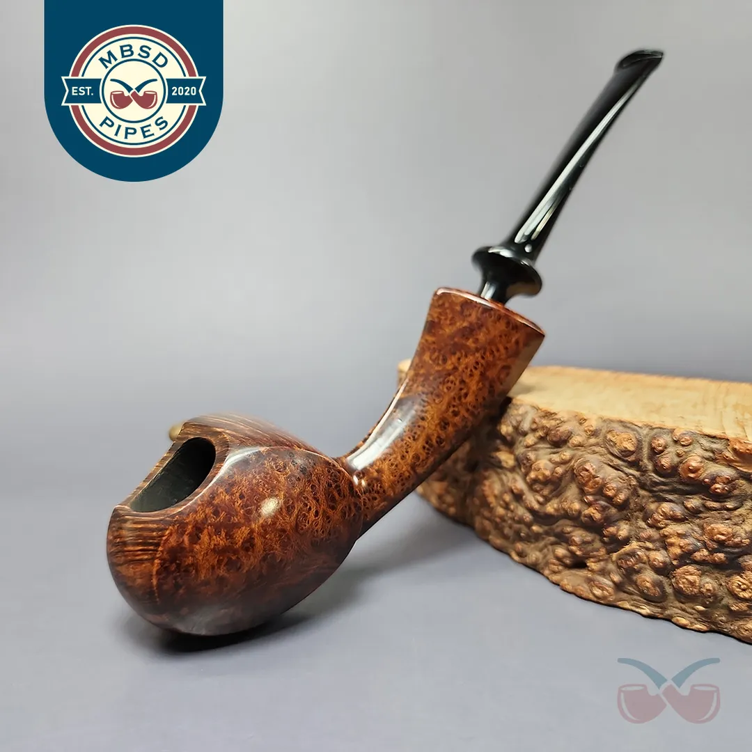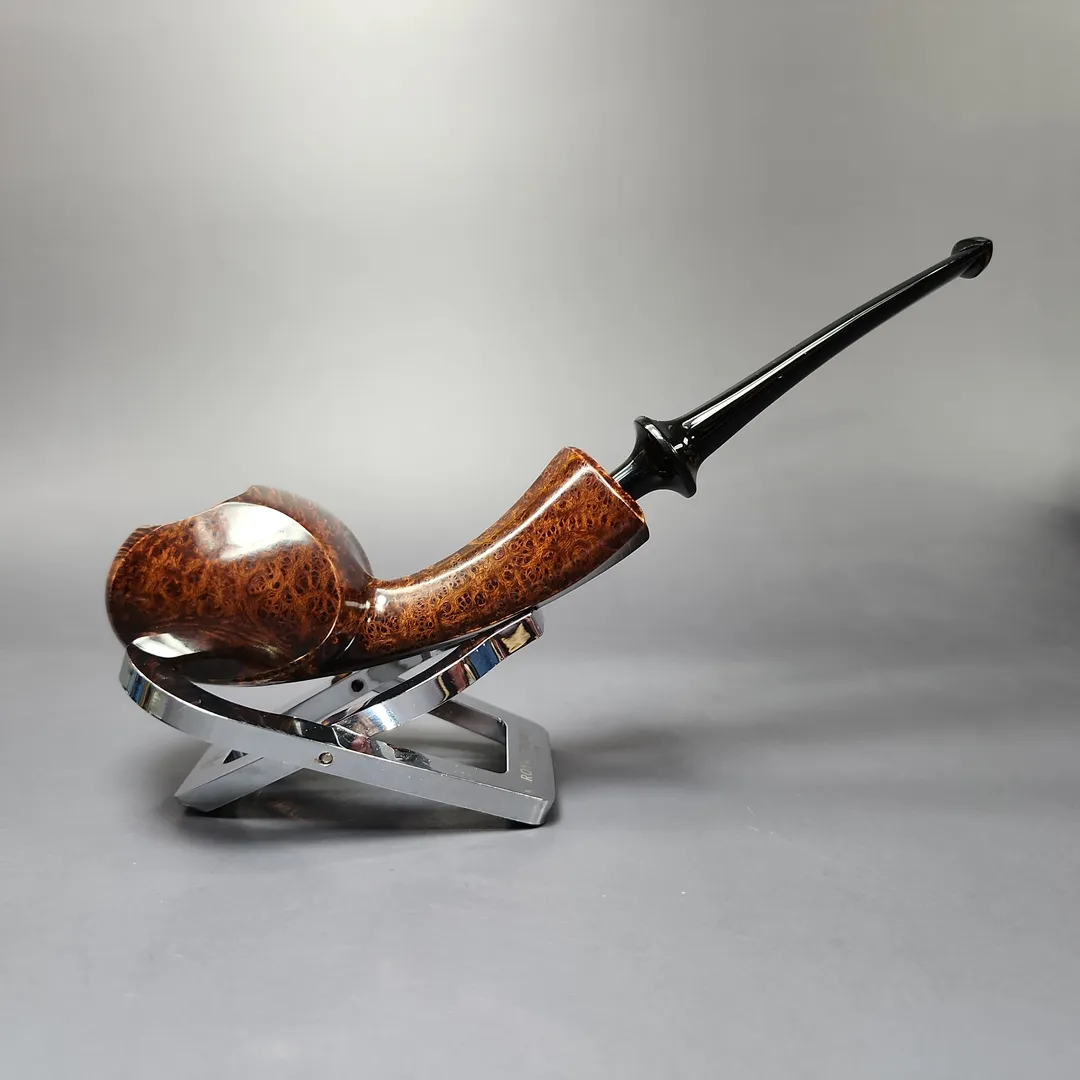Patrick’s blowfish renditions have also struck me as particularly impressive, with this one being no different. A long shank, asymmetric piece in the vein of East Asian artisans, such as Hiroyuki Tokutomi or Ping Zhan, the pipe is a veritable featherweight, with its golden contrast stain showing off bird’s-eye so tight-knit that its only interruption is a dash of plateaux on the right flank.