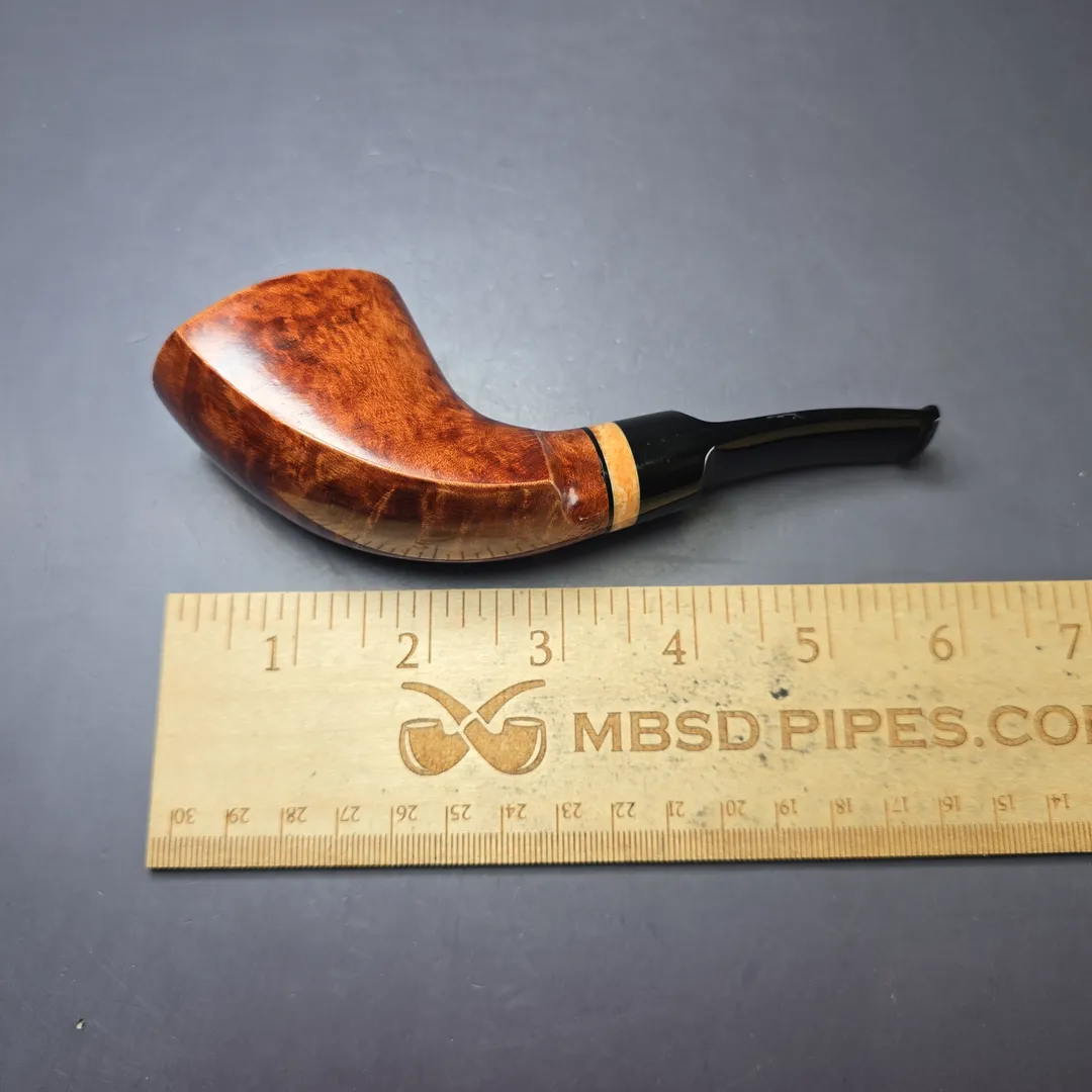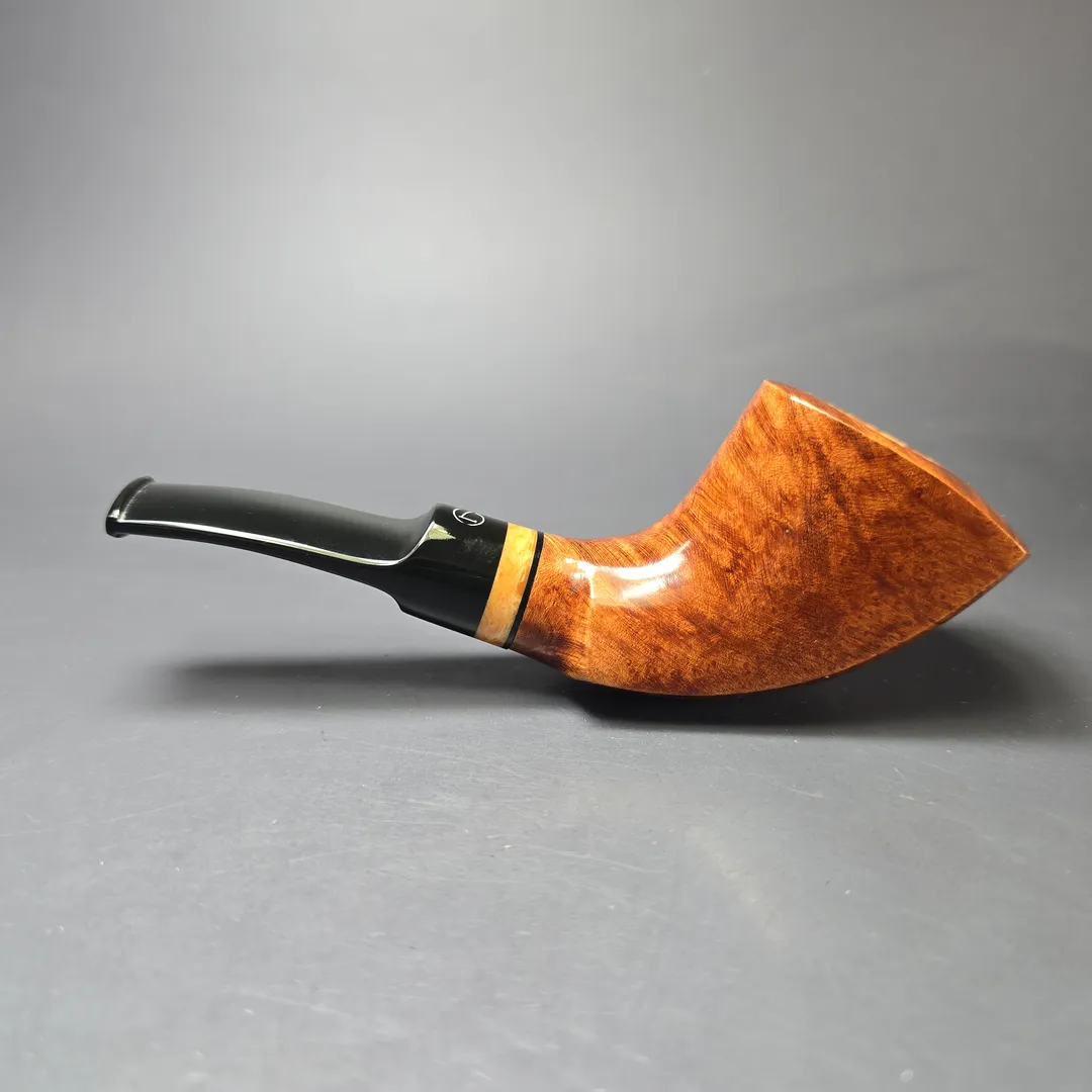 In the case of this Jirsa, there’s a clear Danish influence, though one that takes some of the designs of the Danish movement and pushes them even further than is typical. The shape is more or less a cobra, though one whose signature “hood” has been broadened at the bowl’s front, before being “furled” in at the shank end. In a way, it’s even more “cobra” than the Danish cobra, and uses this property to its fullest advantage in terms of maximizing space to show off grain patterns. The accent is also a nice touch—acrylic, but in hues that are almost mineral, or amber-like.
