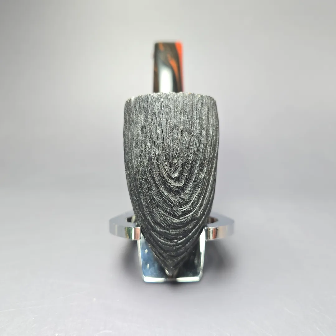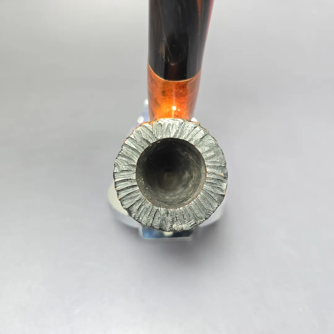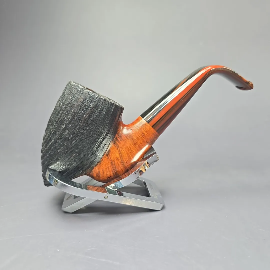 The archetypical Boswell pipe is a little freeform, a little classic, a little large (sometimes more than a little) and very much unique. This one, from 2009, fits that mold perfectl. Blending elements of the traditional Oom Paul and pickaxe shapes, parallels could be drawn between its basic shape and the old Caminetto 176, though Boswell’s design is, arguably, even more assertive, and certainly sharper. For a bowl that ends at a single, spiky point, it seems that wire rustication is the perfect dress, with the narrow striations of this partial finish emphasizing its barbed figure. The rustication is particularly interesting on the bowl’s front, which has me wondering whether there was some grain-following involved, à la Sasieni.