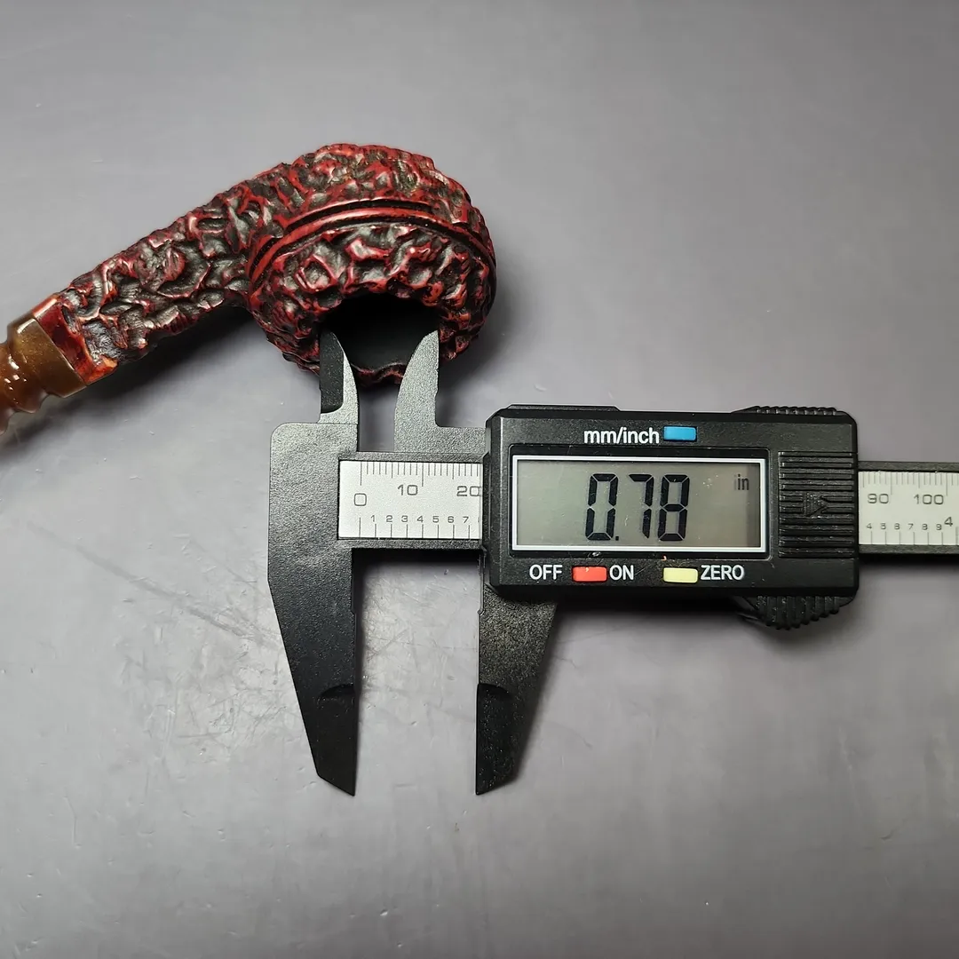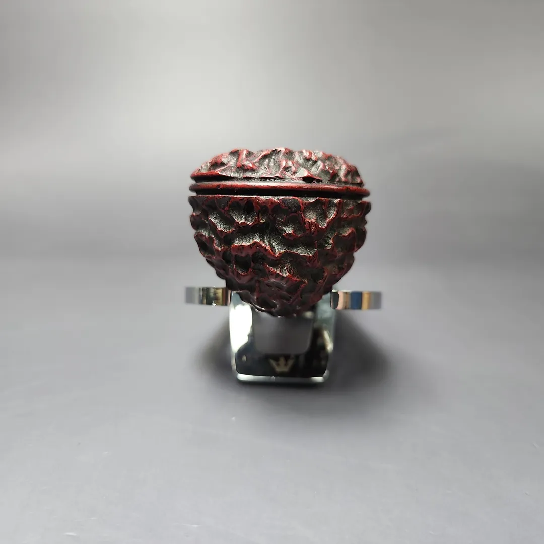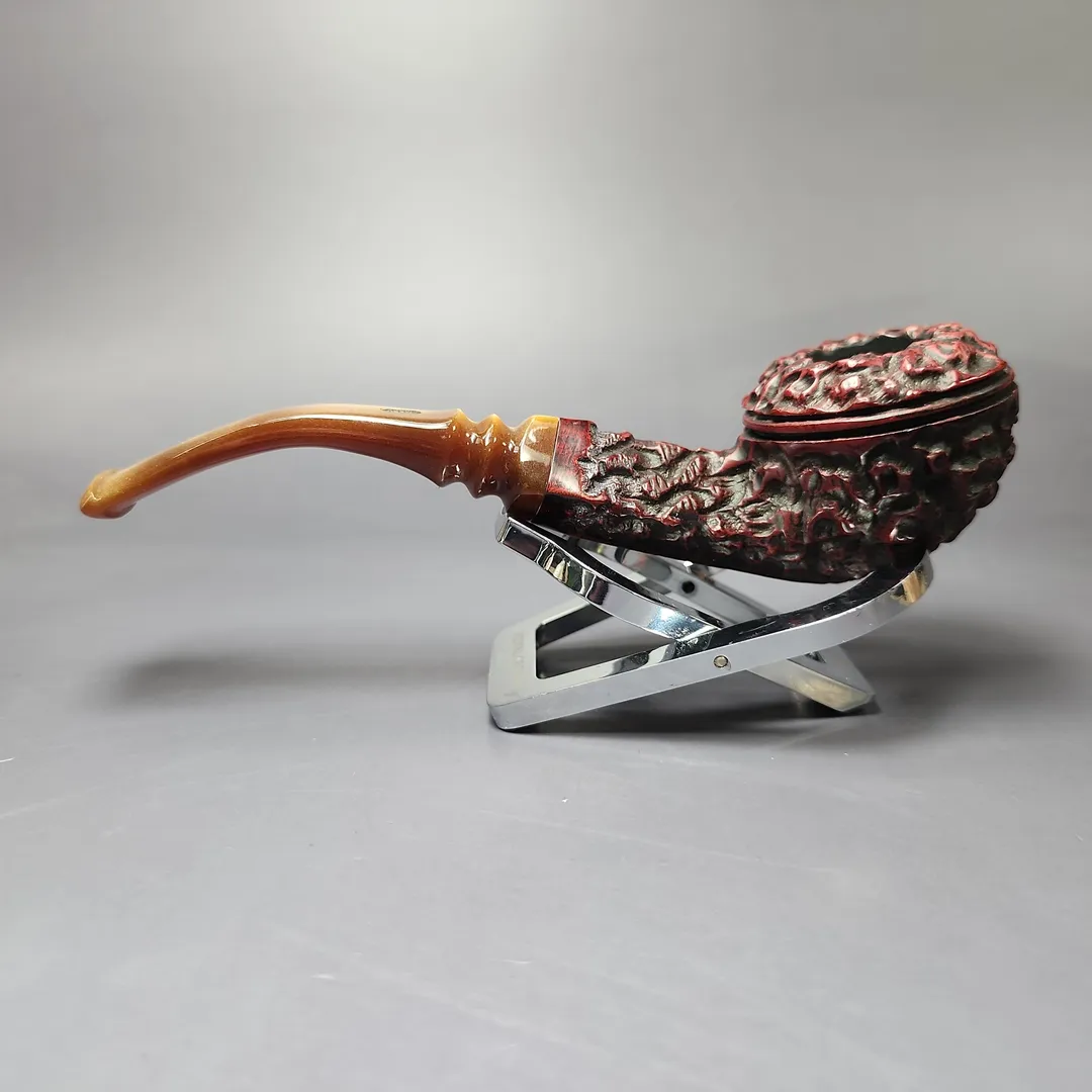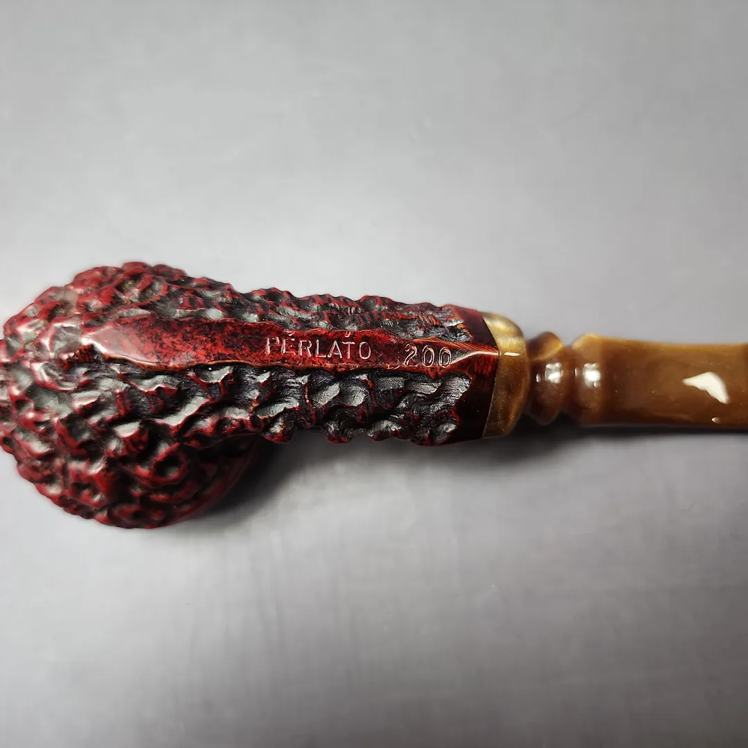 Though part of the nomenclature has been buffed off, American pipe enthusiasts are likely to have a hunch as to who made this “Perlato” pipe, especially given its screw tenon. It is, of course, a Jobey, one that is not entirely unlike their Italian-inspired, cult-favorite Stromboli line, including the colorful acrylic stem. Where it differs, however, is that the rusticated finish is more vermiculated than pebble-dash, lending a distinct depth to its two-tone, black and red finish.