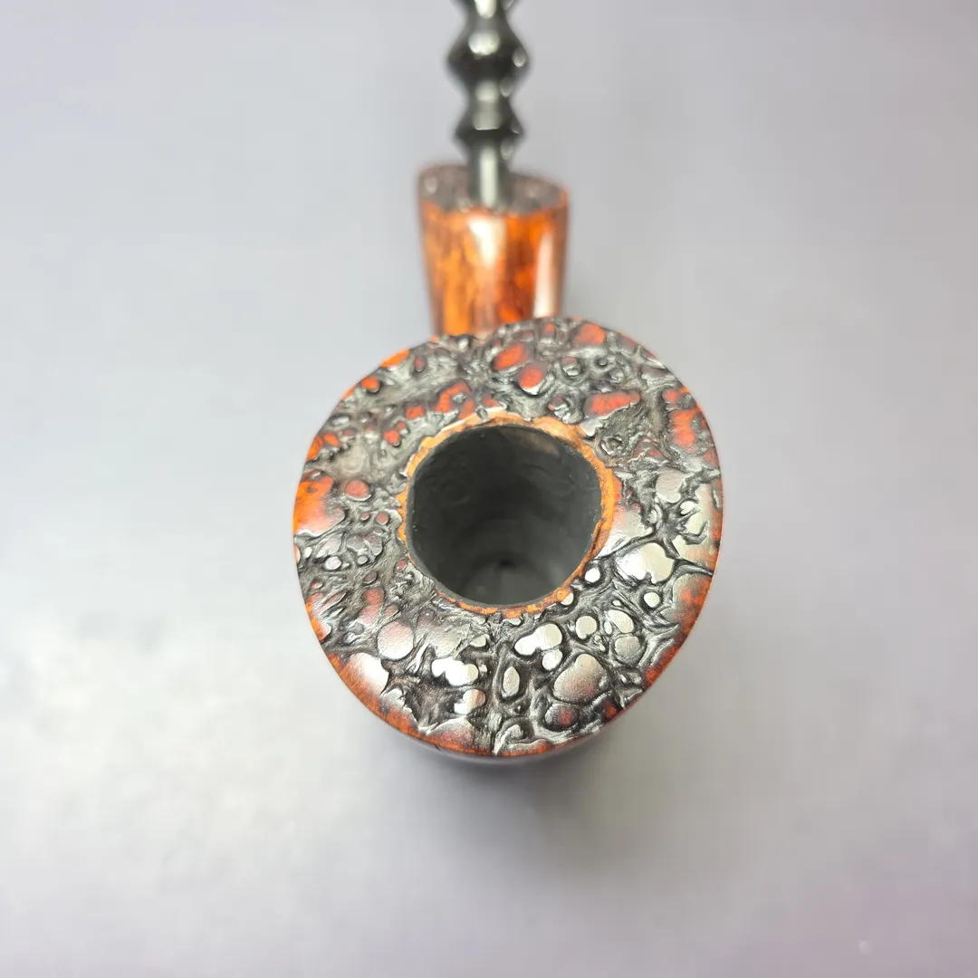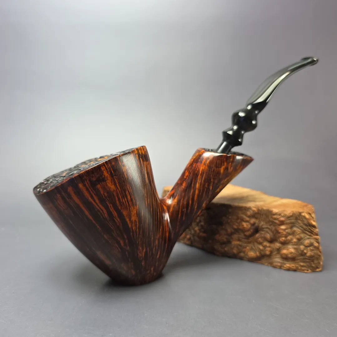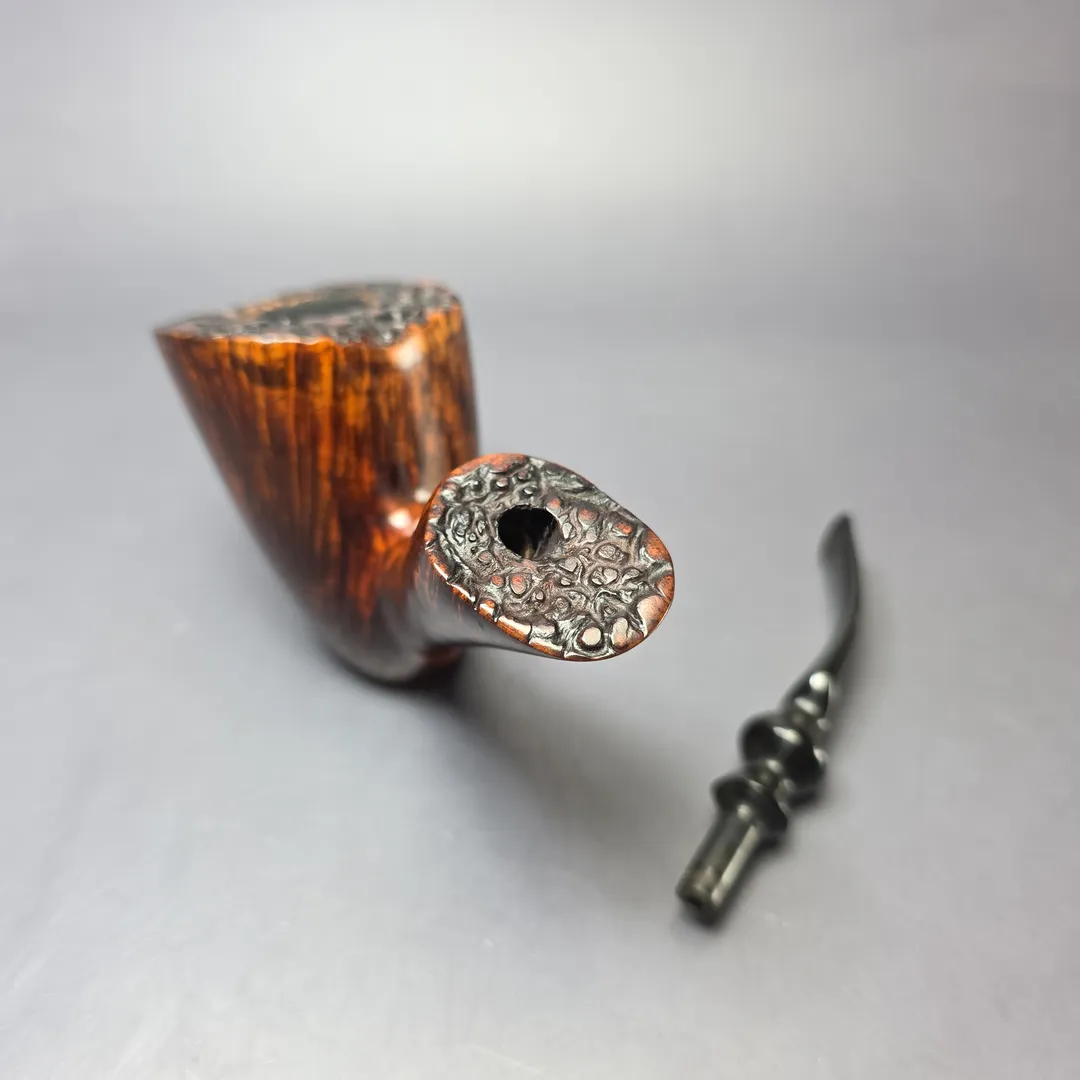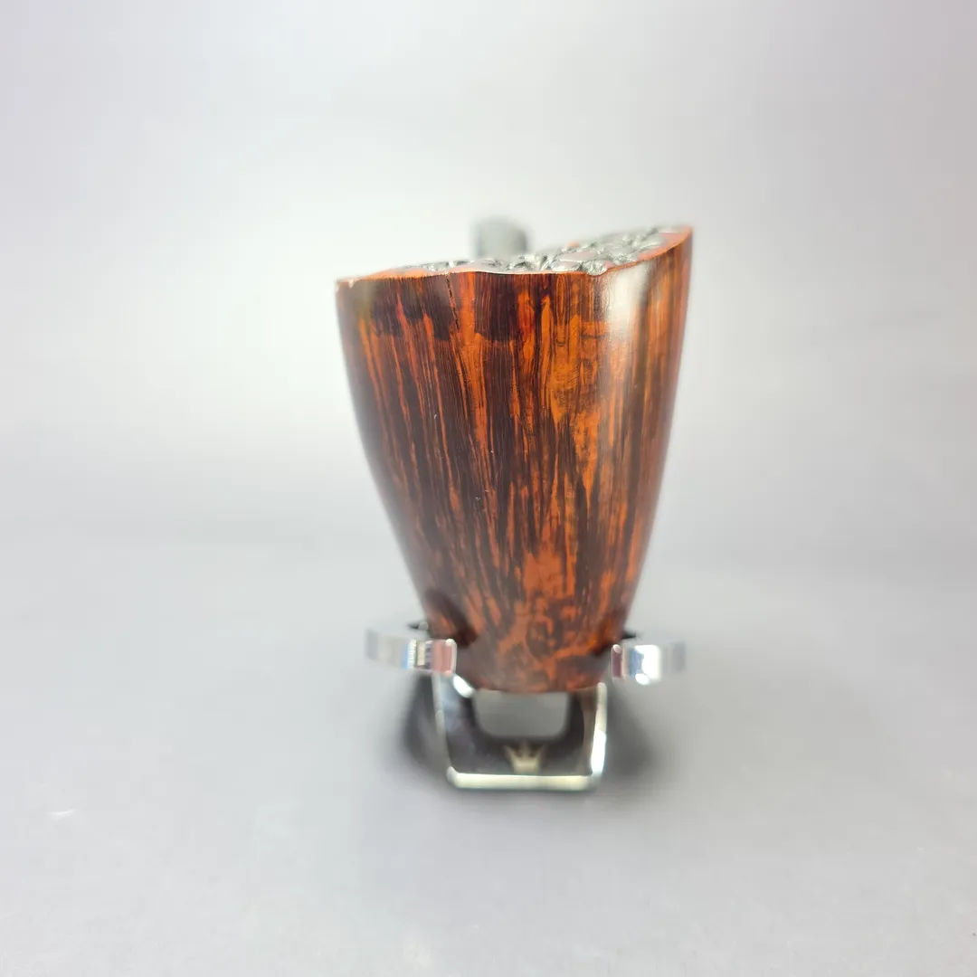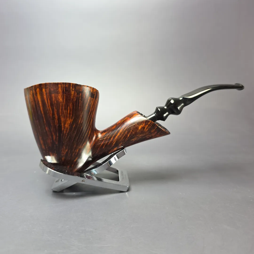 Mogens Johansen spent years carving freehands under Bjarne Nielsen, so it’s no surprise that he’s one of the most skilled artisans working in that genre today. This one is an impressively large specimen—almost magnum in proportions—with consistent straight grain circling its towering bowl, accentuated by a fiery contrast stain. Johs has always had a knack for shaping, too, with this one achieving the quite miraculous feat of standing (perhaps “perching” is a better descriptor) on its own accord, allowing it to serve as a nice display piece when not in use.