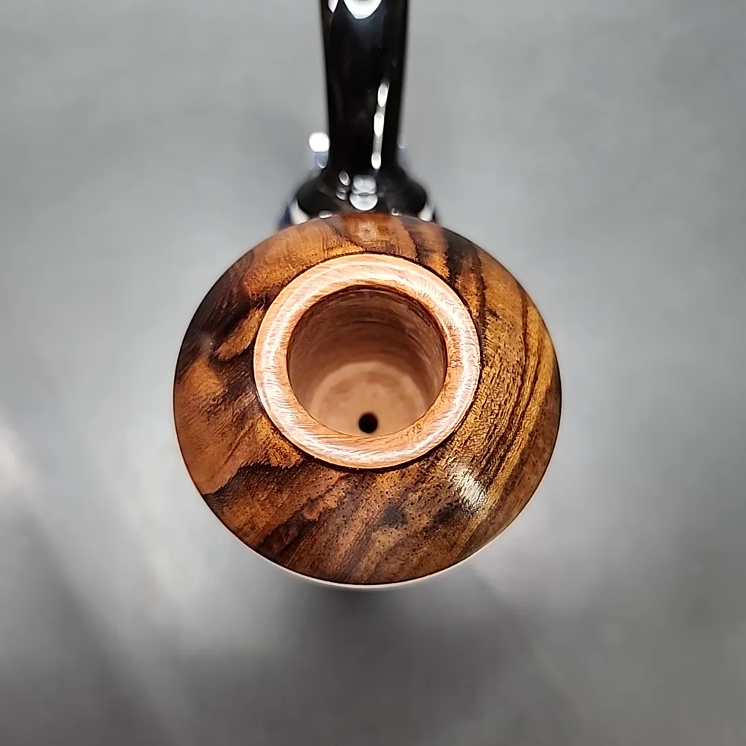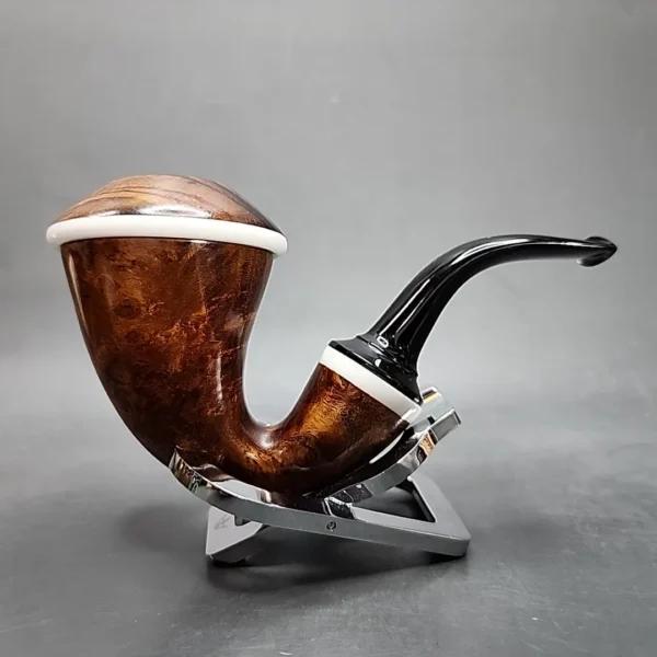 This is one of Karim’s popular calabash series of pipes. It’s modeled after the antique calabashes smoked in the days of old, but is composed of a briar body instead of gourd, capped by a removable briar chamber, along with a black ebonite stem, instead of horn or amber. This one is accented by an Indonesian rosewood rim and two ivorite bands.