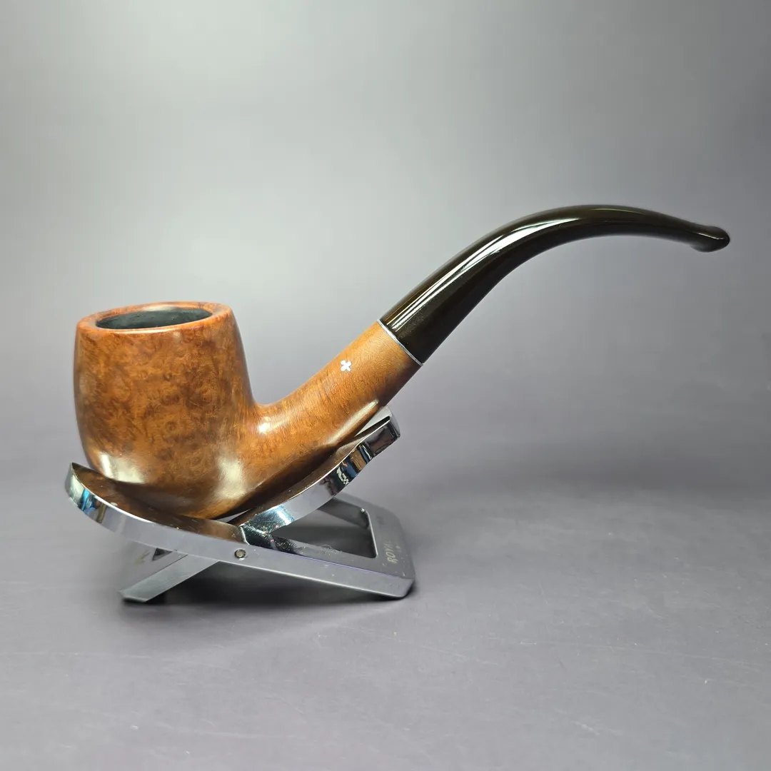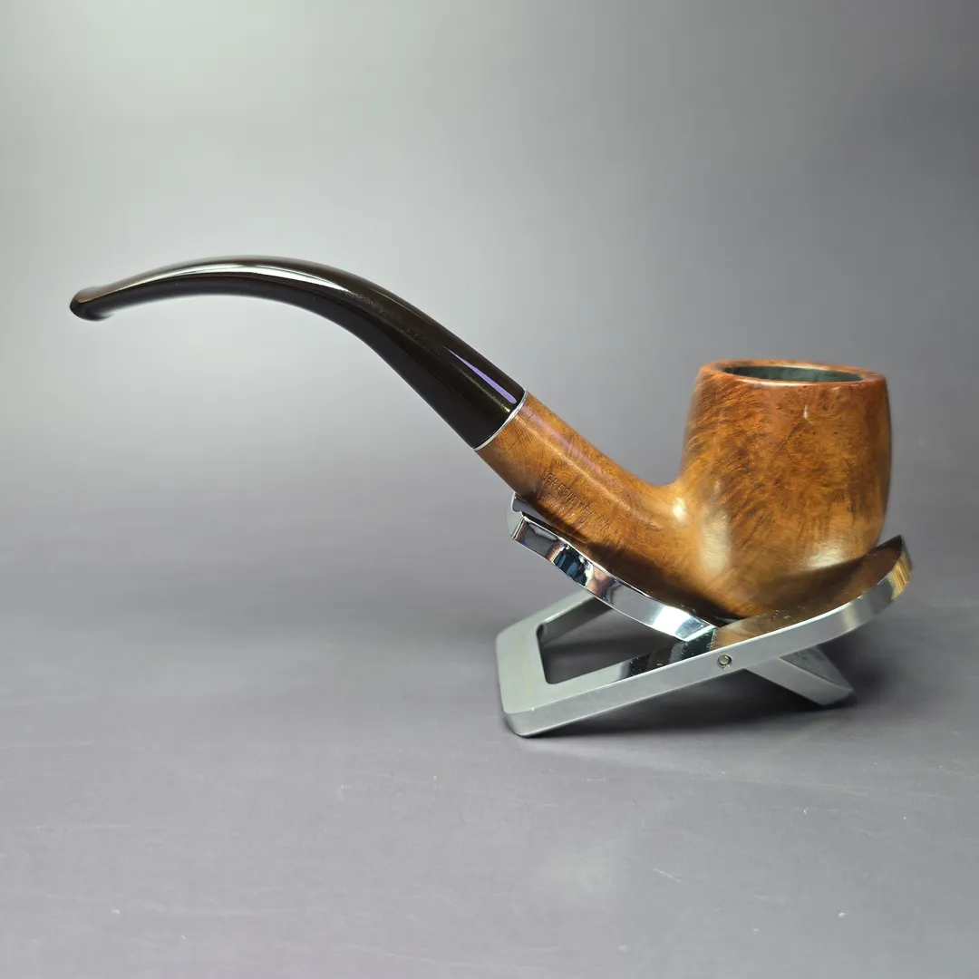 The Super Grain was one of Kaywoodie’s early higher-grade lines, one that, in its infancy, was distinguished by KB&B’s signature cloverleaf inlay on its shank, rather than its stem. Turned from what KB&B claimed to be especially excellent briar, which the company had located in Greece, Super Grains wore very natural, smooth finishes, with the intention of giving center stage to said briar. This one is a traditional bent billiard and, true to its word, the bowl shows plenty of bird’s-eye from that special, Greek root KB&B was so proud of.