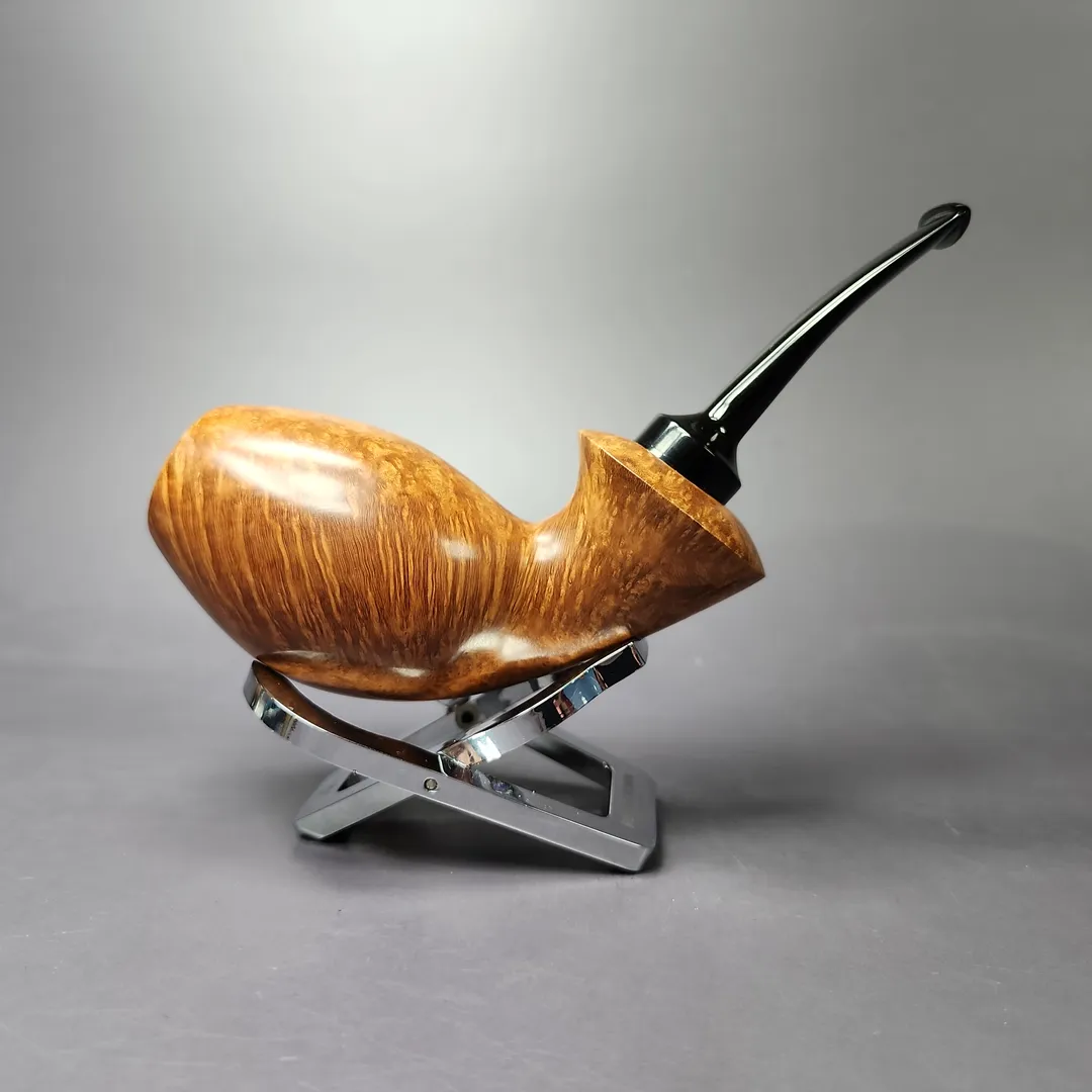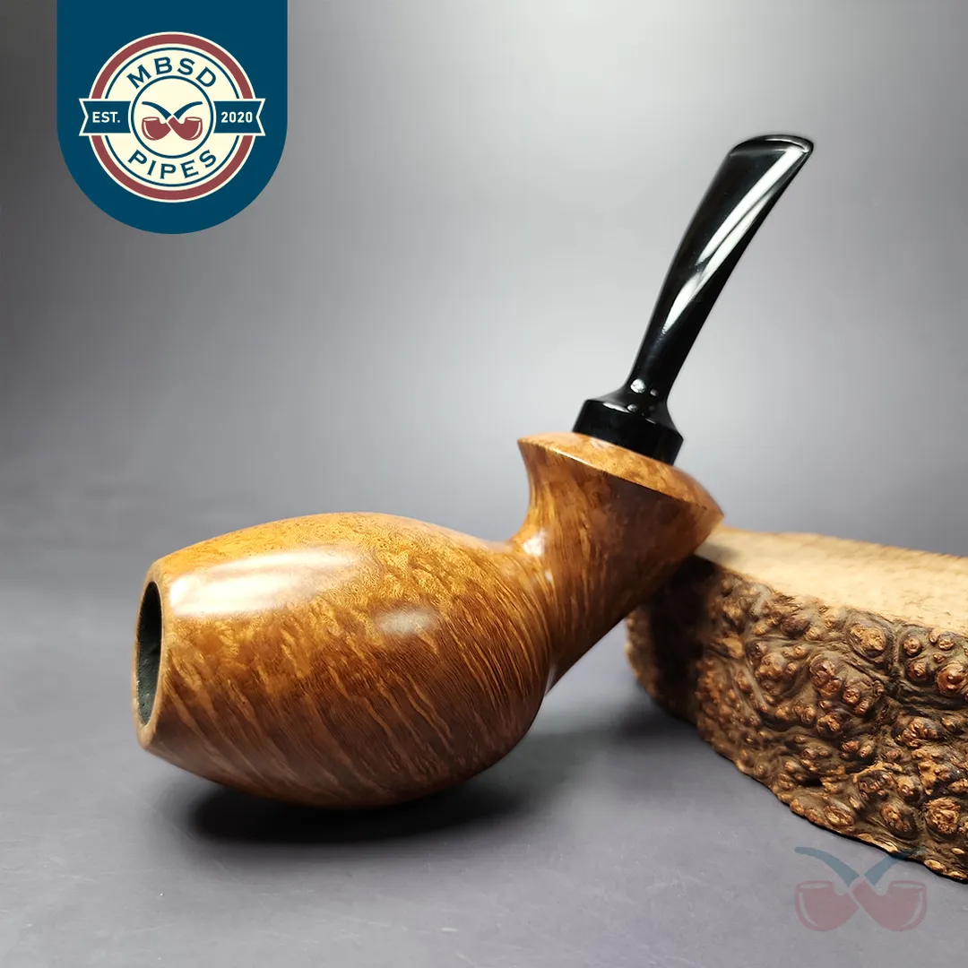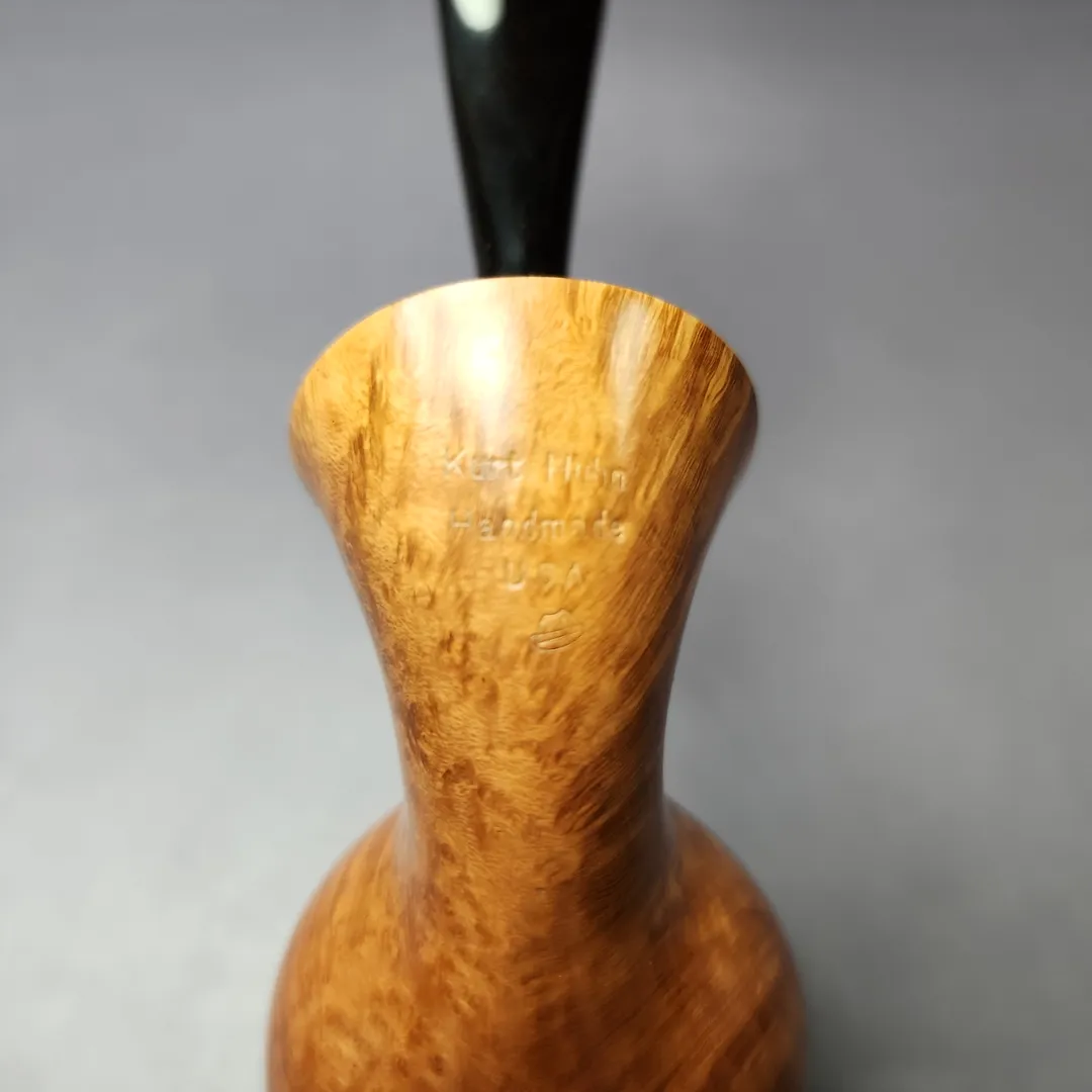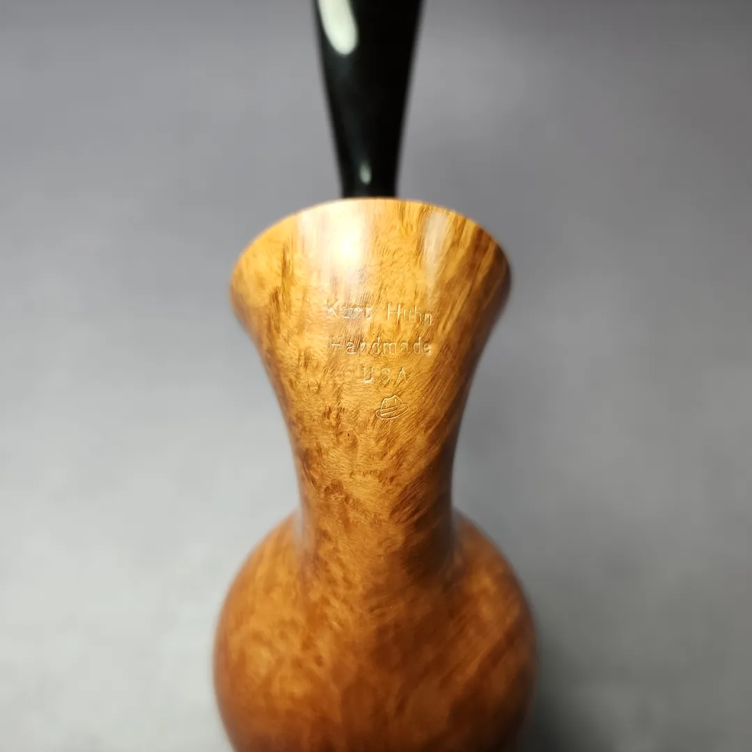 While seemingly inactive these days, Kurt Huhn was a very popular American artisan in the 2000s and 2010s. In fact, he was even chosen to make the Pipe of the Year for pioneering forum alt.smokers.pipes in 2007. This pipe of his is highly distinctive in form, though this was very typical for Huhn’s output. As a carver, he was faithful to the ethos of letting a shape emerge from the briar as per the briar’s wishes, rather than sticking to a predetermined plan. As a result, Huhn’s pipes were often out of the ordinary, even compared to his emerging American peers. In the case of this curious, cutty-ish, stacked bent egg, it almost looks like there’s a Japanese or German influence—though I’m sure Huhn would simply say he was doing what the briar wanted.