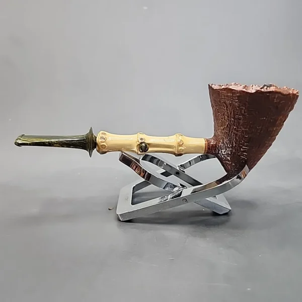 This la Biota actually reminds me of a few Danish pipe-makers, rather than Italian ones. And that’s not a bad thing at all, as the Danish pipe-makers it reminds me of are masters such as Viggo Nielsen. The combination of the plateau-rim, jagged axe bowl and bamboo shank reminds me of Nielsen’s similar fondness for such shapes and decorative elements. Anyway, what I mean is, it’s a very nice pipe, with good stylistic precedents, while also being very much its own thing. The camouflage-hued ebonite stem is a nice extra touch of color, and the sandblasting on the bowl is masterful in its ring grained execution. The pipe is also surprisingly lightweight – though la Biota pipes often are – at a mere 38 grams. It should clench quite comfortability.
