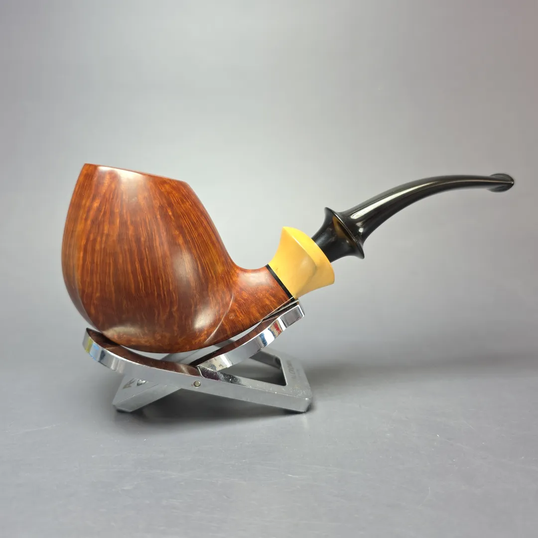 This would be an example of such a pipe, and it’s difficult to disagree with Skovgaard’s estimation of it. Leaning heavily into the classic Danish design genre of the bent egg, Skovgaard has nonetheless kept things fresh through his signature incorporation of elements from a variety of other shapes. In this instance, the pipe is something of a hybrid of an egg, a sphinx (note the slight “ridges” following down each side of the bowl and progressing to the shank end), and even a little of the fugu, through its “whiptail” boxwood shank end. All of this is a little difficult to notice, on the other hand, due what strikes as impossibly perfect straight grain running the entirety of the bowl’s sides, along with the hidden sea of bird’s-eye on the pipe’s base. Even compared to Skovgaard’s usual, world-renowned output, pipes like this one are something else—hence, the “Lion.”