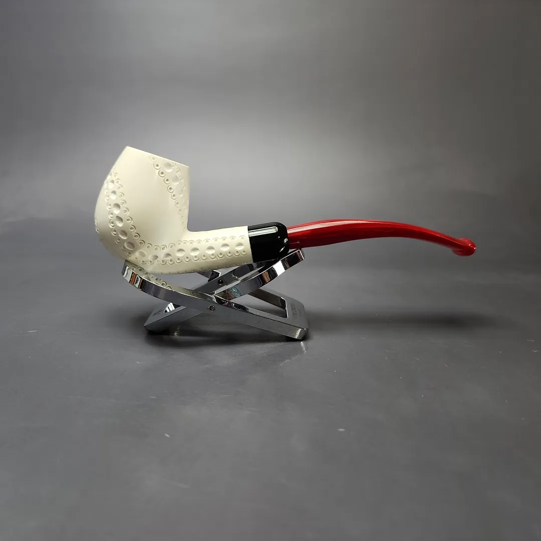 Lattice Carved Bent Billiard w/ Red Stem & Case Estate Block Meerschaum Pipe, Unsmoked