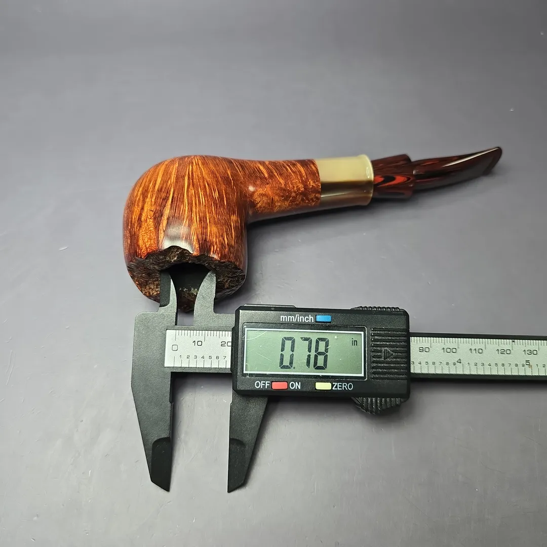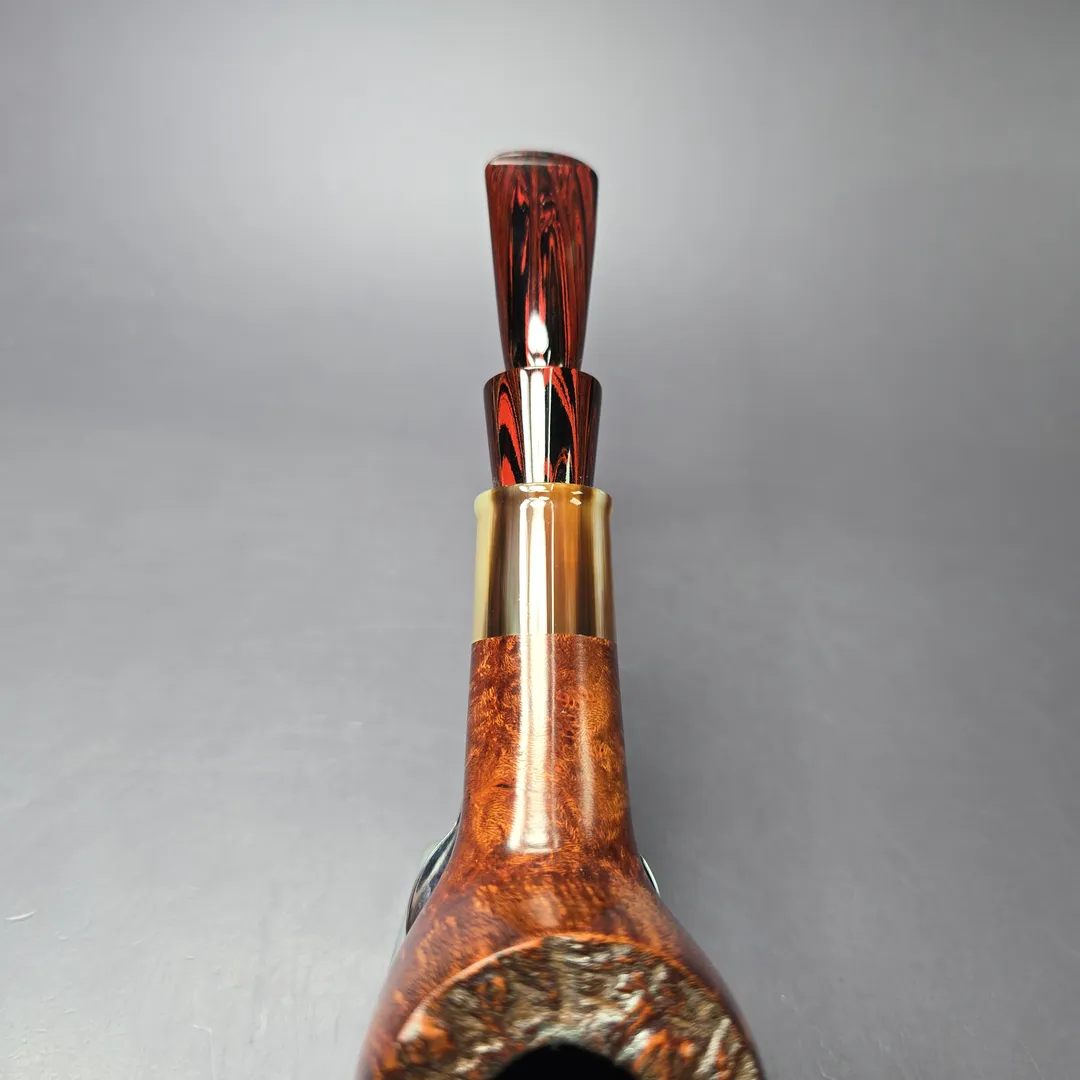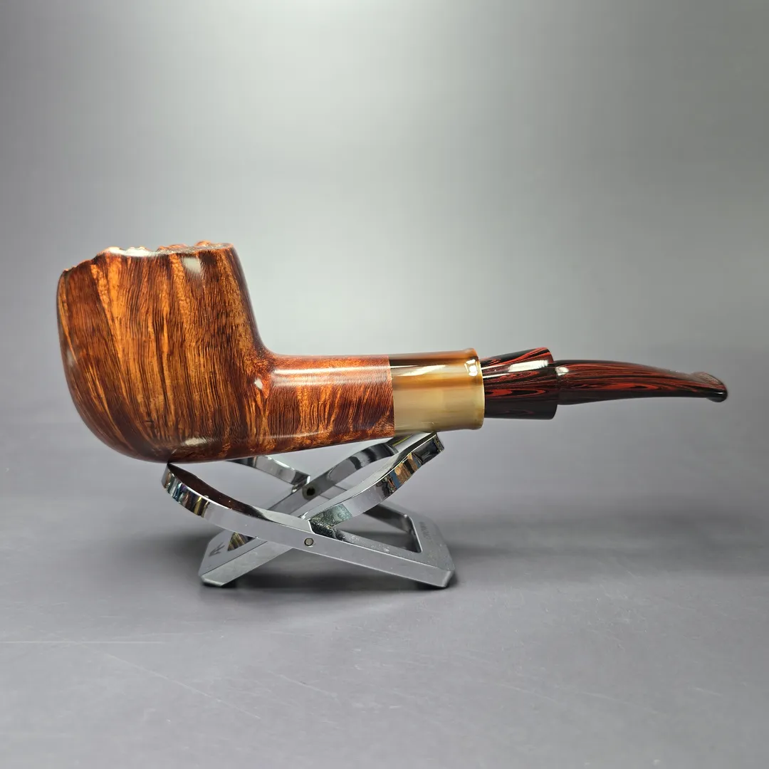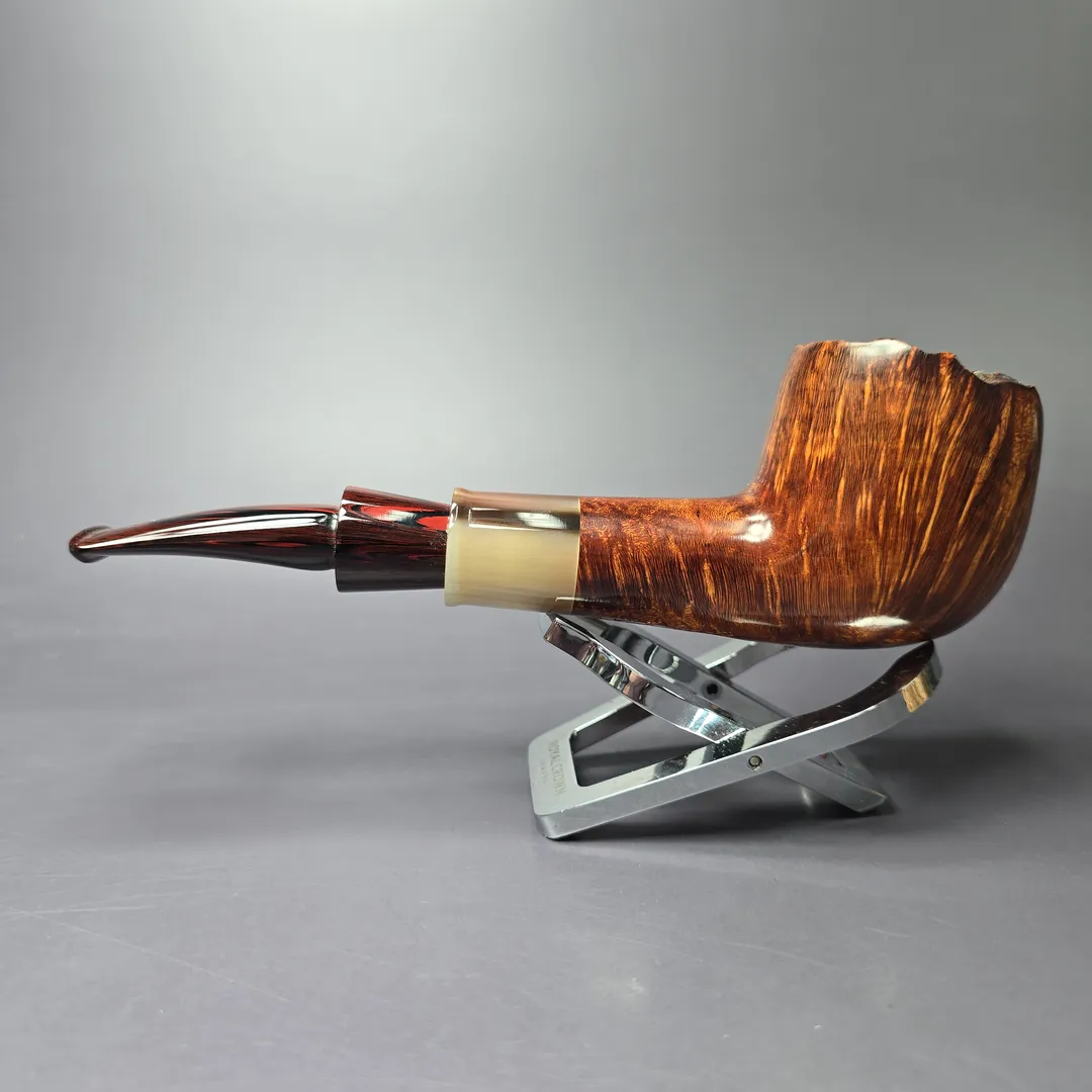 LCS Briars are made by English artisan Simon Bosko. Like his fellow Englishman Chris Kelly, of Eldritch Pipes, Bosko has been a regular fixture within the YouTube Pipe Community for nearly a decade, and indeed it was Bosko’s experiences within that community that first led him to take up pipe making. Specializing in freehand shapes, Bosko’s work is typically closer to Charatan or GBD when it comes to form, though with a signature aesthetic provided by way of accents and color palettes that are decidedly more contemporary. This one, for example, is a highly organic, freehand apple, with impressive, tight straight grain elevated by a deep, fiery contrast finish. The pipe’s horn ferrule and cumberland stem match the alternating hues of the bowl quite perfectly, resulting in a design that is both rugged and naturalistic, and cohesive and well-matched.