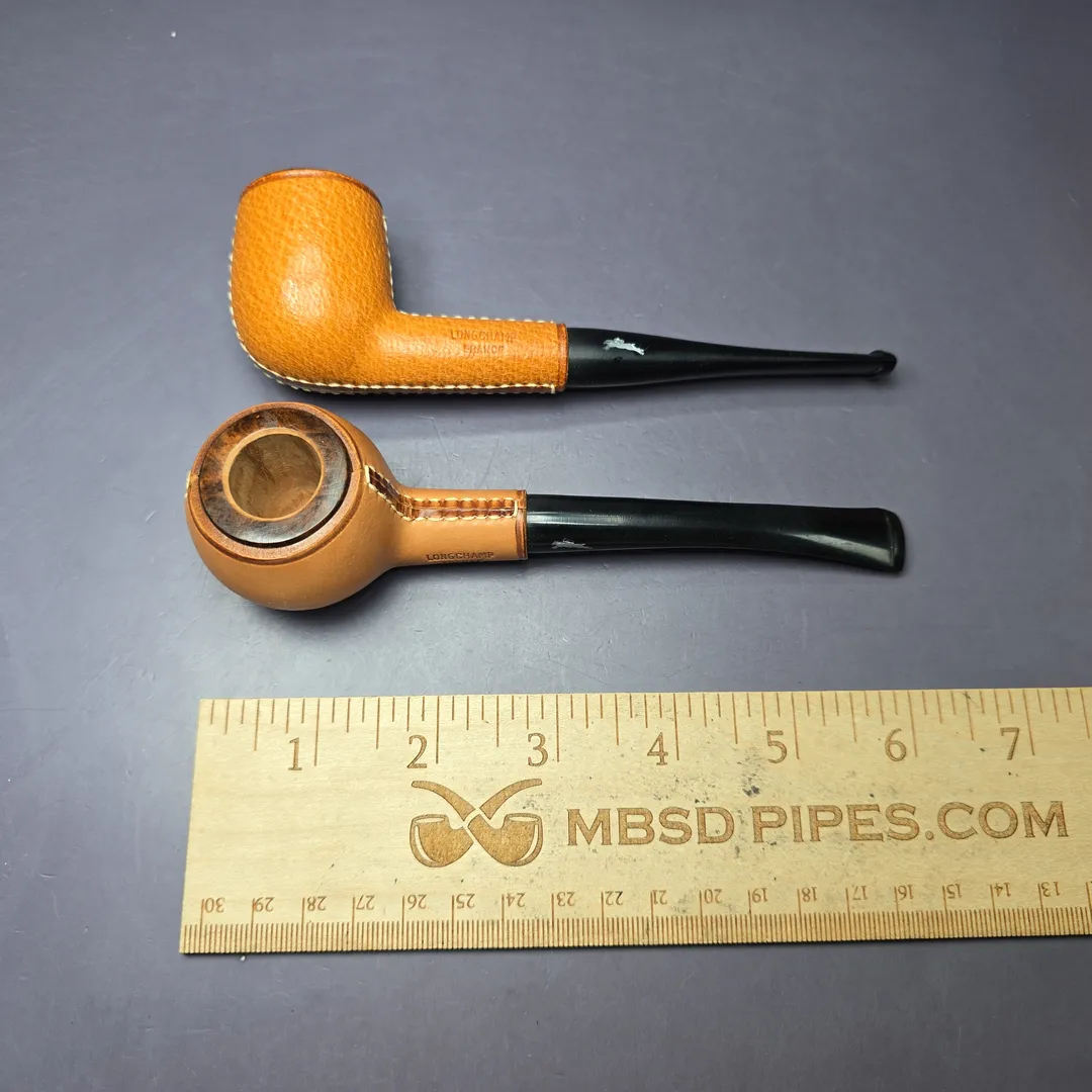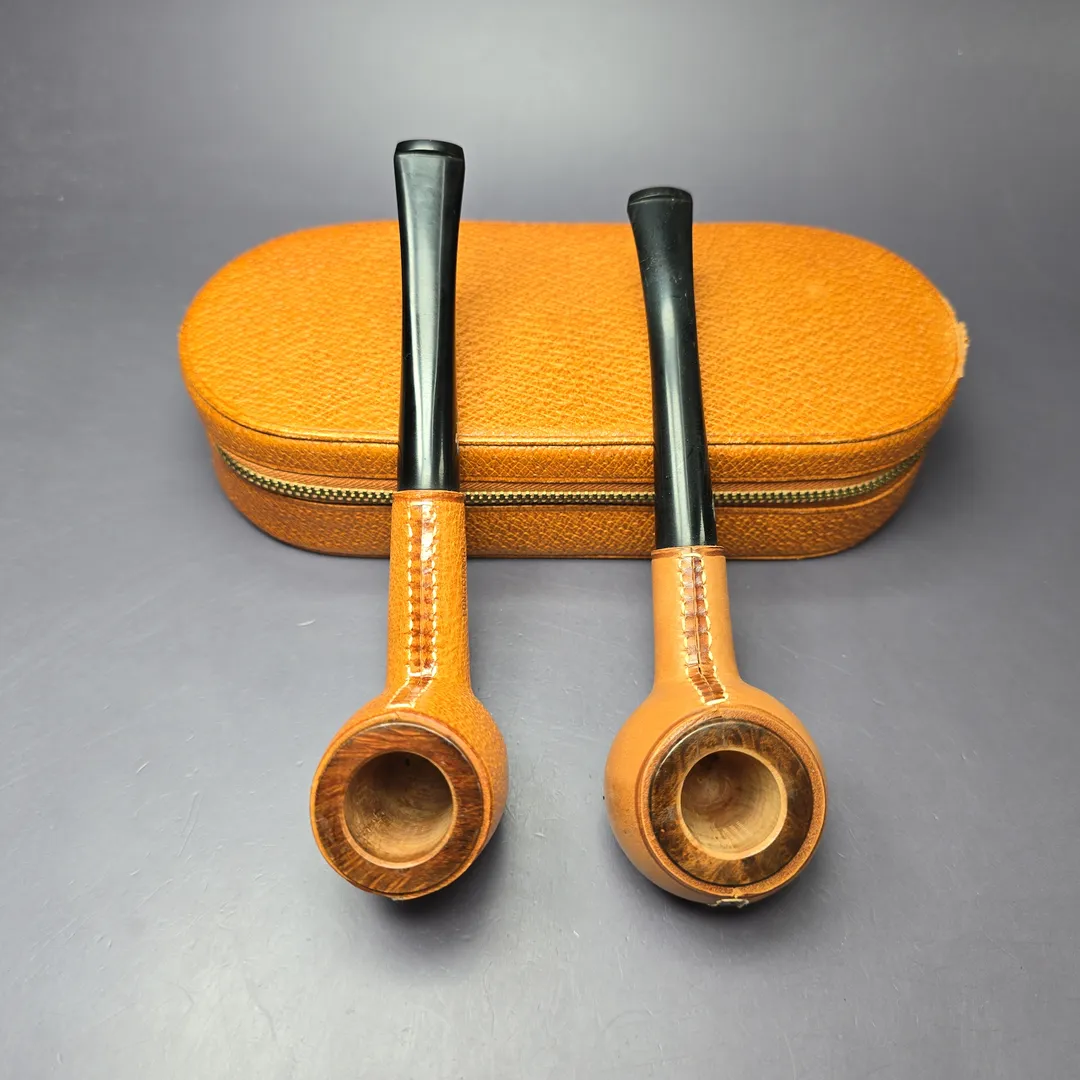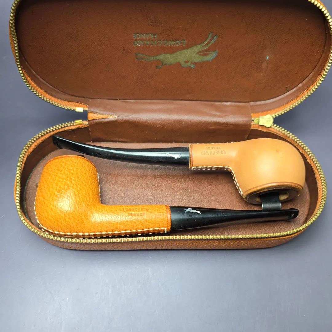 Longchamp Leather Wrapped Two Pipe Set w/ Case Estate Briar Pipes, Unsmoked