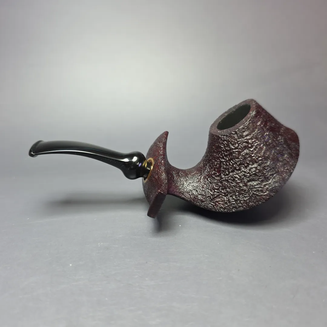 Here, for example, we have a rendition of one of Tieyuan’s favorite shapes, the volcano. Rather than the slightly blocky approach found in Anglo-French pipes, or the “boot” style seen in certain strands of Danish and Italian artisan craft, Tieyuan favors designs that are more dynamic and unpredictable. Like the renditions of Tokutomi or Gotoh, for example, one might say that Tieyuan’s volcanoes are not “dormant,” but very much “active,” capturing the movement by which the peaks and valleys of their namesake come into being.