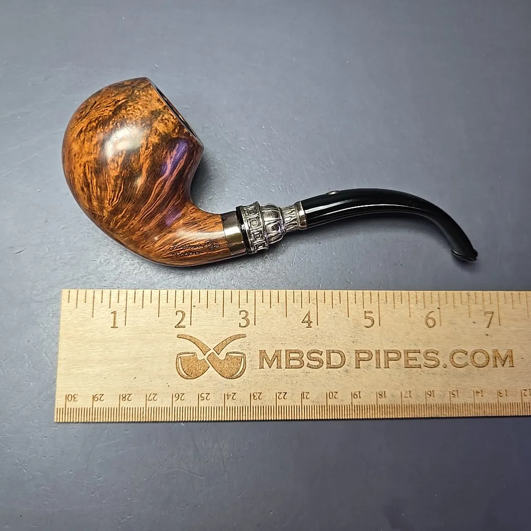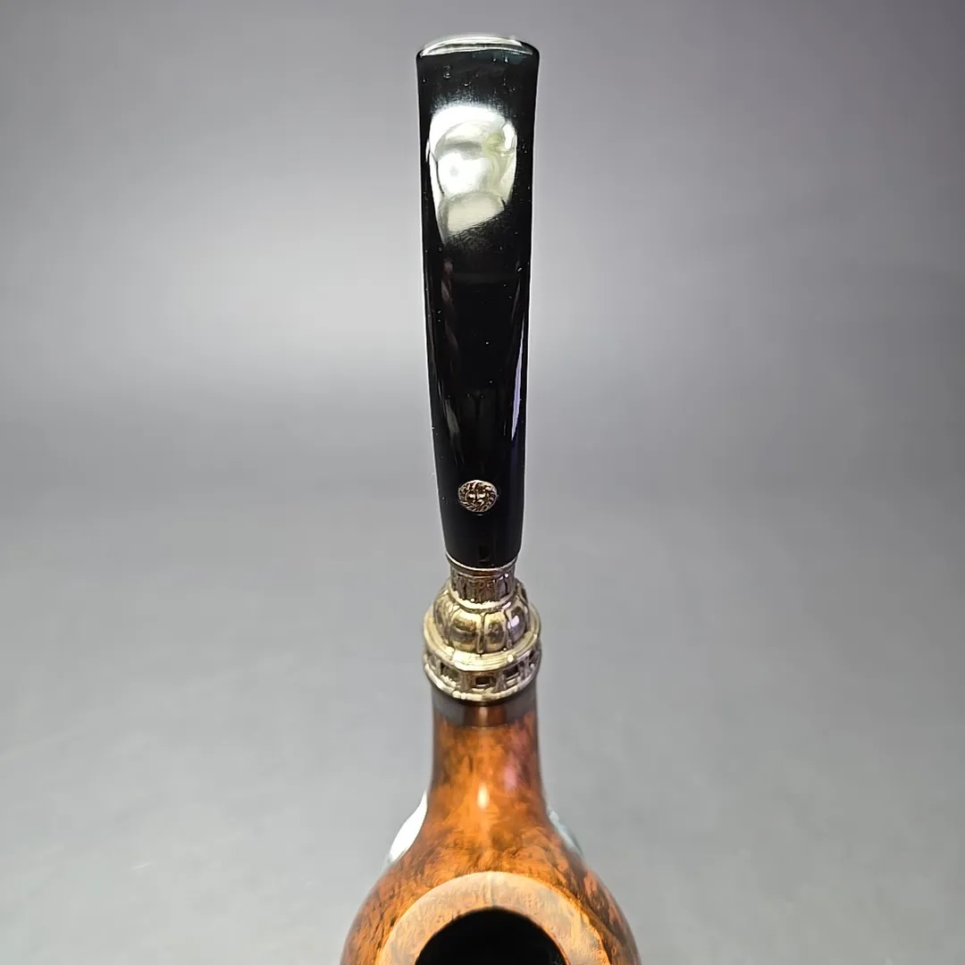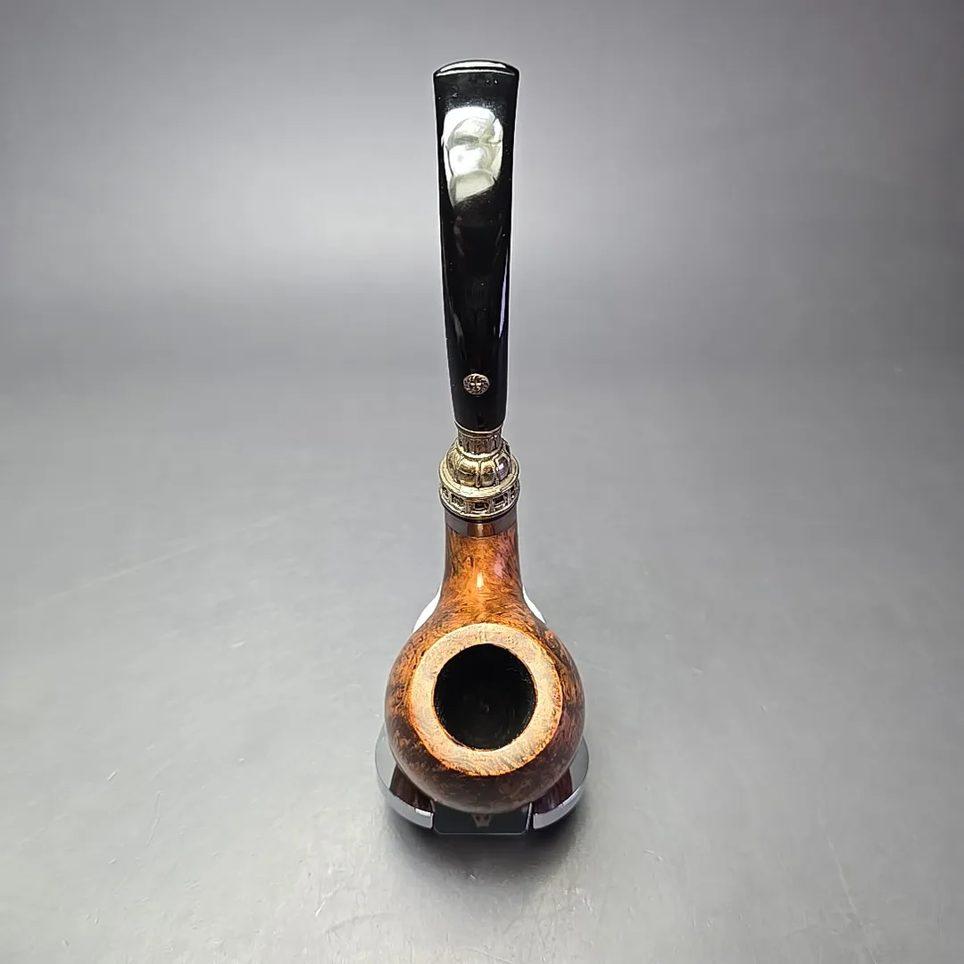 The Unica series showcases Mastro de Paja pipes that are a little out of the ordinary and, as such, these pipes are either limited edition, or entirely one of one. This one, for example, is a very unconventional, tall, full bent apple, with a curvature more reminiscent of an Oom Paul than most renditions of the former. On the other hand, arguably the most captivating thing about the design is not the shape, but the ornamentation. While early Mastro de Paja pipes did, on occasion, feature precious metal accents, such as sterling silverware, it would not be until later in the workshop’s history that such accoutrements became a focus (to an extent, similar can be said of another Pesaro school make, Ser Jacopo, created by several Mastro de Paja alumni). Having taken over the Mastro de Paja workshop in 1995, Montini has a wealth of experience with precious metals—sterling silver especially–and as a consequence, the pieces produced under his tenure have included some of the most intricate, often baroque mountings in all of Italian pipes. That’s certainly the case for this one, where it’s clear that no expense was spared.