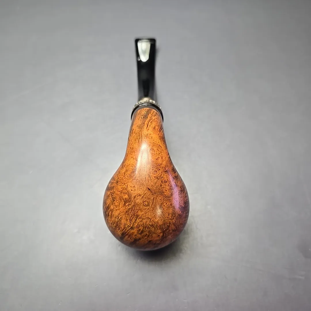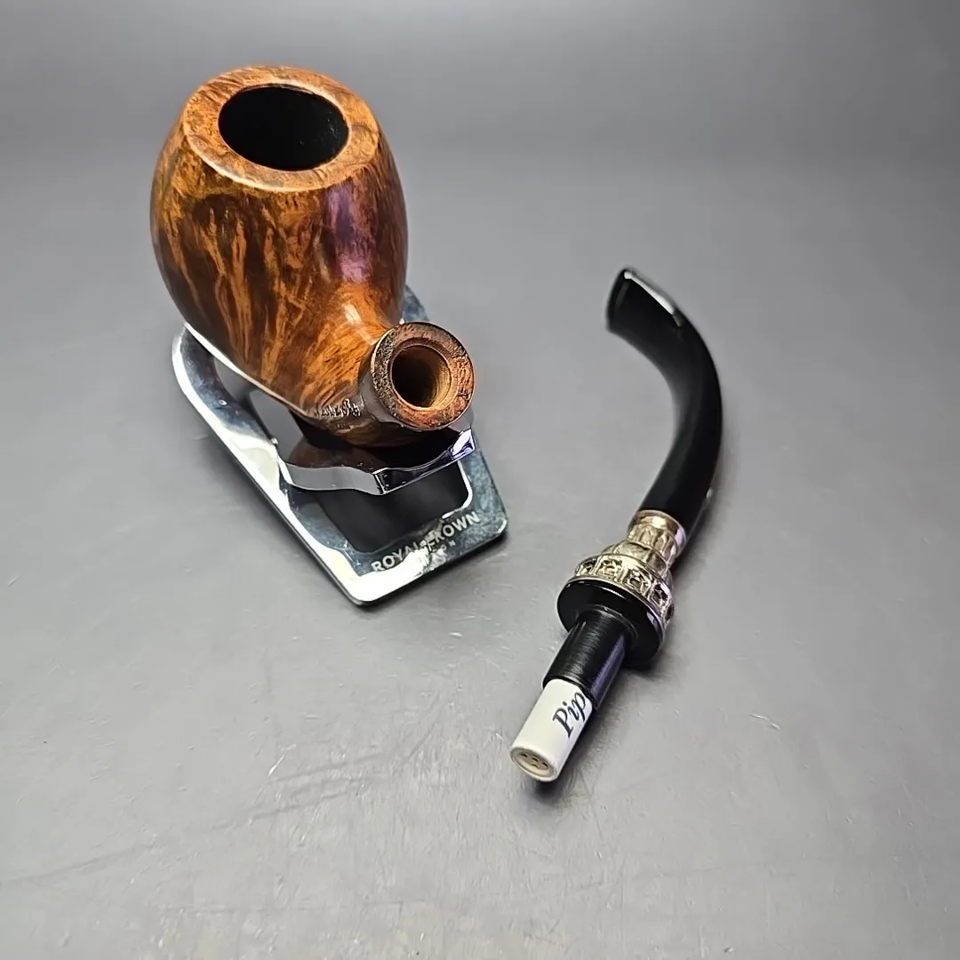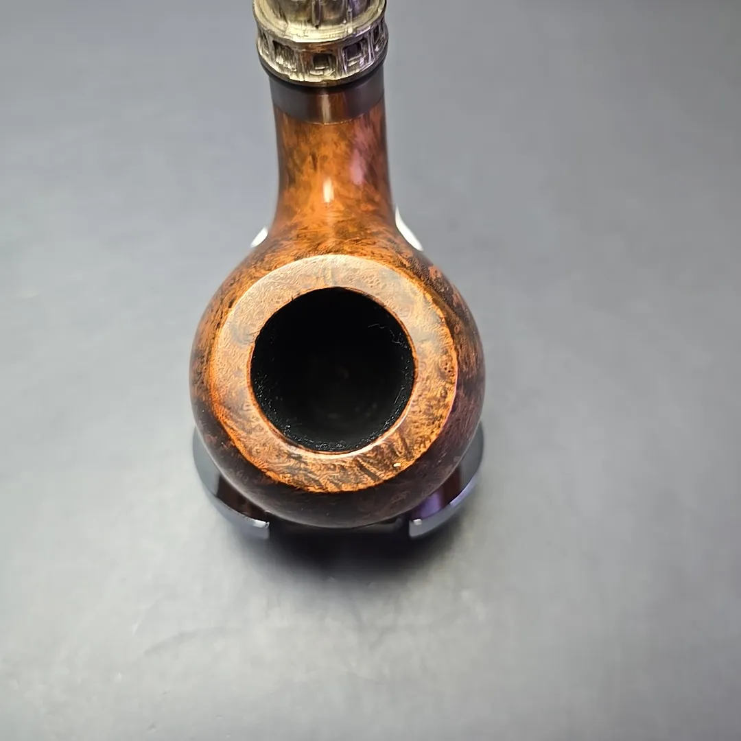 The Unica series showcases Mastro de Paja pipes that are a little out of the ordinary and, as such, these pipes are either limited edition, or entirely one of one. This one, for example, is a very unconventional, tall, full bent apple, with a curvature more reminiscent of an Oom Paul than most renditions of the former. On the other hand, arguably the most captivating thing about the design is not the shape, but the ornamentation. While early Mastro de Paja pipes did, on occasion, feature precious metal accents, such as sterling silverware, it would not be until later in the workshop’s history that such accoutrements became a focus (to an extent, similar can be said of another Pesaro school make, Ser Jacopo, created by several Mastro de Paja alumni). Having taken over the Mastro de Paja workshop in 1995, Montini has a wealth of experience with precious metals—sterling silver especially–and as a consequence, the pieces produced under his tenure have included some of the most intricate, often baroque mountings in all of Italian pipes. That’s certainly the case for this one, where it’s clear that no expense was spared.