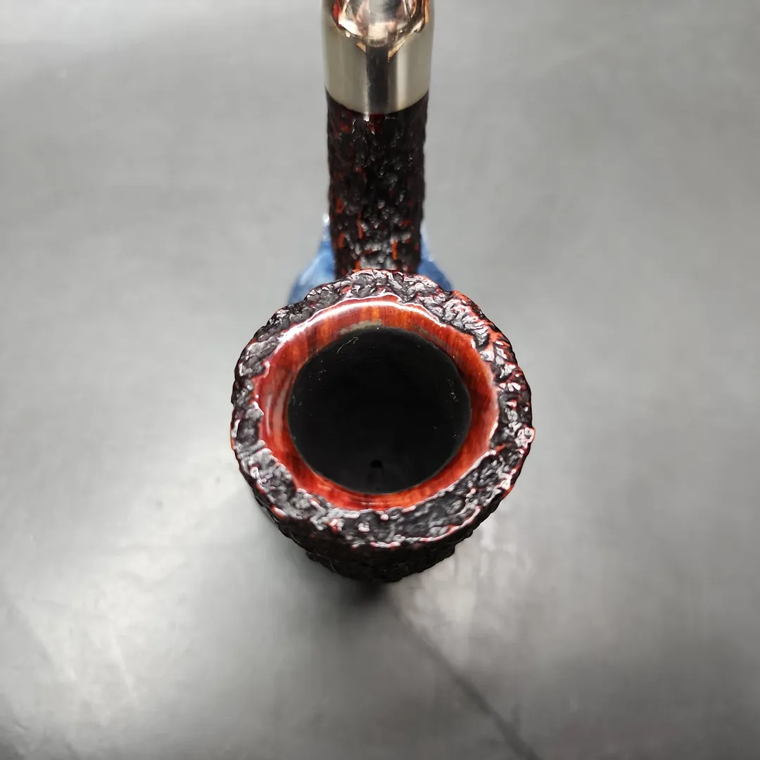 While very different from its classical designs, the “Calabash” is a recurrent motif in Mauro Armellini’s pipes. Being hand made, each is a little different, and some versions—like this one—appear to have used special drills to bore curved draft holes. It is a prominently Italian practice, with Ser Jacopo and Viprati also employing flexible drills to achieve otherwise impossible draft holes. Speaking of prominently Italian, this Calabash model shows off their own interpretation of the nation’s favorite pebble dash rustication, pairing it with a near-black stain and a silver army mount.
