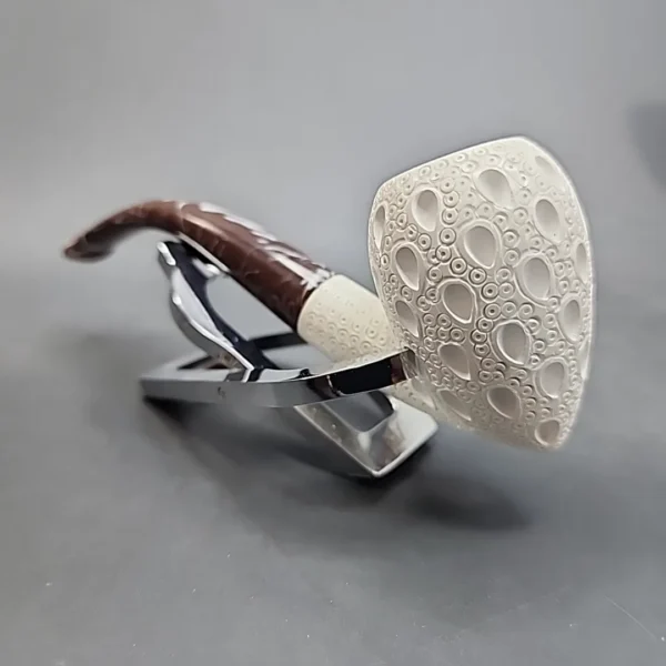 If you’re seeking a top-notch block meerschaum pipe that offers quality without breaking the bank, look no further! The size of a block meerschaum significantly influences its price. In contrast to the past, where the main cost of a meerschaum pipe was in the physical crafting, today, the expense is determined by the raw meerschaum. Smaller pipes come at a more affordable price, while larger pipes command a higher cost. This is our mid-range meer that sports a good size chamber! Each pipe comes with a handmade fitted case for safe keeping.