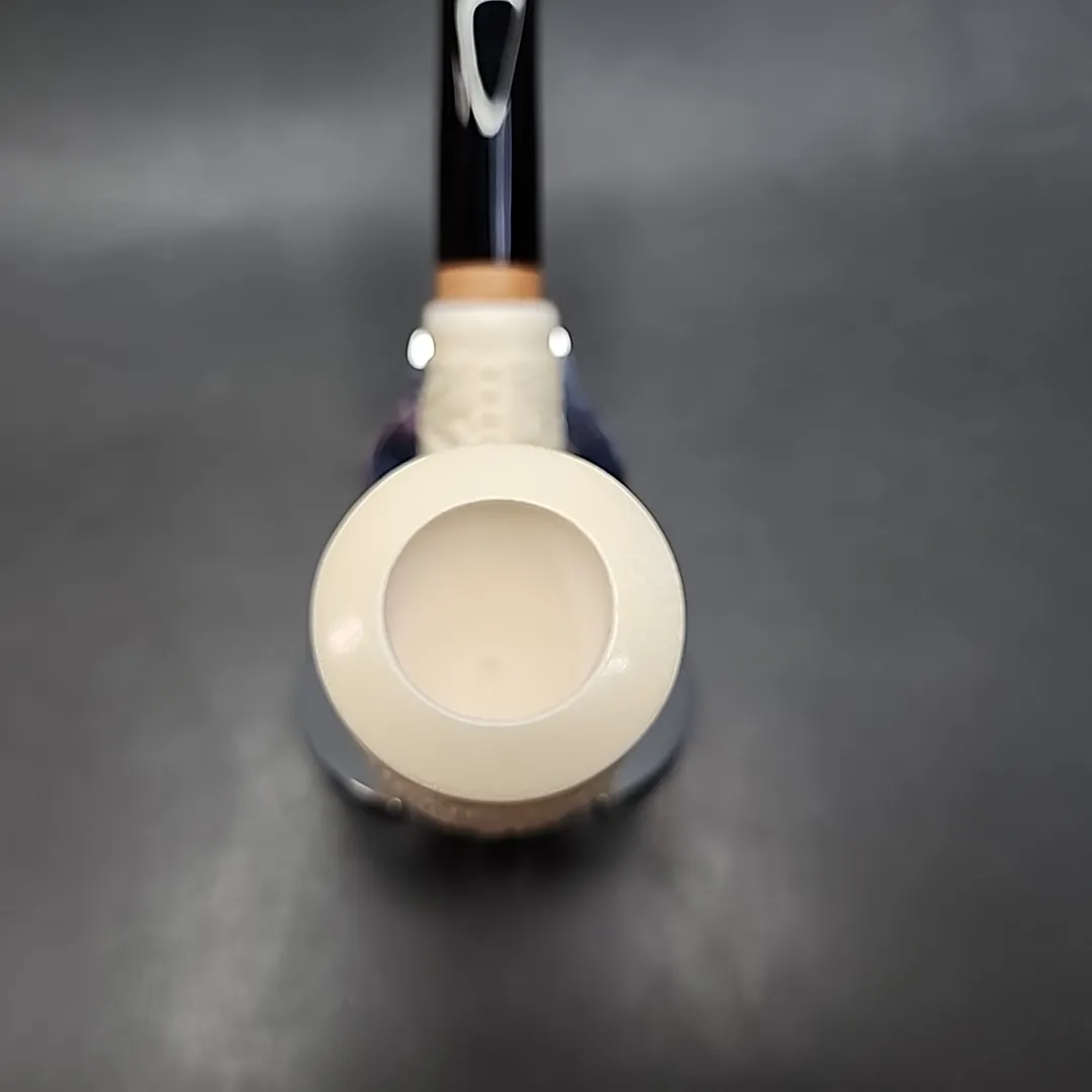 The design of this meerschaum has a bit of a story to it. For brevity’s sake: I was workshopping with my Danish pipe superfan colleague regarding what shapes our Deluxe meerschaums should come in. He said, “are you familiar with the Pipe Dan (or Pibe-Dan) chimney shape?” I said “yes,” as it is a pretty famous shape, but I had my reservations as to what that might look like with a smooth polished meerschaum bowl. My colleague then pointed to a particularly interesting, Dan-shape-esque Wengholt (Preben Holm) we had in that had been rusticated, and said, “what about something like this, but with ornate Turkish latticework instead?” Anyway, this is what came out of those conversations. And yeah, wow, that’s nice, and really unique for a meer. As a side note, it’s also incredibly lightweight, and the pipe’s stack/chimney bowl will make it an extraordinary smoker for flake cuts.