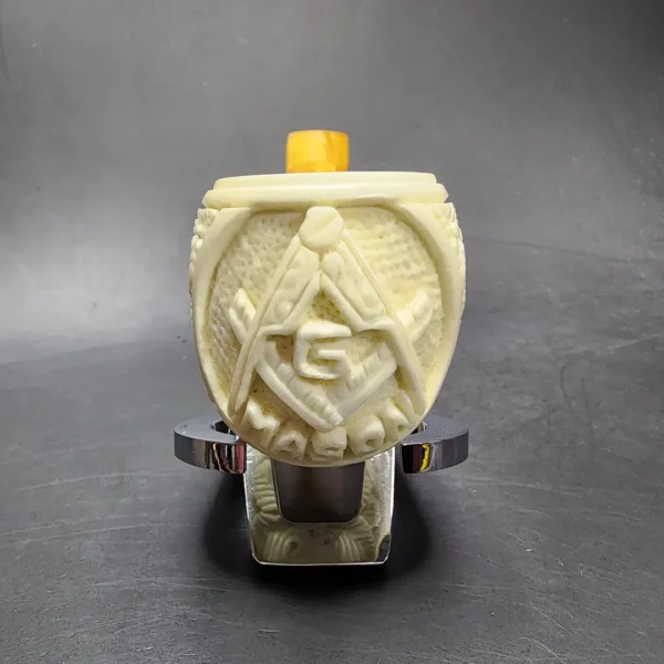 Though I’m not part of the brotherhood myself, I have had requests for some of our Deluxe meers to carry Freemason iconography, to which I’m happy to oblige. In a way, it’s quite fitting for a meerschaum pipe to be carried by a member of an ancient order of what were originally stone cutters, and this one is a worthy piece, I’d say. As with all of our carved meerschaums, it features wonderful Turkish artistry in its composition, with the key difference being the addition of architectural motifs and, of course, the Masons’ Square and Compasses.
