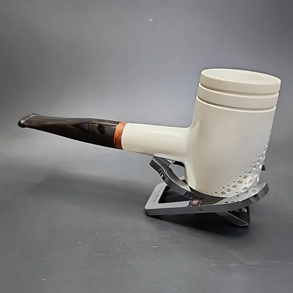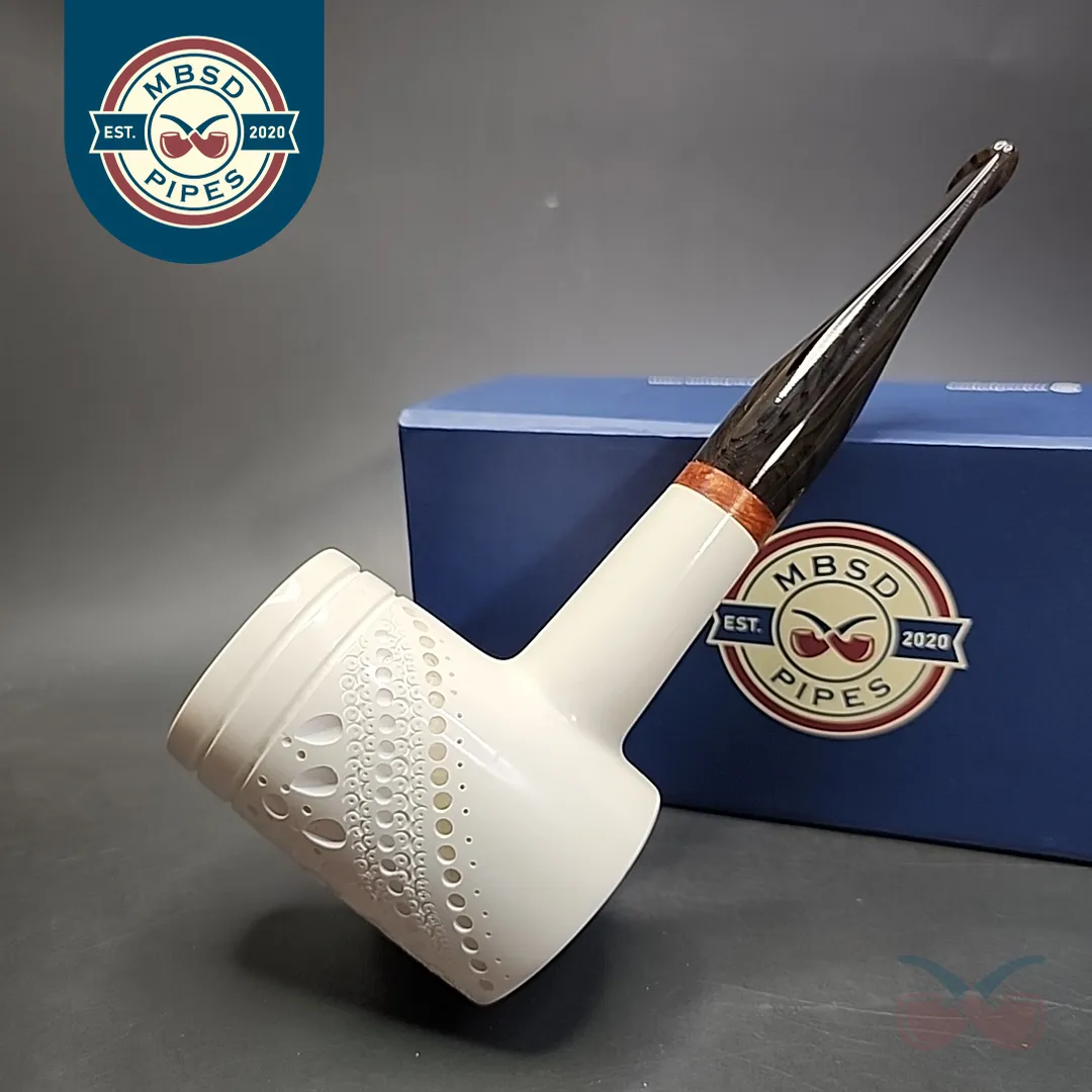 At MBSD we sell a lot of high-grade, high-quality pipes from various iconic makes, but the pipes we’re most proud of are our meerschaums. Right from the beginning, we wanted to offer the best smoking meers on the market, and to do this, we had them made with two distinct features. First, we made sure that they were made with block meerschaum that was carefully selected to be the most lightweight, pure, and porous available, meaning it would also color more quickly and evenly as it is smoked. Second, for our Deluxe meerschaums, we had the pipes made with a patented Briar-Mortise system that is closer to the stem connection on a briar pipe than a standard meerschaum. This is because, on our Deluxe models, the mortise is made from briar itself, while the tenons used are made from Delrin. This allows for more precision construction of the pipe’s draft hole, as well as a general extra durability and longevity.